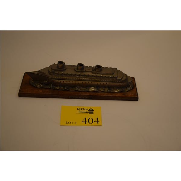 NORMANDIE: CHROME WHAT-NOT-BOX  IN THE FORM OF THE NORMANDIE RIDING ON CHROME WAVES & ON A WOODEN BA404 - NORMANDIE: CHROME WHAT-NOT-BOX IN THE FORM OF THE NORMANDIE RIDING ON CHROME WAVES & ON A WOODEN BA