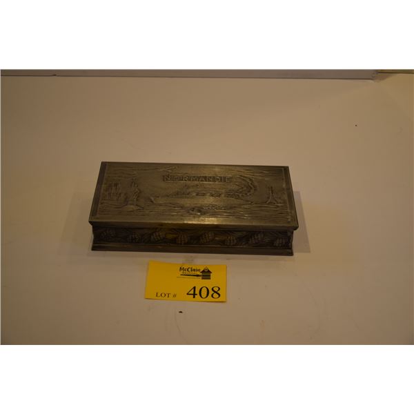 NORMANDIE: TIN BOX-NORMANDIE SAILING BETWEEN STATUE OF LIBERTY & THE EIFFEL TOWER (11" X 5 1/4")408 - NORMANDIE: TIN BOX-NORMANDIE SAILING BETWEEN STATUE OF LIBERTY & THE EIFFEL TOWER (11" X 5 1/4")