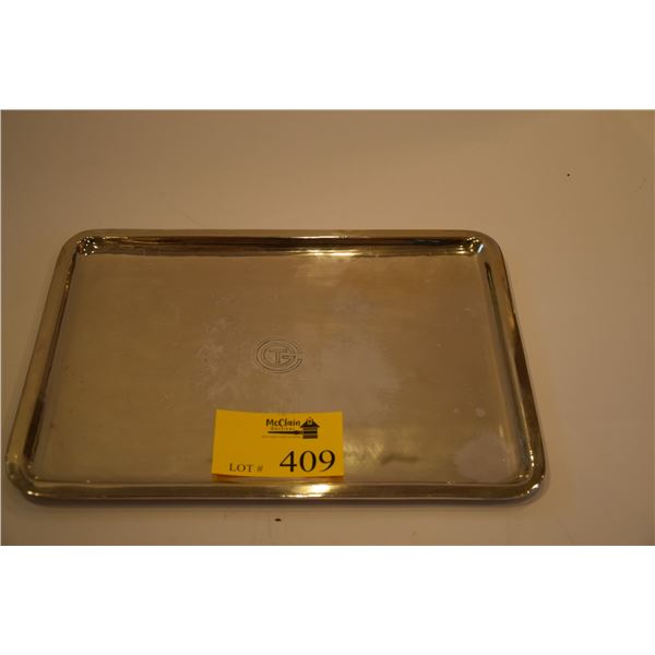 NORMANDIE: SILVER PLATED TRAY BY CHRISTOFLE W/LARGE HOUSE LOGO IN THE CENTER (FEW SMALL DENTS) (16 1/2" X 12 1/2" X 1/2")