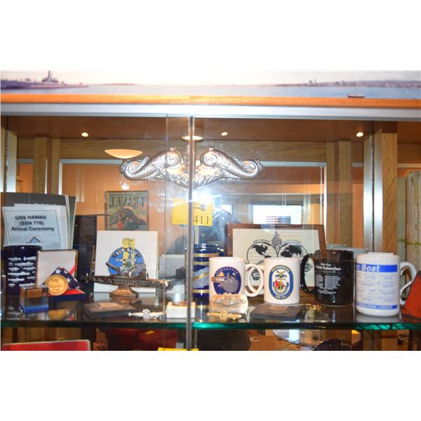 COLLECTION OF SUBMARINE MEMORABILIA: CUPS, PLAQUES, TIE TACS, BELT BUCKLES KEYCHAIN, ETC. (24 PCS)411 - COLLECTION OF SUBMARINE MEMORABILIA: CUPS, PLAQUES, TIE TACS, BELT BUCKLES KEYCHAIN, ETC. (24 PCS)