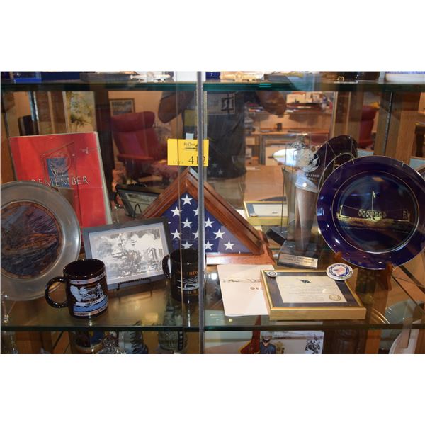 ARIZONA MEMORAL MEMORABILIA: SHADOW BOX FRAMED FLAG, PLATES, MUGS, STATUARY, POST CARDS, ETC. (9 PCS412 - ARIZONA MEMORAL MEMORABILIA: SHADOW BOX FRAMED FLAG, PLATES, MUGS, STATUARY, POST CARDS, ETC. (9 PCS
