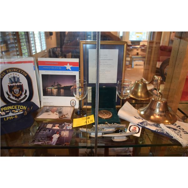 COLLECTION OF COLLECTIBLE ITEMS FROM THE USS PRINCETON: FRAMED PRINT, BRASS BELL, HAT, STEMWARE, MED418 - COLLECTION OF COLLECTIBLE ITEMS FROM THE USS PRINCETON: FRAMED PRINT, BRASS BELL, HAT, STEMWARE, MED