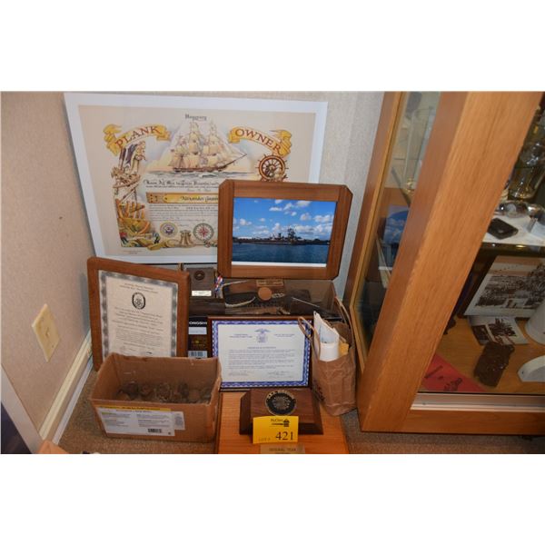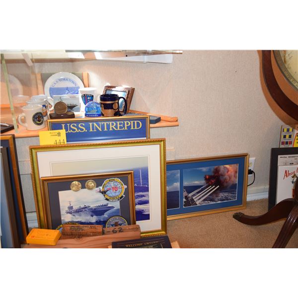 MIXED LOT: ASSORTED SHIPS, MUGS & GLASSES (USS IOWA, USS NEW JERSEY, USS MISSOURI, USS WISCONSIN), MEDALLIANS, FRAMED PRINTS, ETC. (18 PCS)