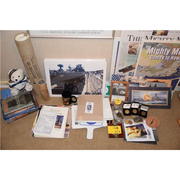 LARGE MIXED LOT: MIGHTY MO COLLECTIBLES, COASTERS, BOOKS, KEY CHAINS, PICTURES, BELT BUCKLE, POSTERS, 21 GUN SALUTE (SHELL) CUP, MEDALLIONS, ETC.