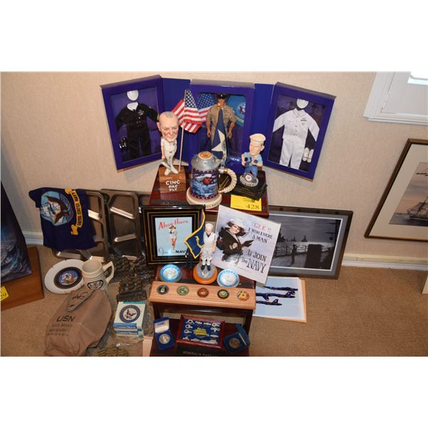 LARGE MIXED LOT US NAVY MEMORABILIA & COLLECTIBLES: DINING TRAYS, GAS MASK, STEINS, PAPER WEIGHTS, BOOKENDS, PLATES, TRIVETS, DOLL & BOBBLE ...