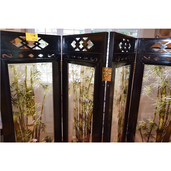 4 PANEL HAND EMBROIDERY ON SILK SCREEN, TITLED "SPIRIT OF BAMBOO HEDGE", W/BLACK LACQUER FRAME, EACH434 - 4 PANEL HAND EMBROIDERY ON SILK SCREEN, TITLED "SPIRIT OF BAMBOO HEDGE", W/BLACK LACQUER FRAME, EACH