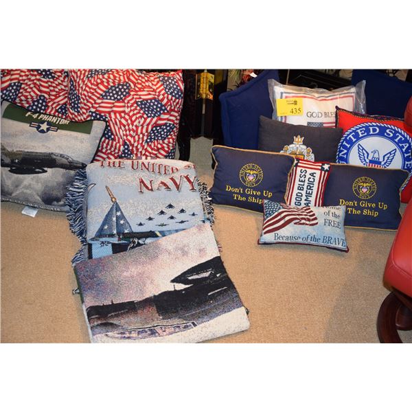 COLLECTION OF PILLOW & BLANKETS, EACH WITH MILITARY LOGOS OR SLOGANS (16 PCS)435 - COLLECTION OF PILLOW & BLANKETS, EACH WITH MILITARY LOGOS OR SLOGANS (16 PCS)