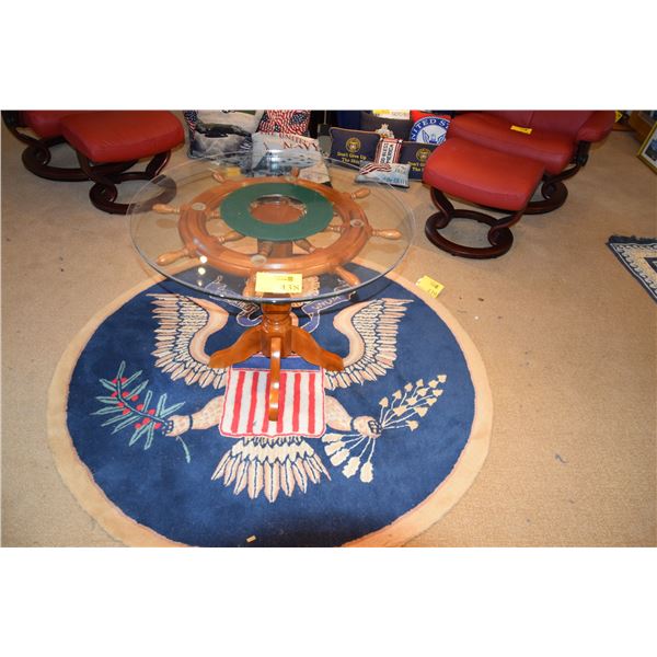 ROUND GLASS TOP TABLE W/SHIPS WHEEL BASE & PLEXIGLASS LAZY SUSAN