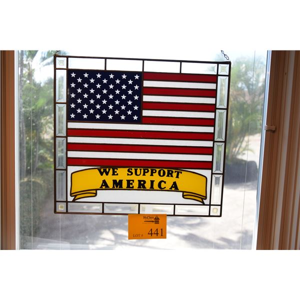 HANGING LEADED GLASS, "FLAG-WE SUPPORT AMERICA" (17 1/2" X 16")441 - HANGING LEADED GLASS, "FLAG-WE SUPPORT AMERICA" (17 1/2" X 16")