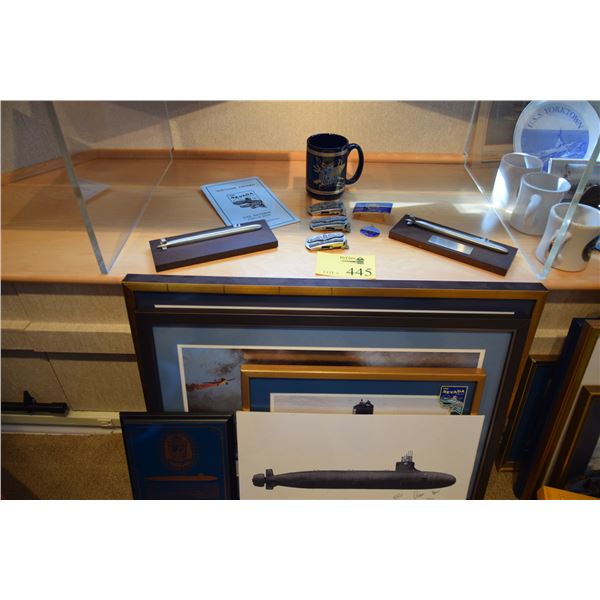 COLLECTION OF ITEMS FROM USS BOWFIN: FRAMED PRINTS, PLATES, MUG, MAGNETS & ACTUAL PIECES OF THE BOWFIN ITSELF