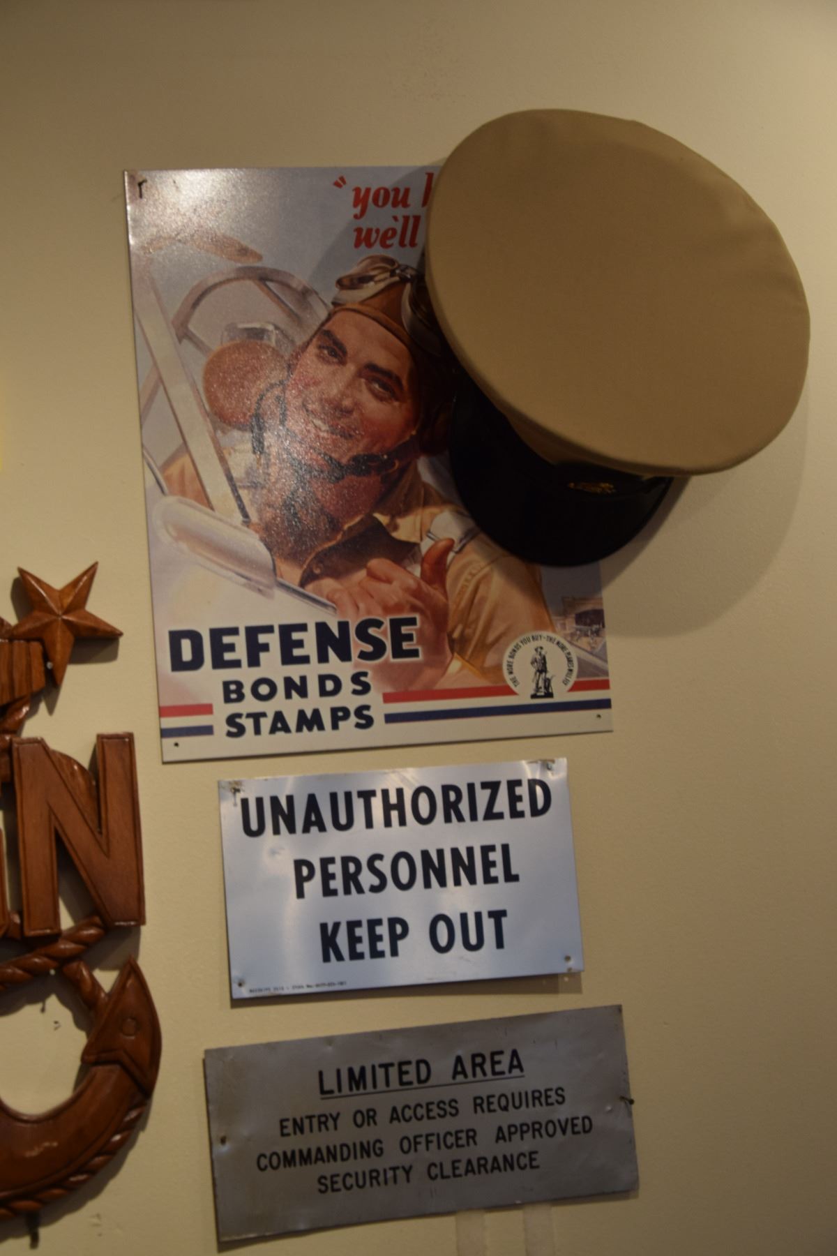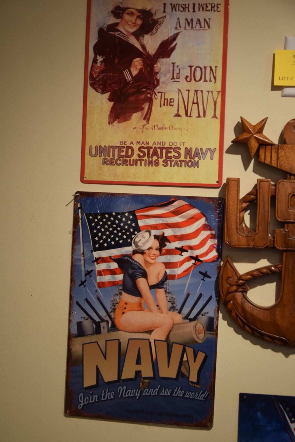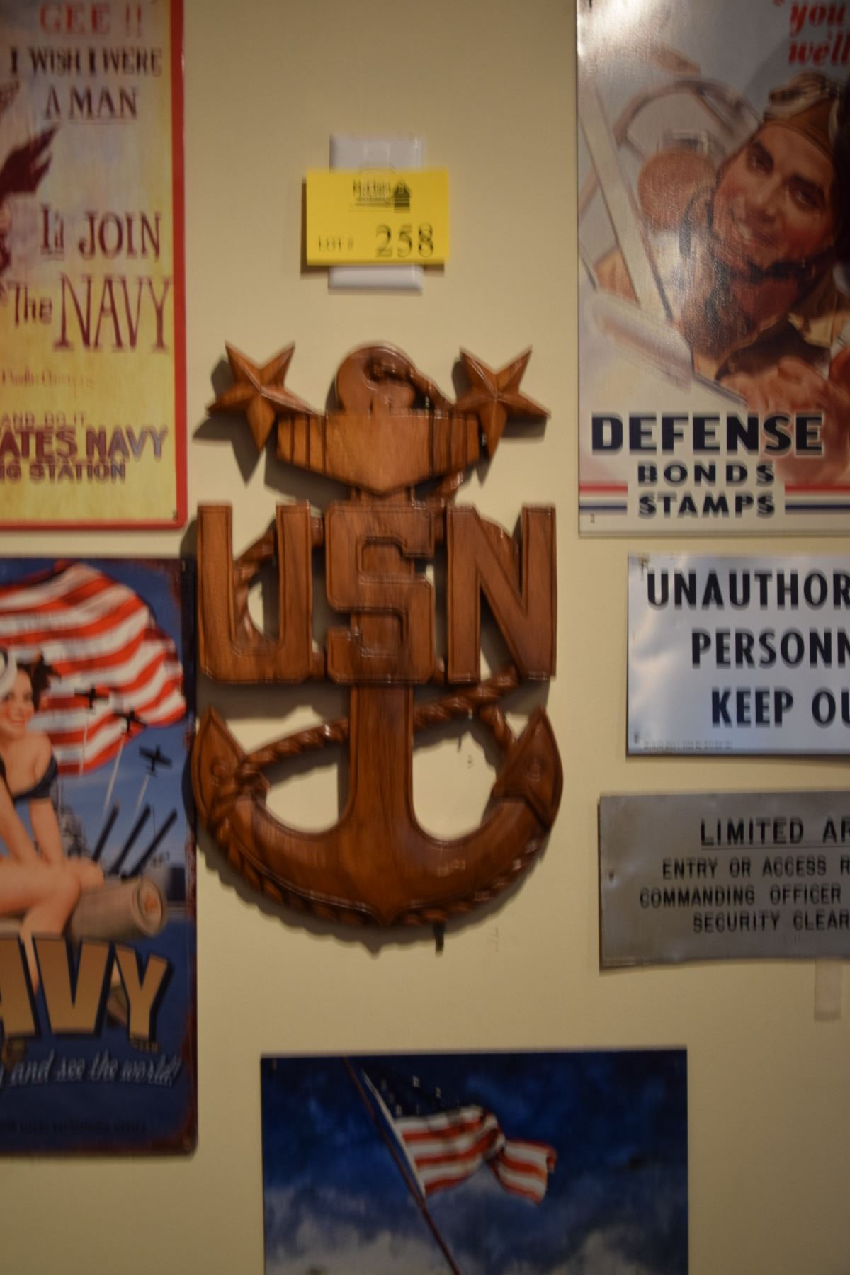 U.S. NAVY COLLECTIBLES: WALL PLAQUES, WALL CARVING, CHIEF'S HAT, PODIUM, BOOK (10 PCS)