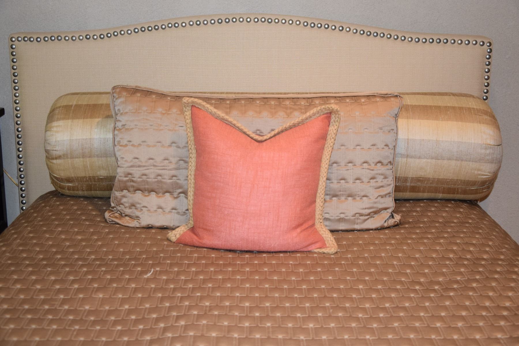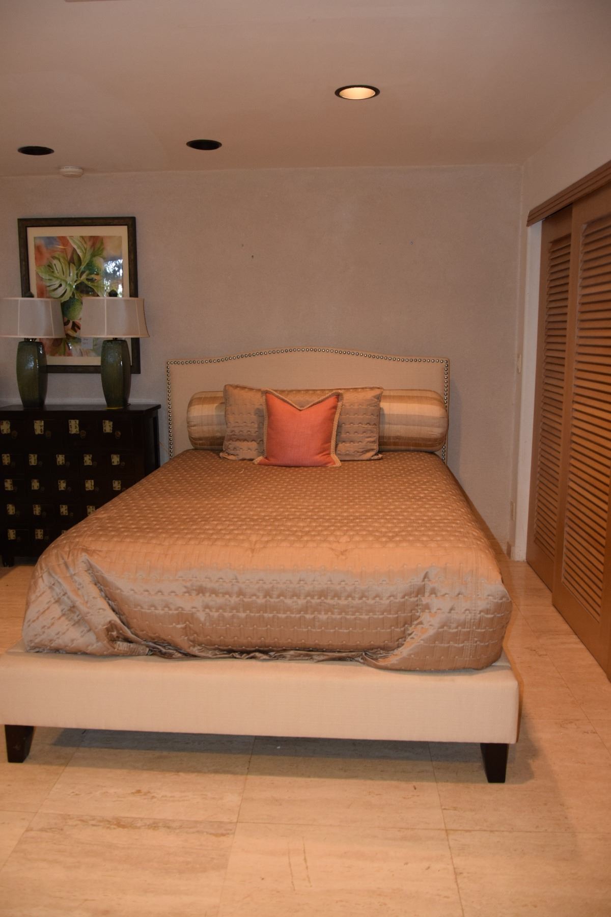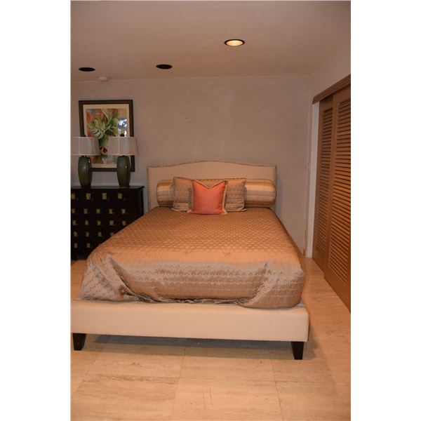 UPHOLSTERED QUEEN SIZE BED FRAME W/BEAUTYREST RECHARGE (LIKE NEW) MATTRESS, QUILT & PILLOWS