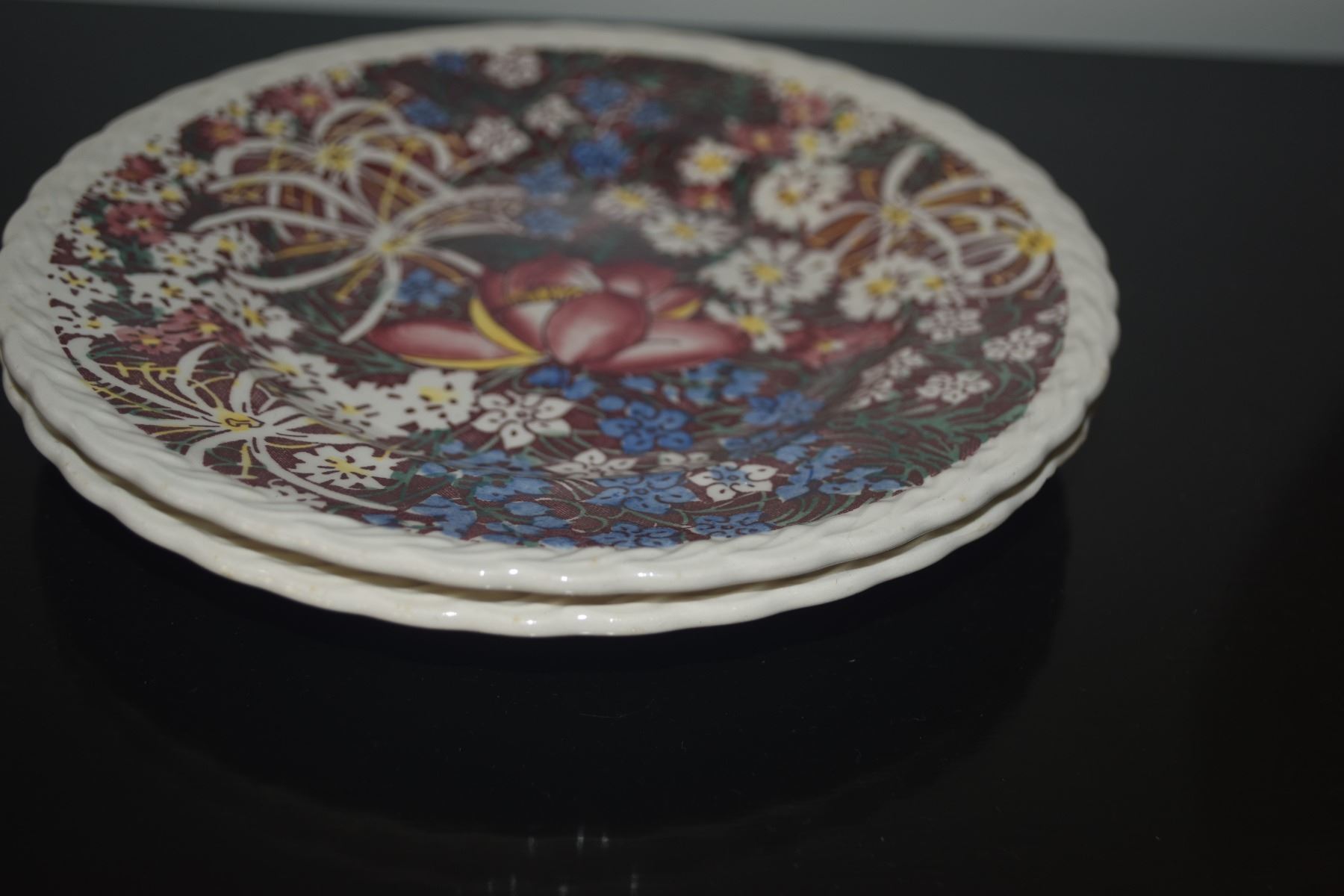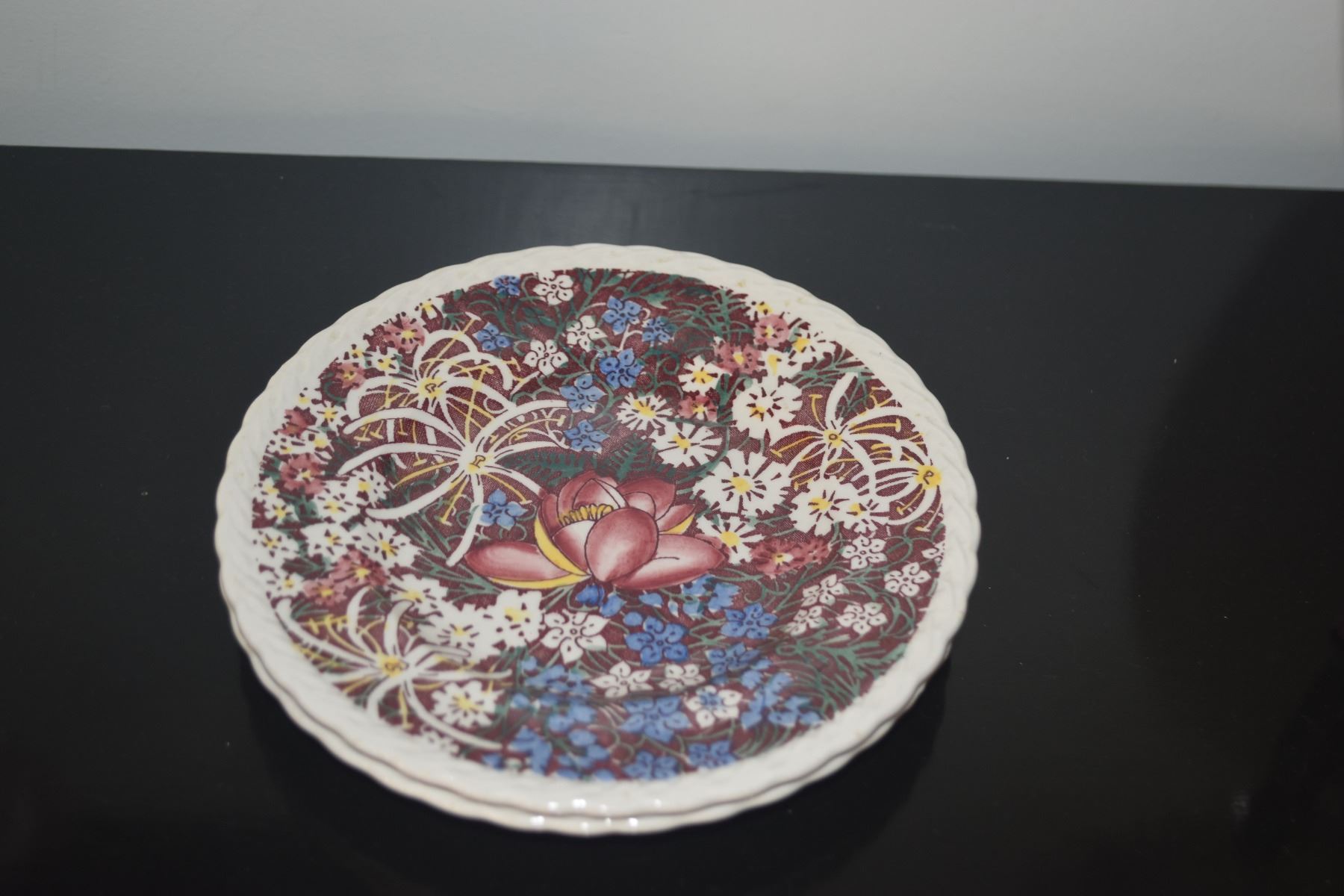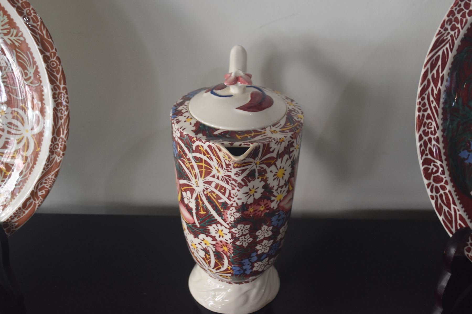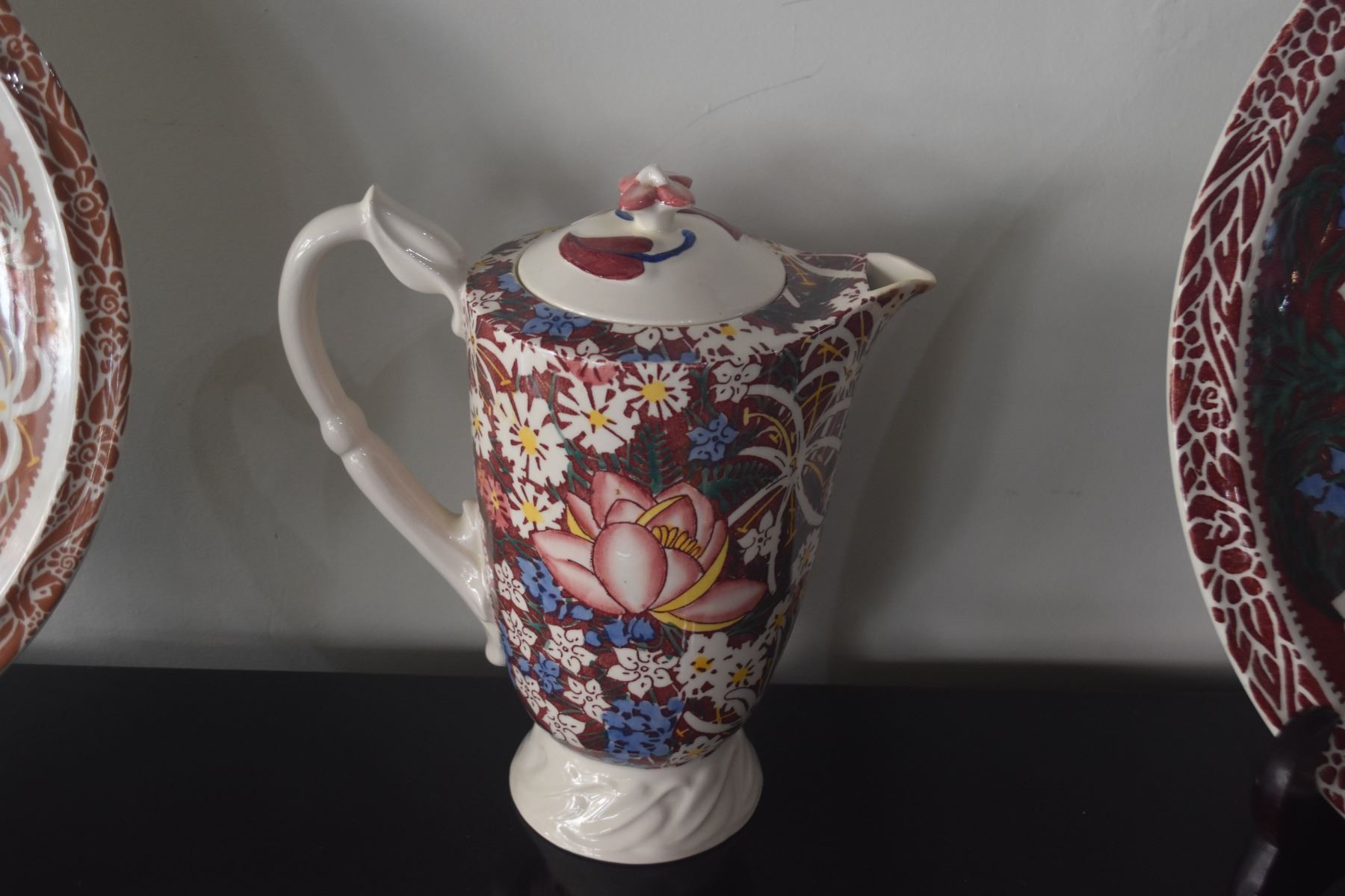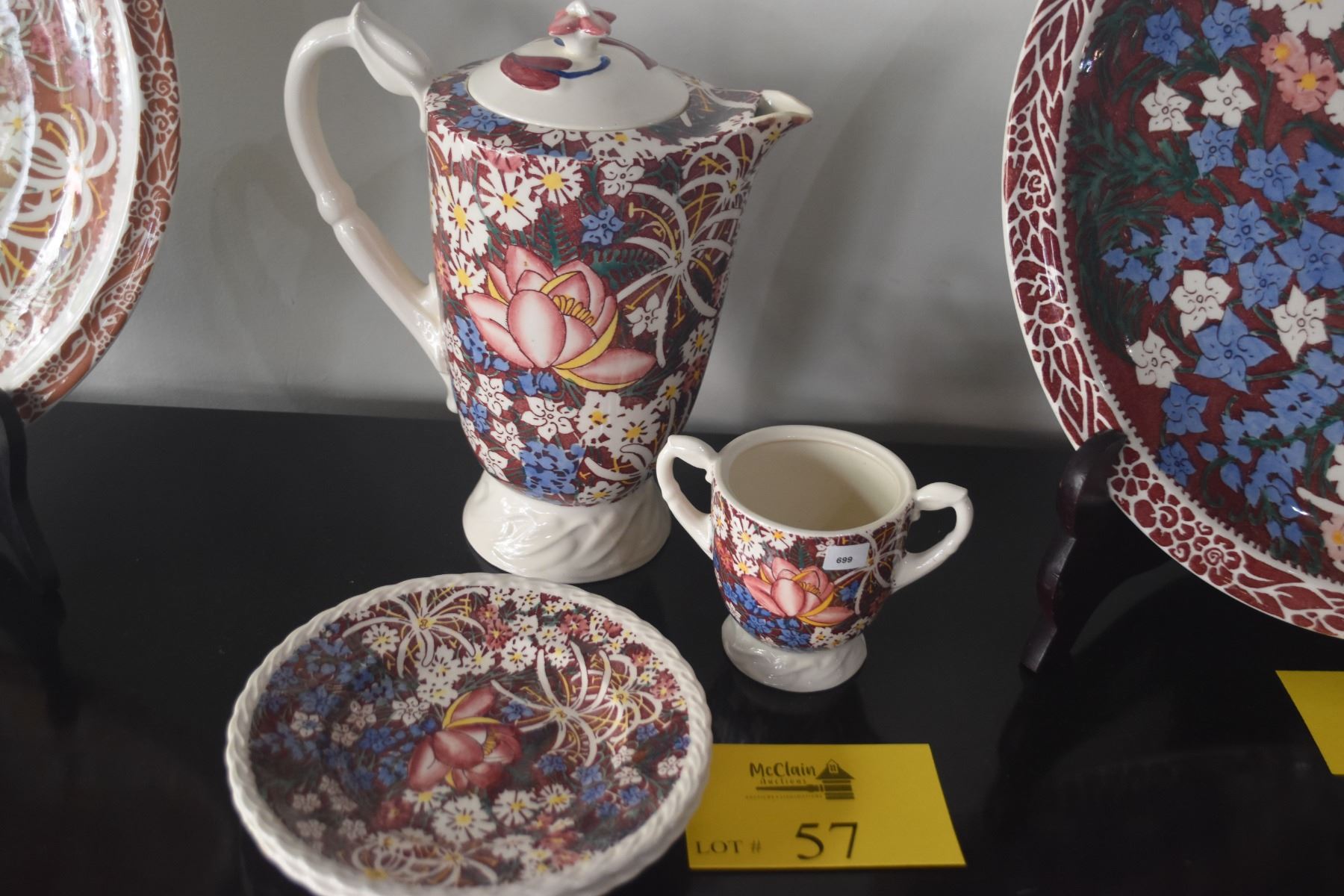 VERNON KILNS DON BLANDING "HAWAII" PATTERN 10 3/4" COFFEE POT, 7 1/2" PLATES & SUGAR BOWL (LEI LANI IN THE MILINDA SHAPE) (4 PCS)