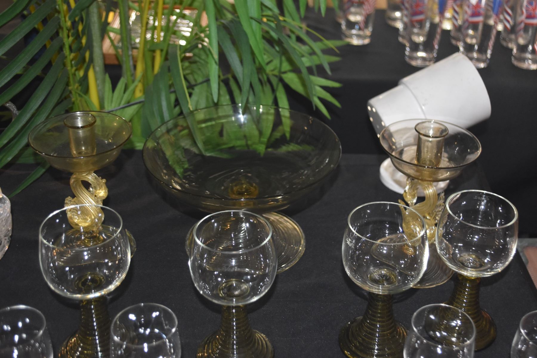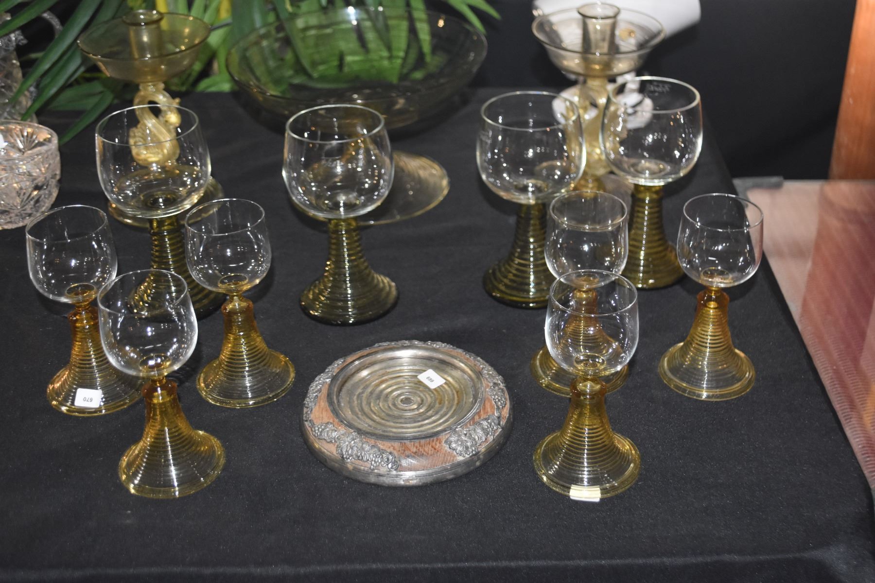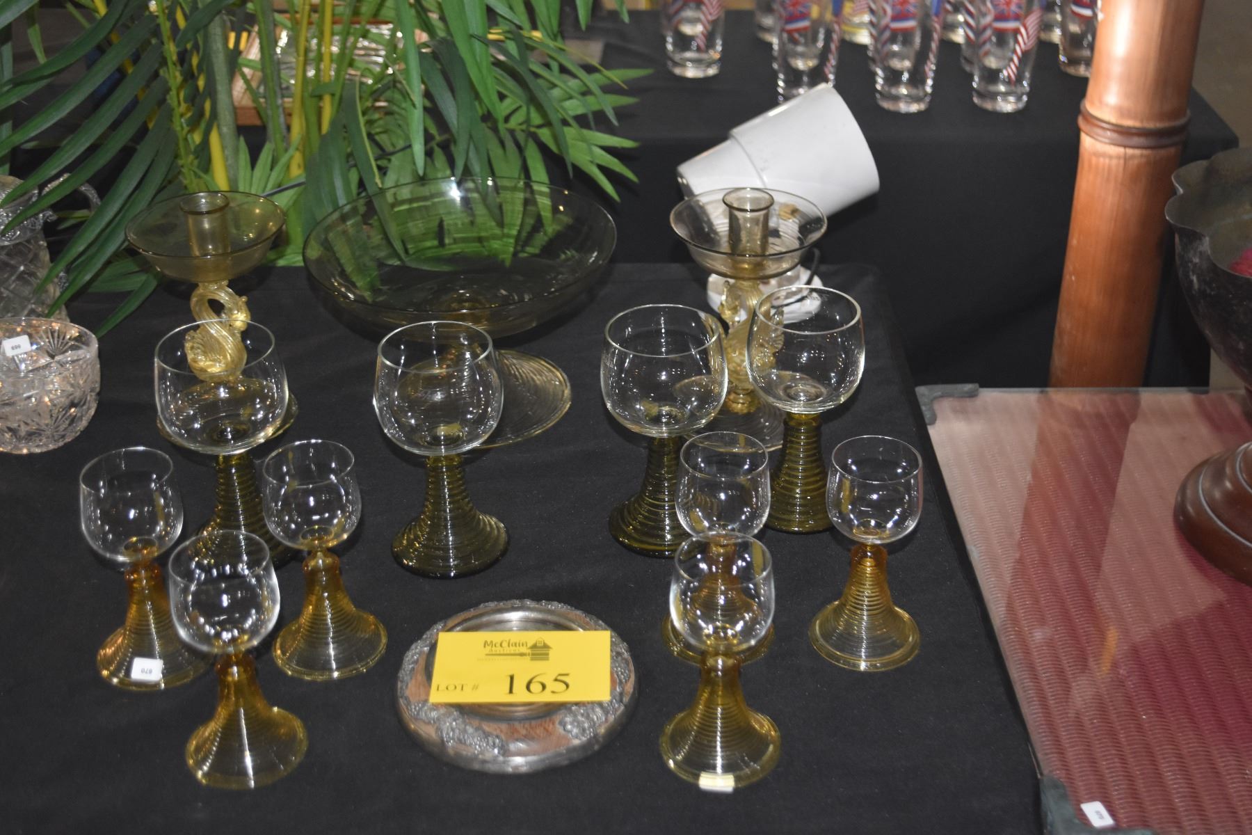 VINTAGE AMBER/GREEN BEEHIVE GLASSES, GLASS PEDESTAL BOWL & MURANO SWAN CANDLE STICKS (14 PCS)