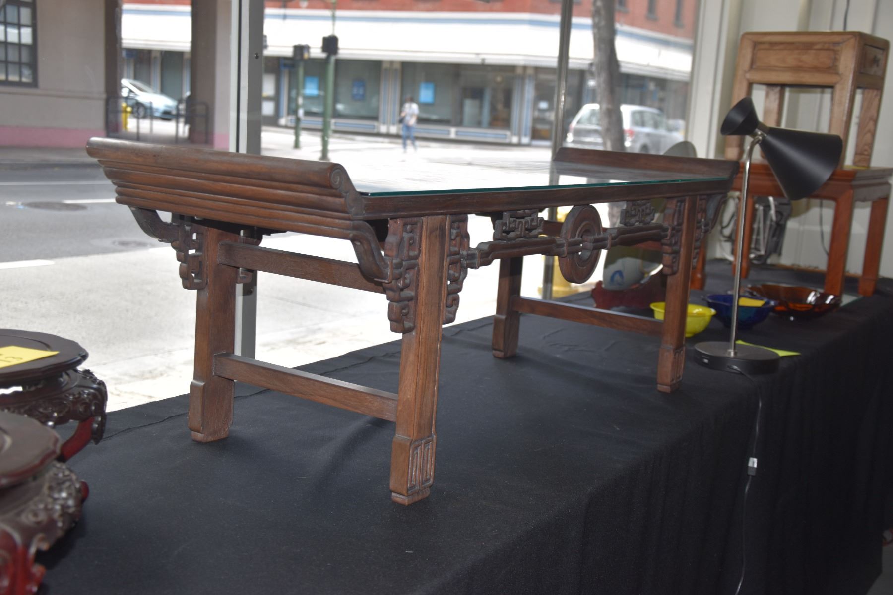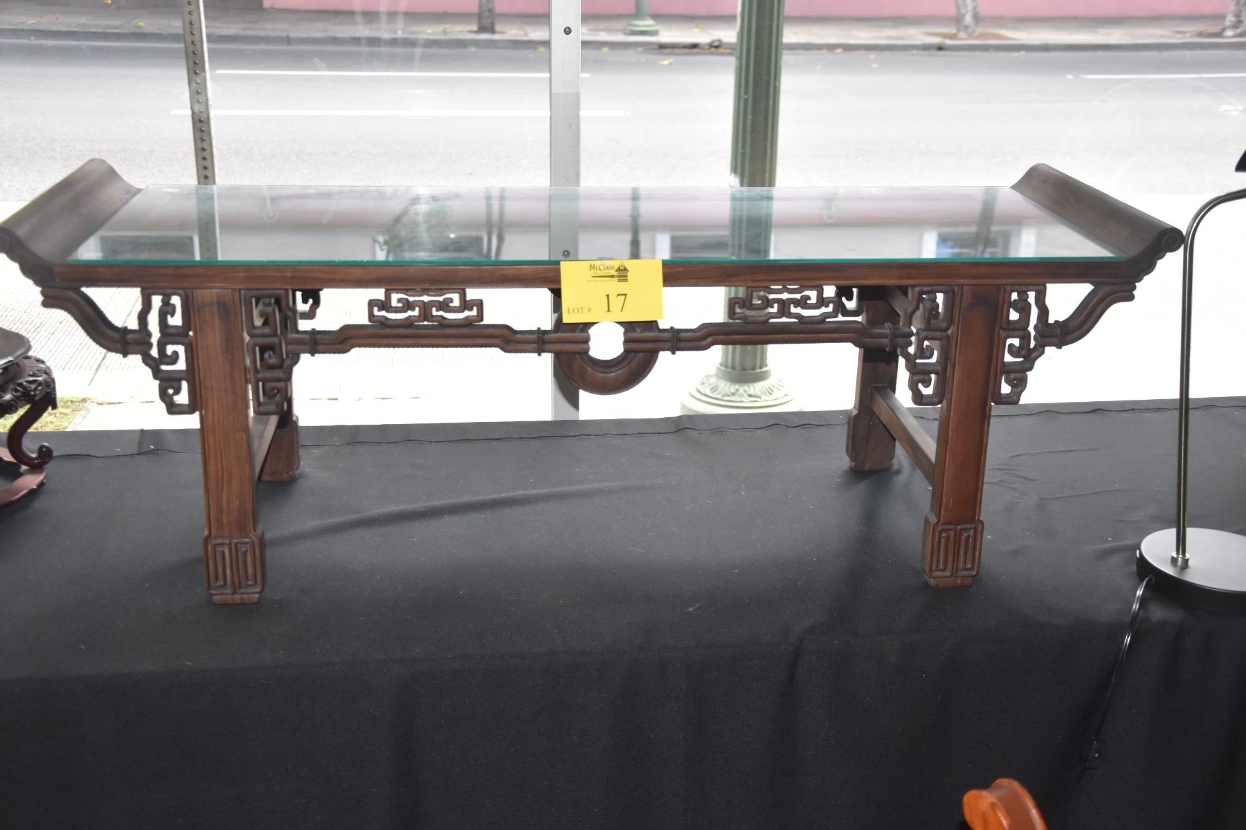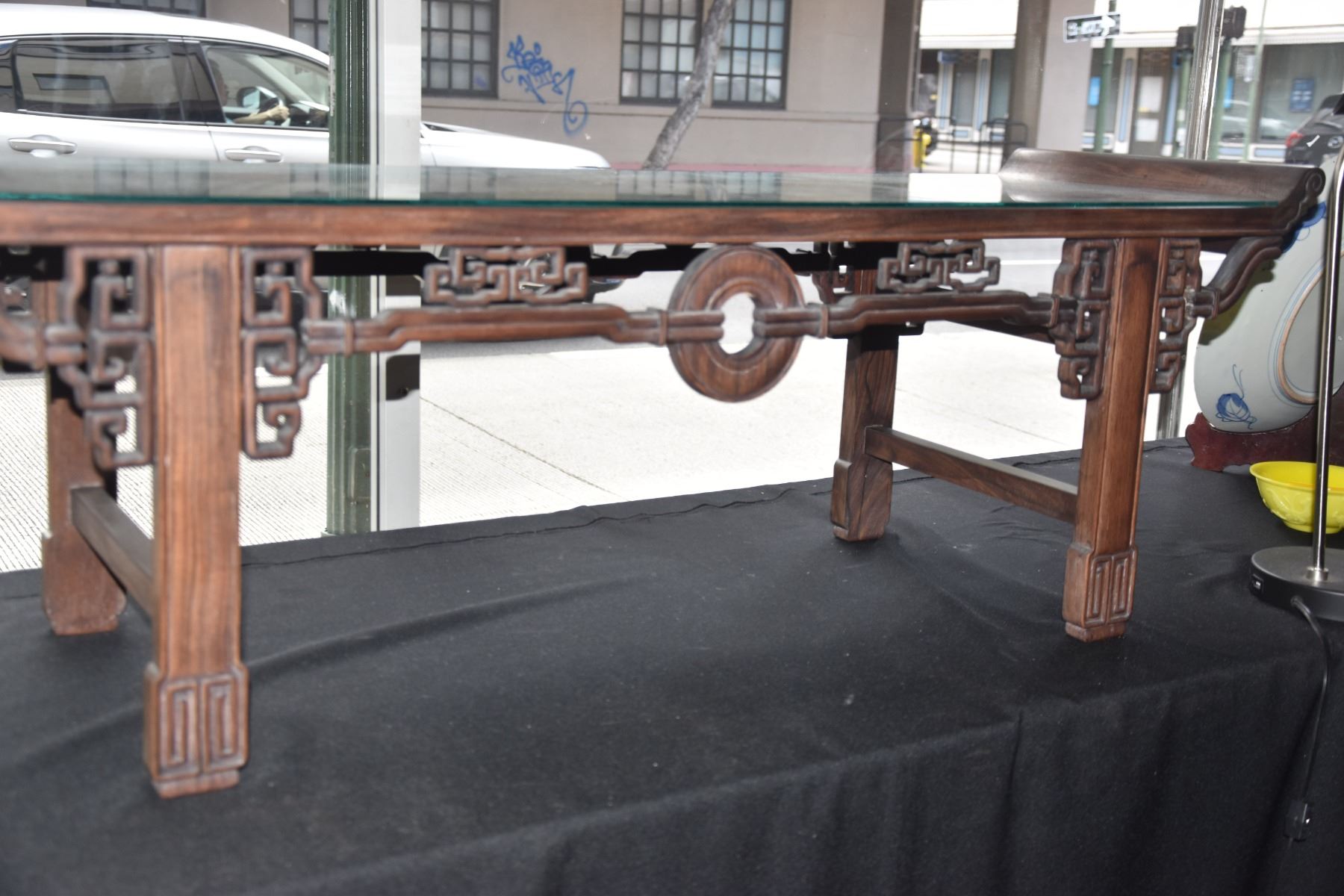VINTAGE CHINESE 20TH CENTURY HUALI (ROSEWOOD) LOW TABLE W/UPTURNED SCROLLED ENDS, THE RETICULATED APRON CARVED W/KEYFRET & COIN MOTIF ON RAISED RECTANGULAR LEGS (50" X 17 1/2" X 16")