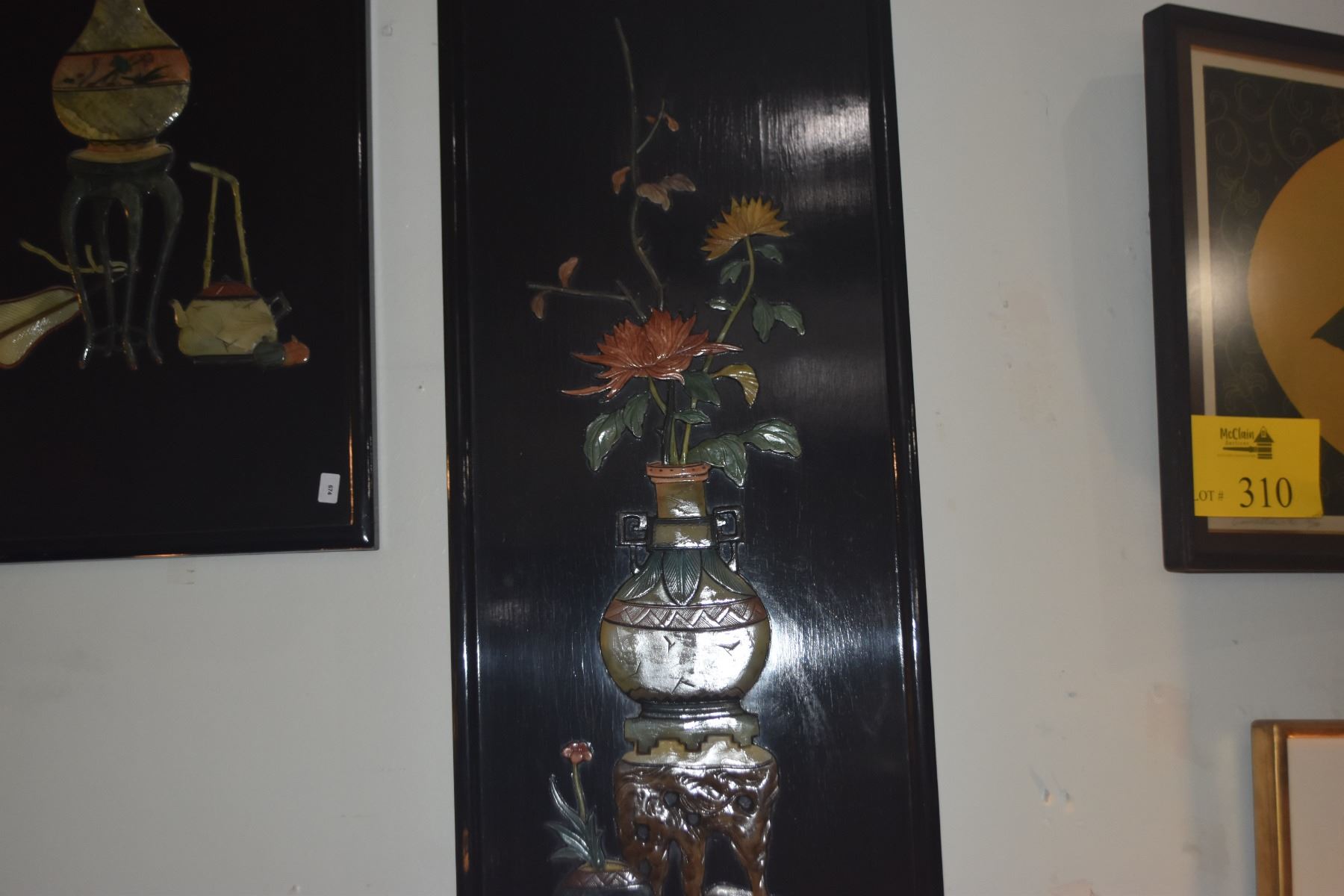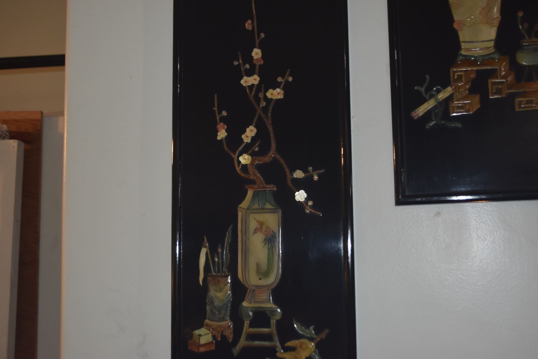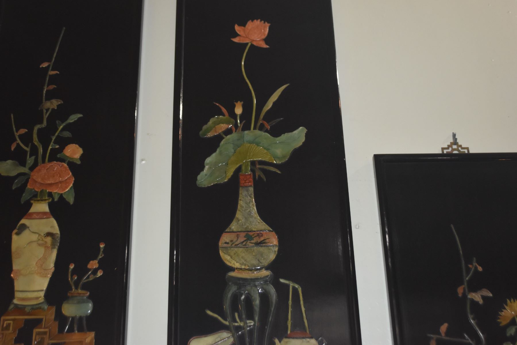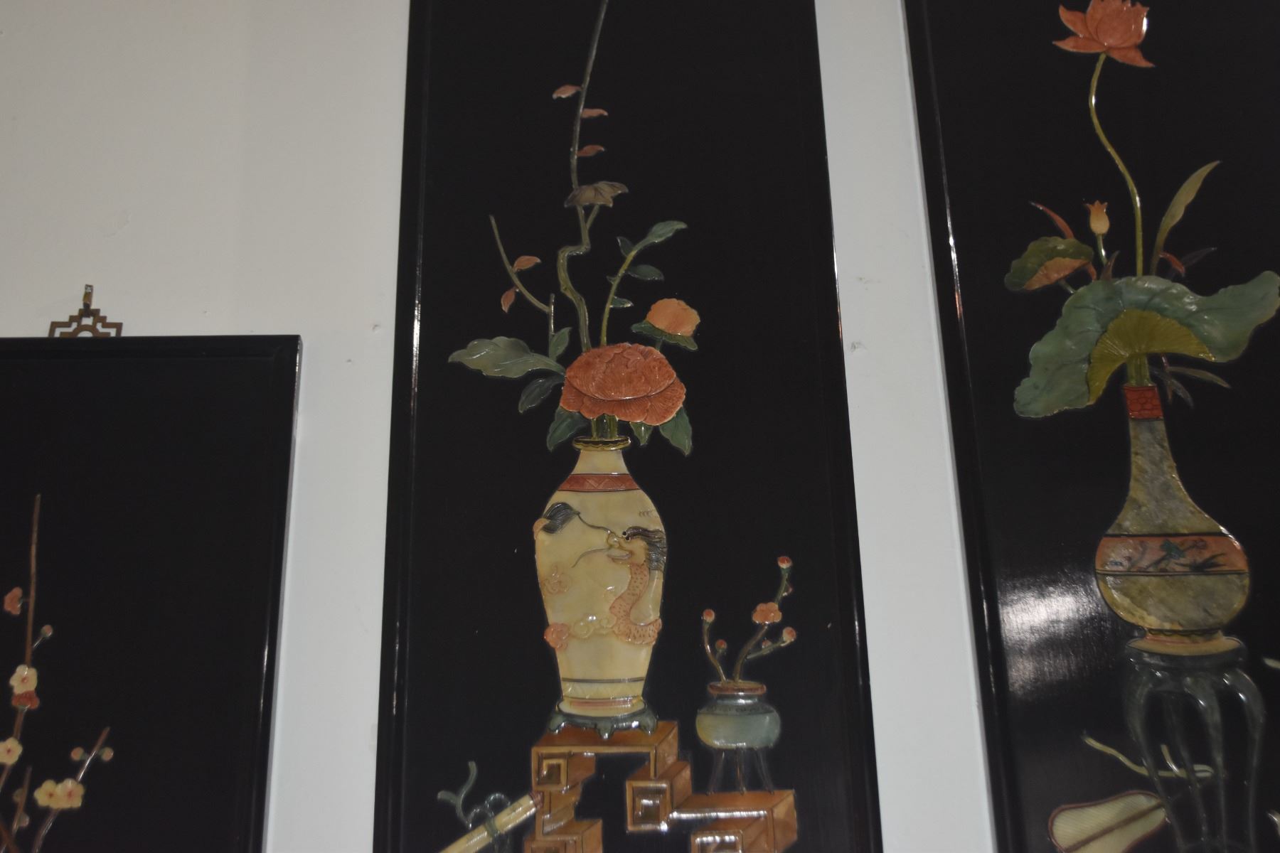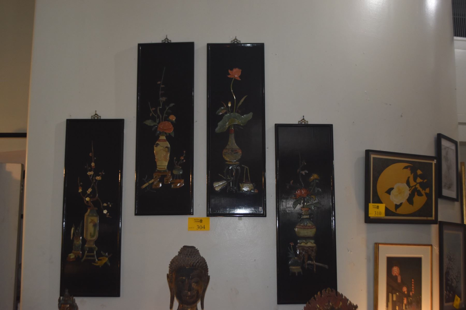 VINTAGE CHINESE BLACK LACQUER WALL PANELS W/CARVED SOAPSTONE DESIGNS OF FLOWERS OF FOUR SEASON (4 PCS)