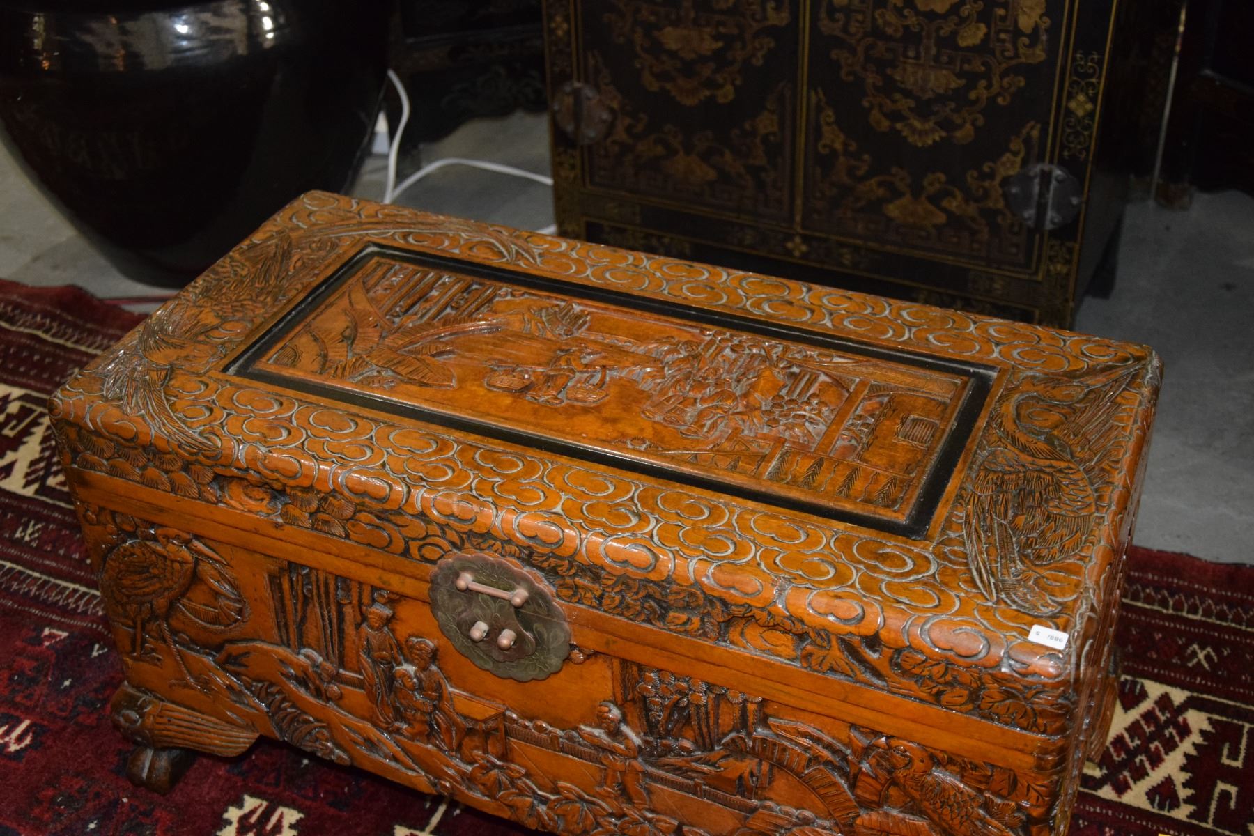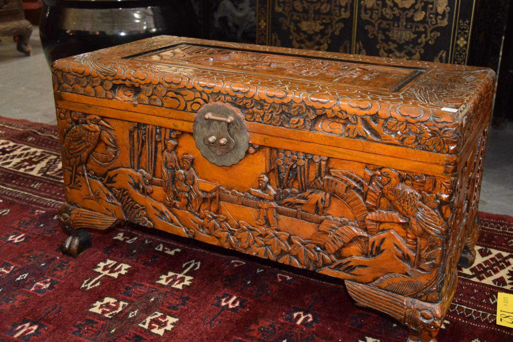 VINTAGE CHINESE CARVED WOOD TRUNK (27" X 13" X 15")