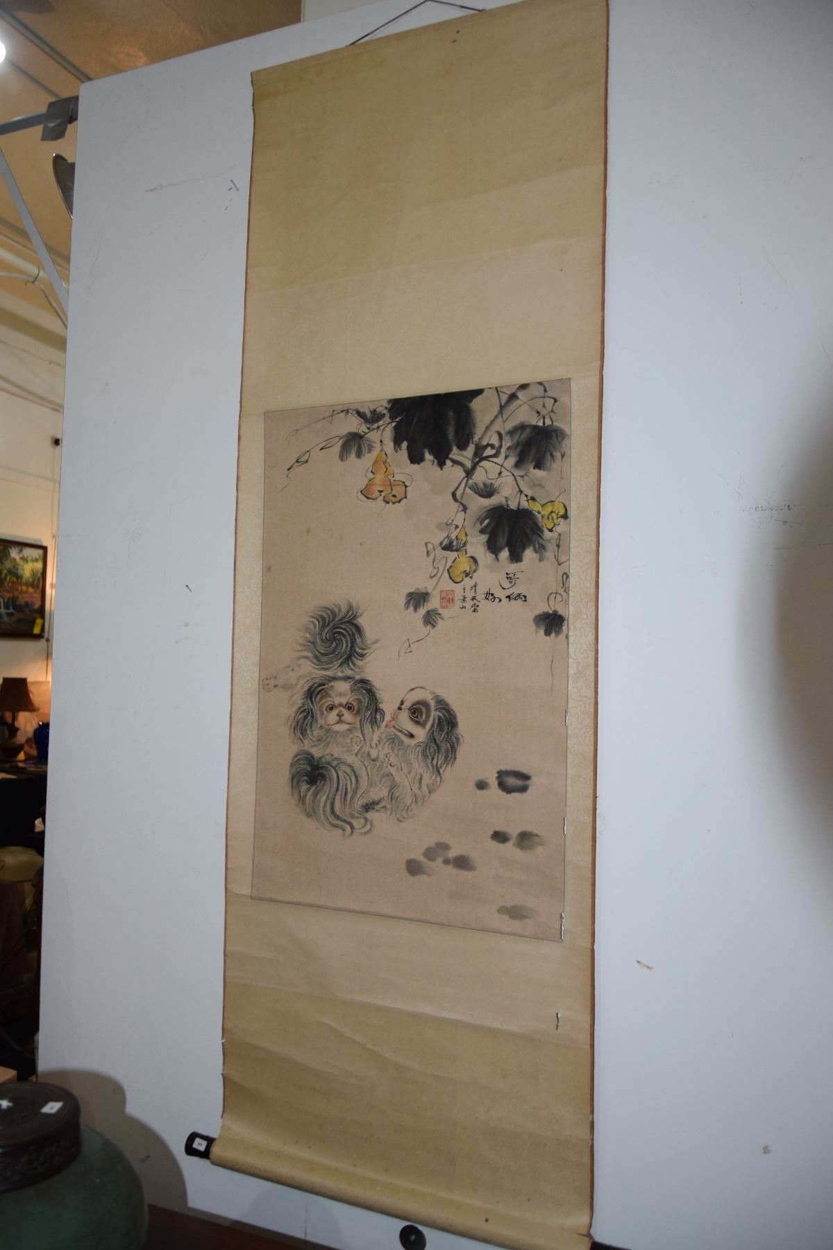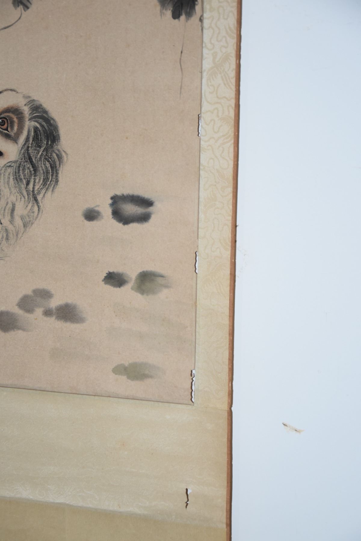 VINTAGE CHINESE POLYCHROME HAND PAINTED SCROLL OF PEKINGESE DOGS (SOME DAMAGE)