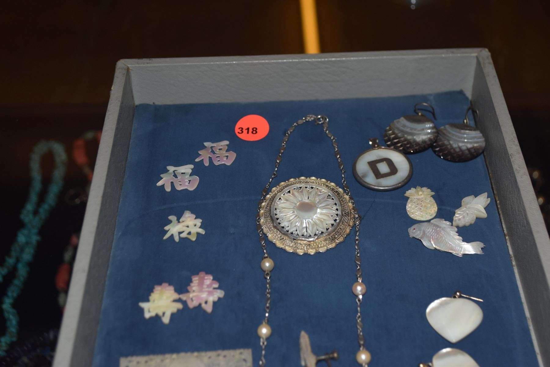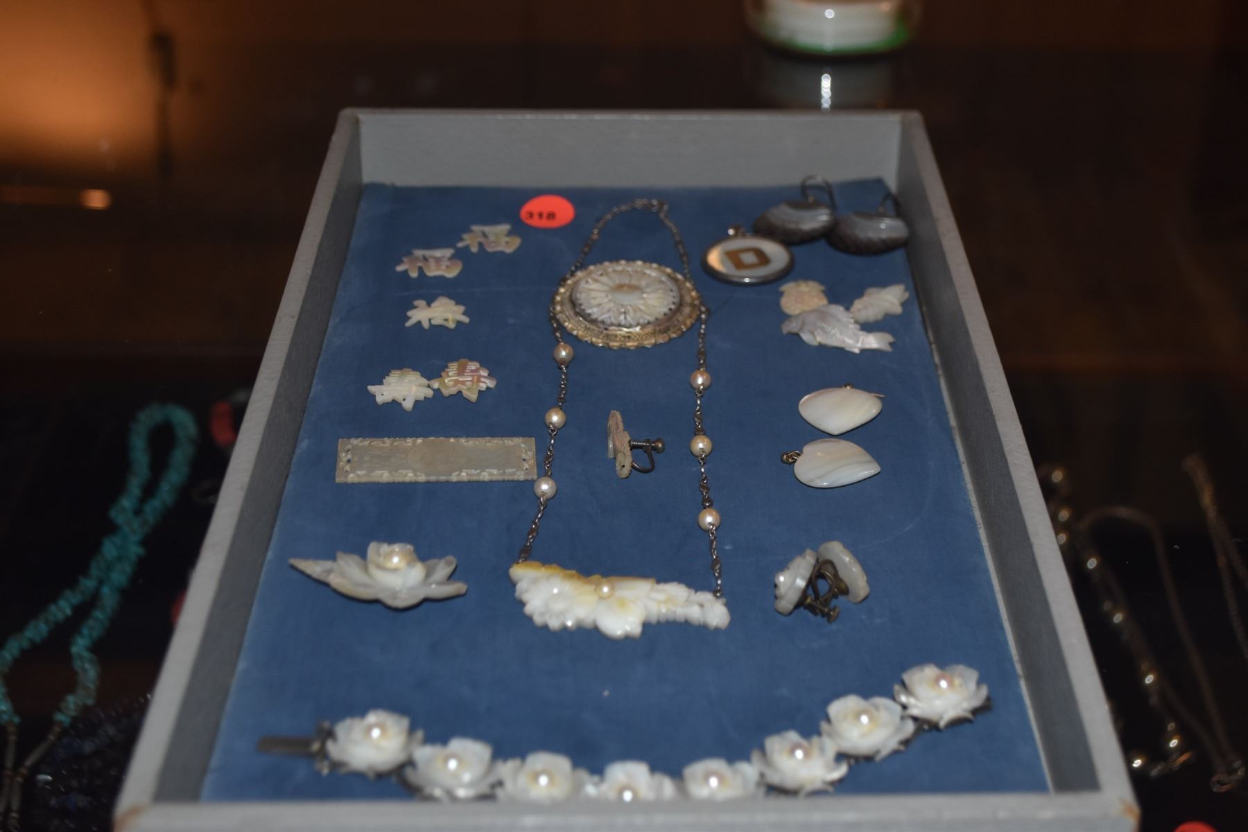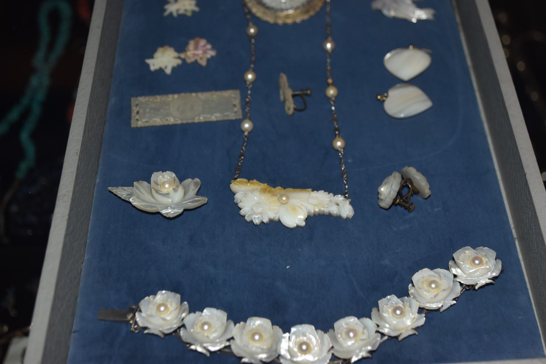VINTAGE COLLECTION OF MOTHER OF PEARL JEWELRY & CARVINGS