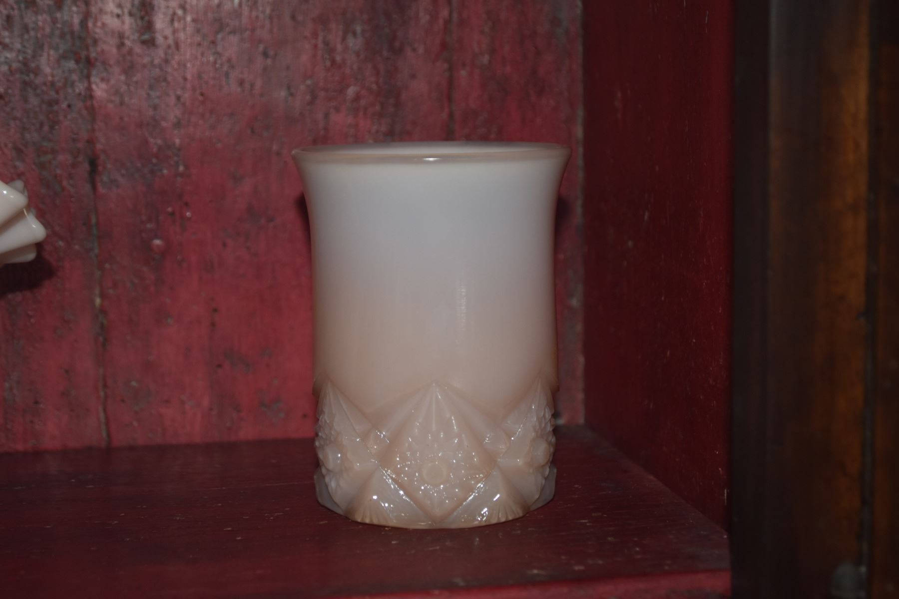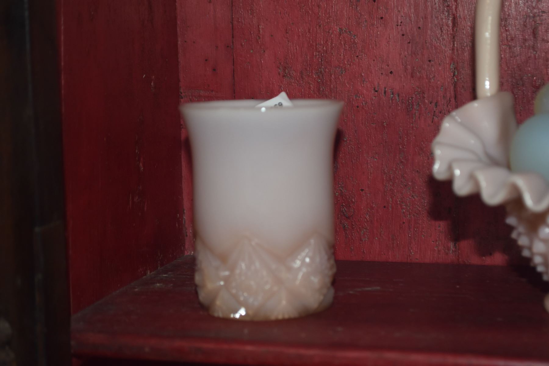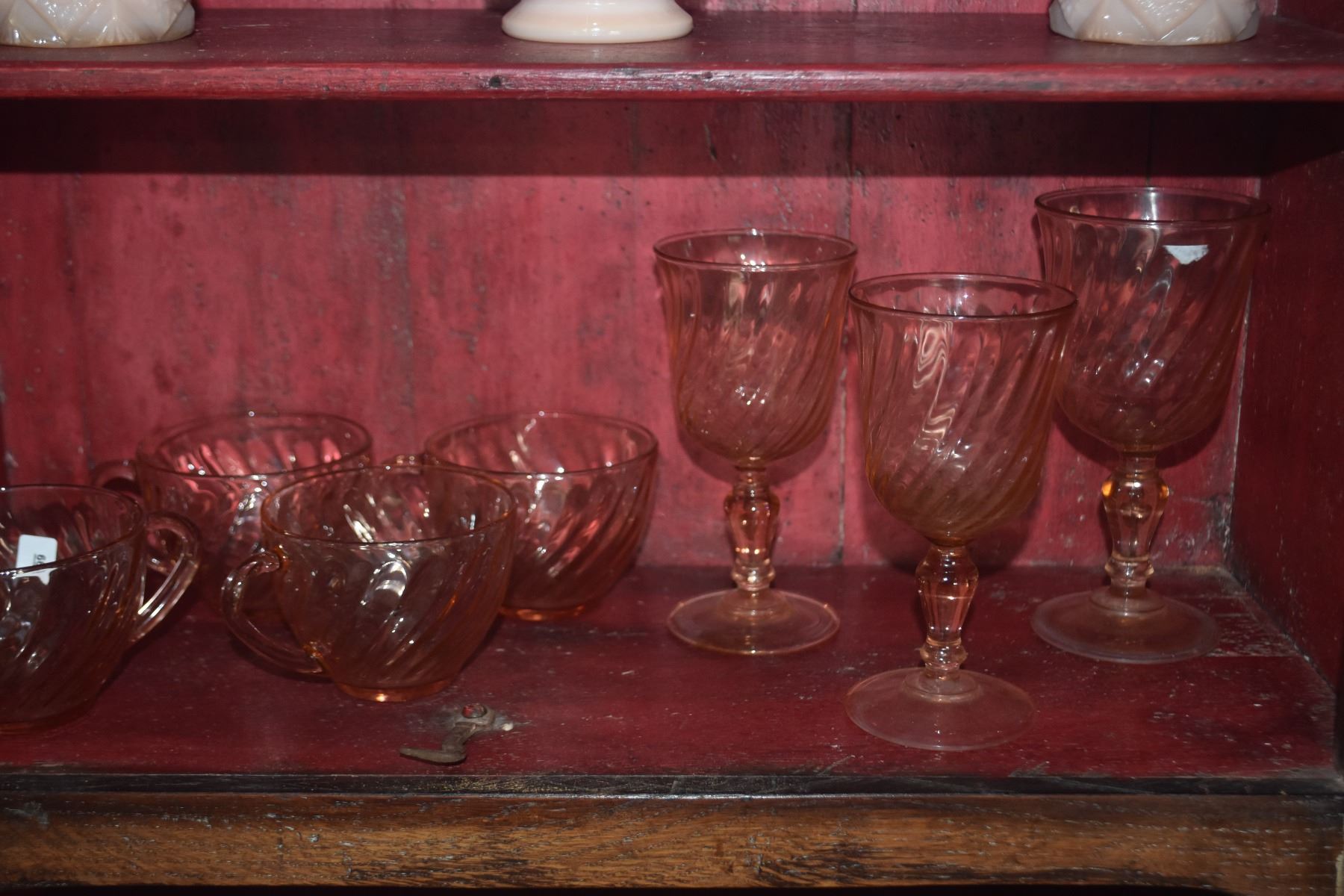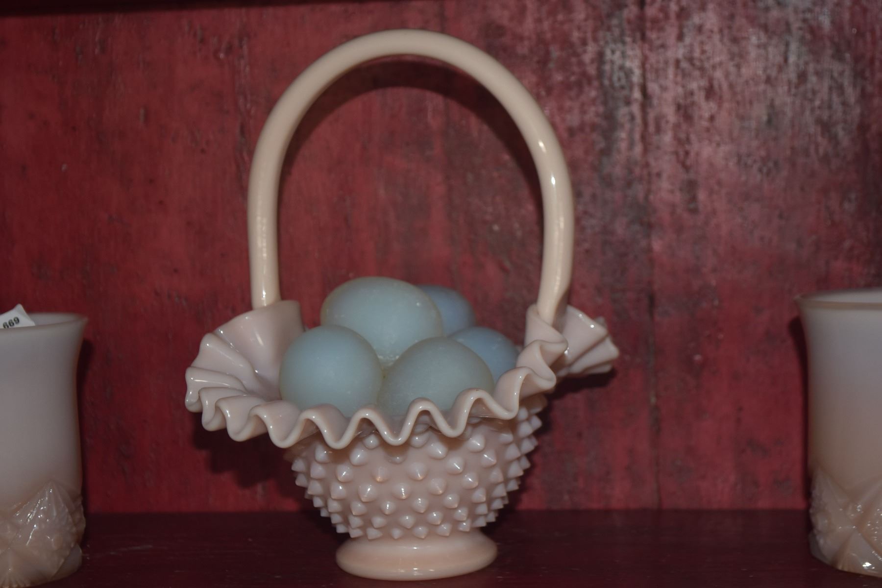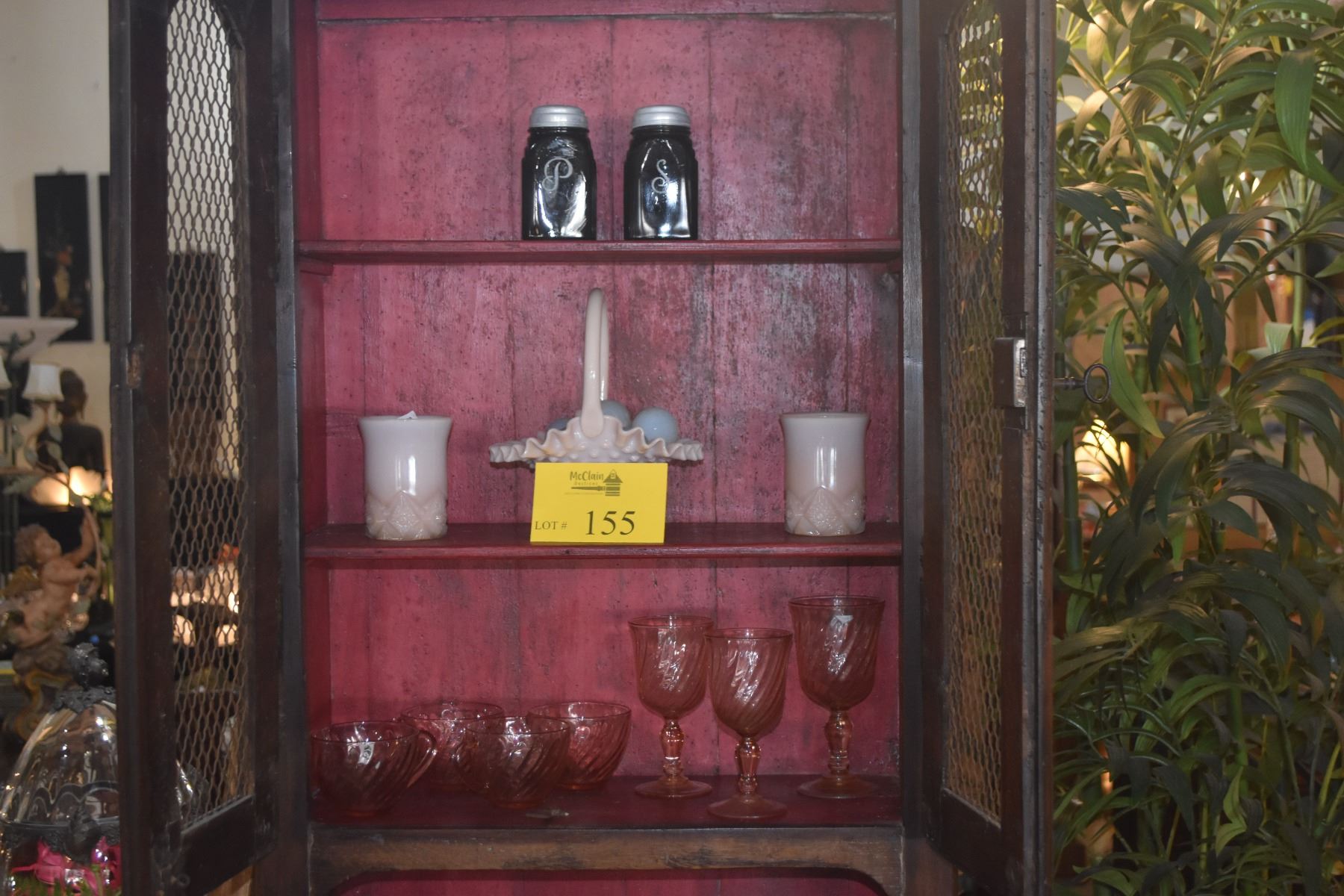 VINTAGE DECO MCKEE SALT & PEPPER SHAKERS, PINK SWIRL CUPS & STEMWARE, PINK MILK GLASS CUPS & BASKET W/OPALITE GLASS EGGS (19 PCS)