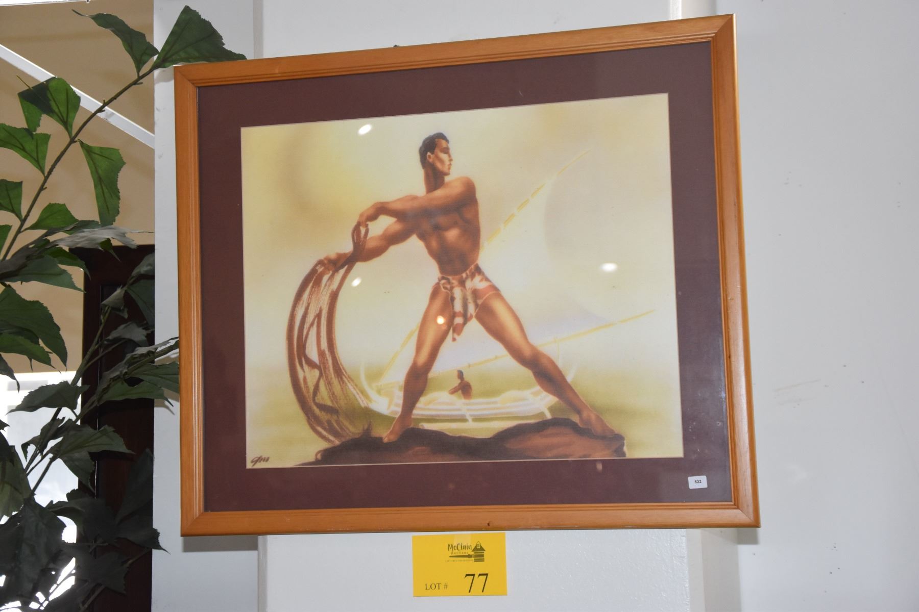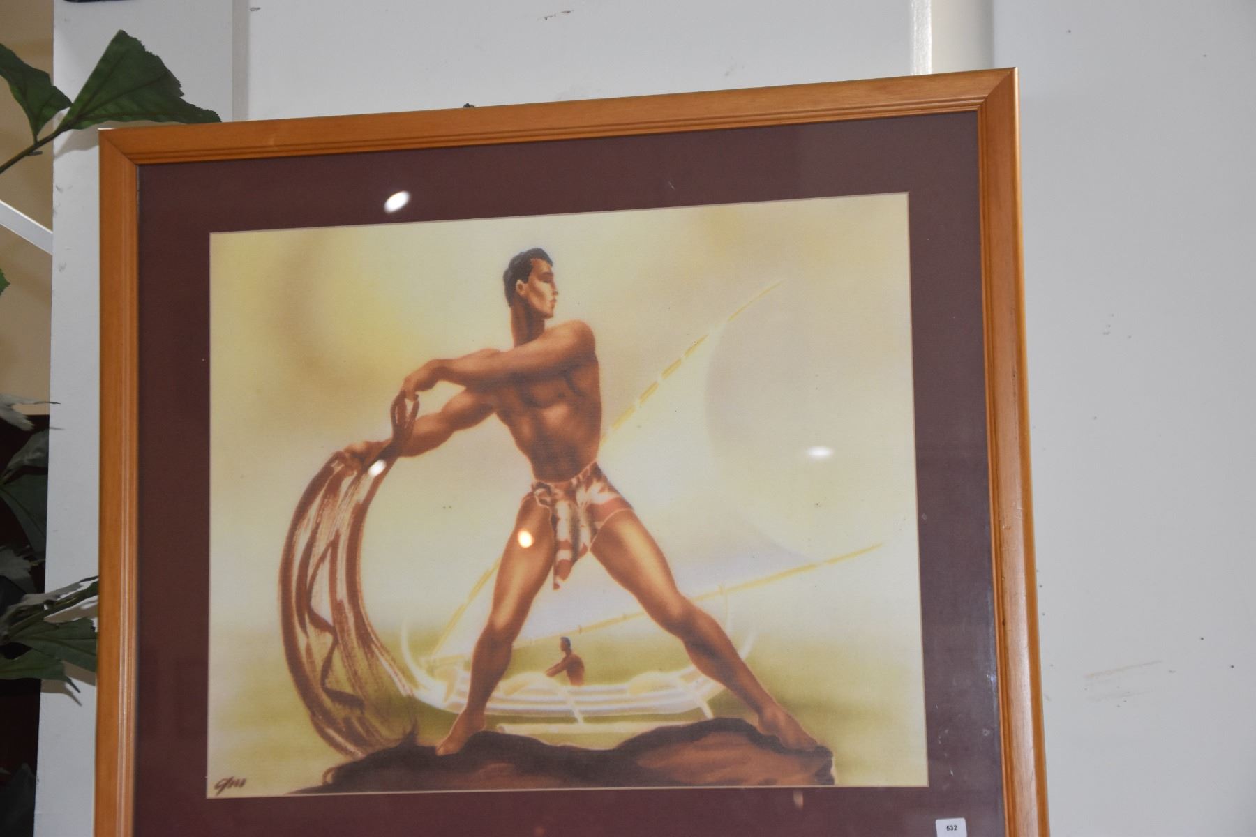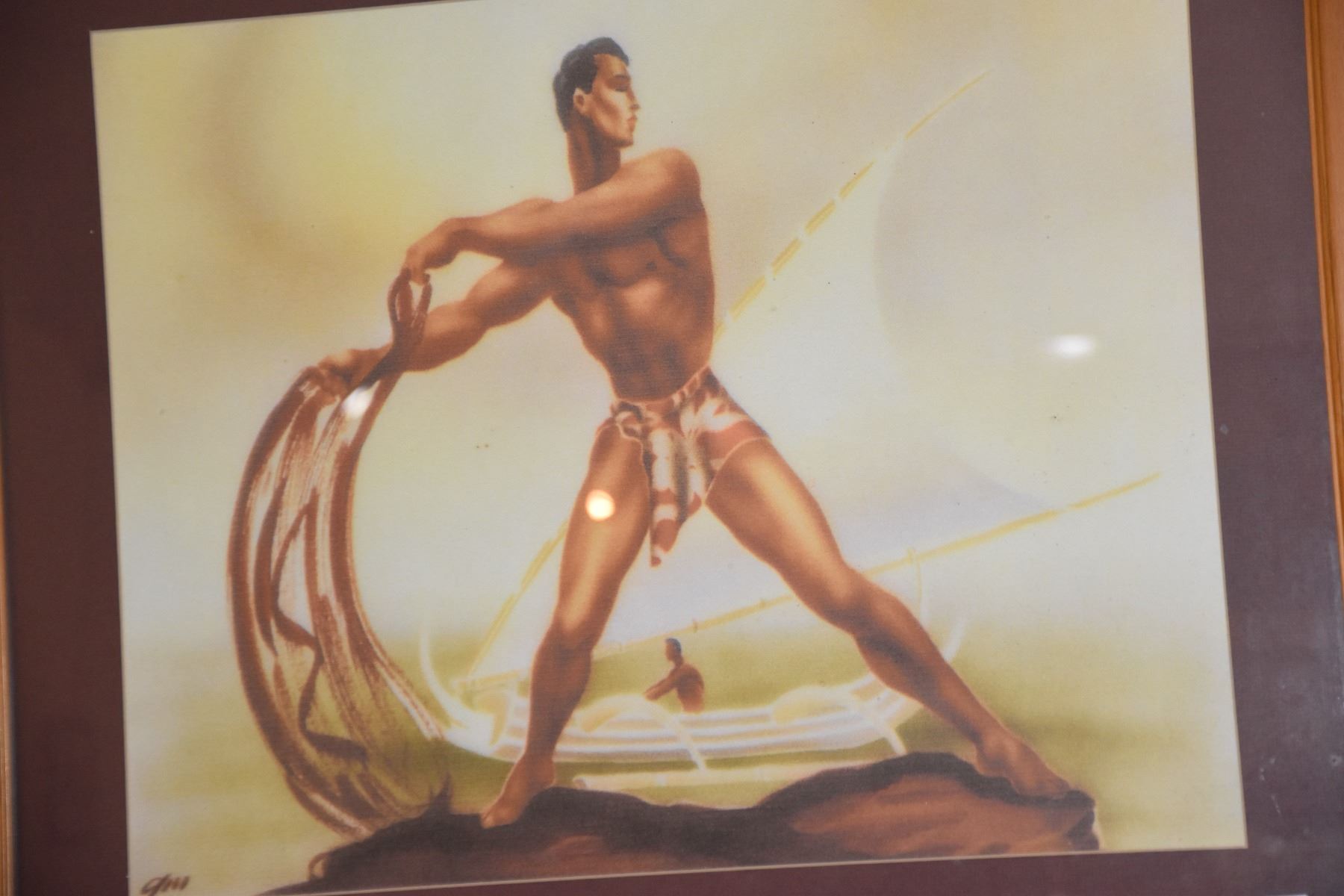VINTAGE FRAMED PRINT OF HAWAIIAN NET FISHERMAN BY GILL