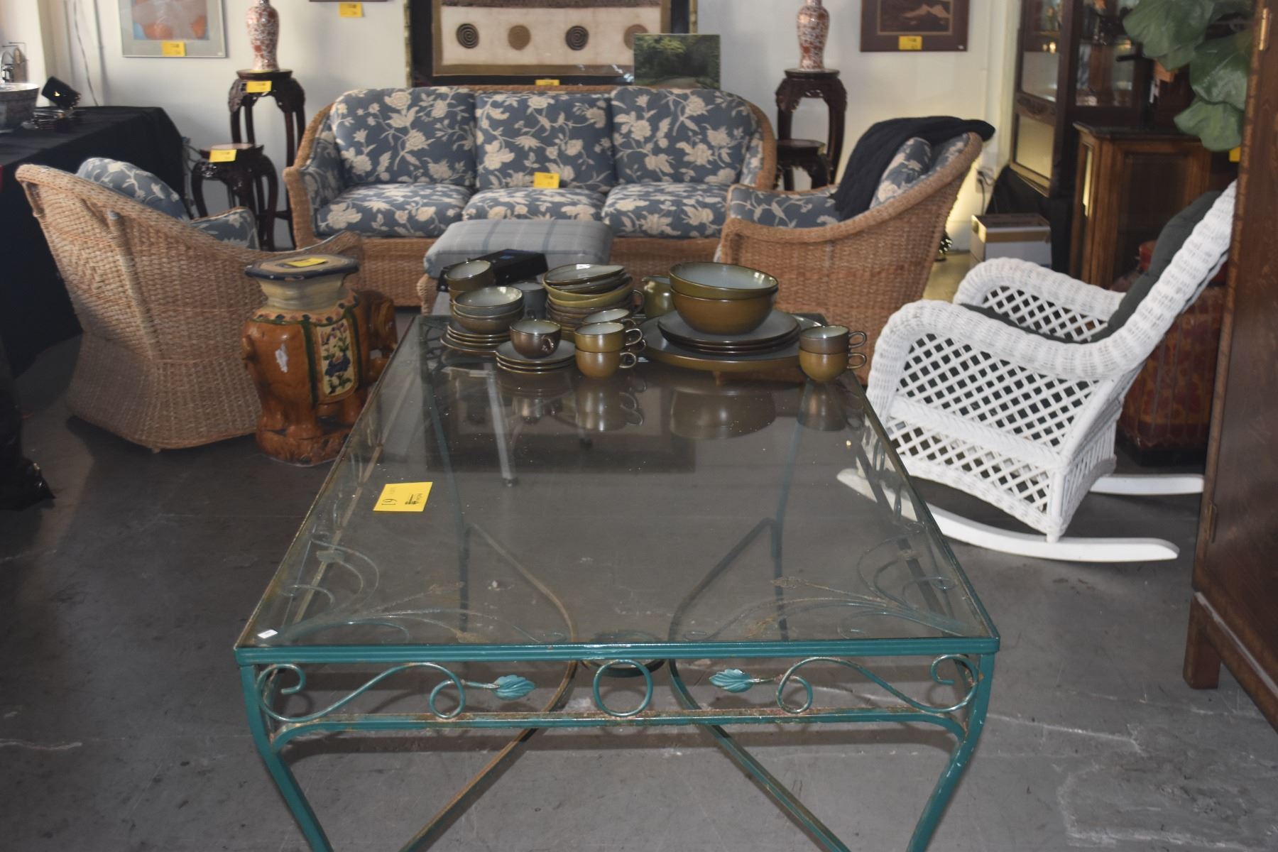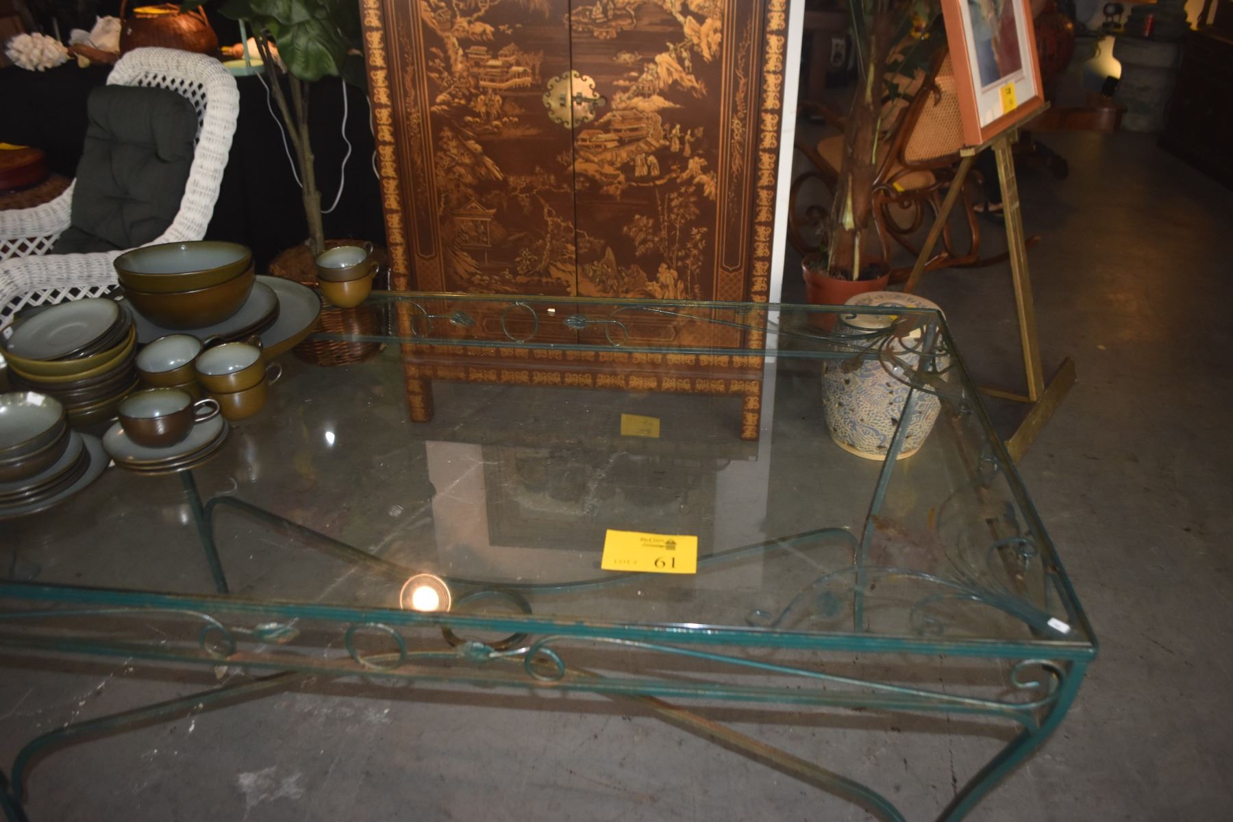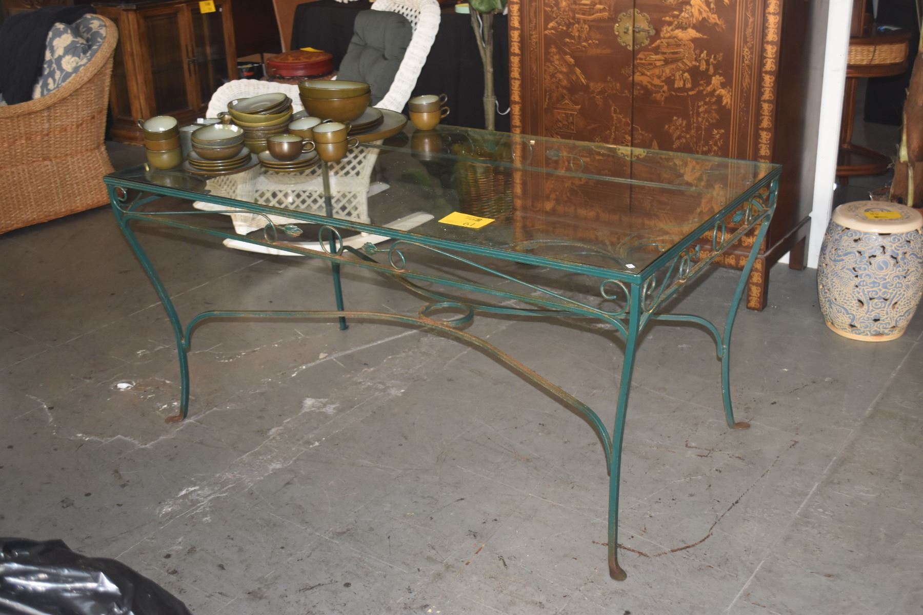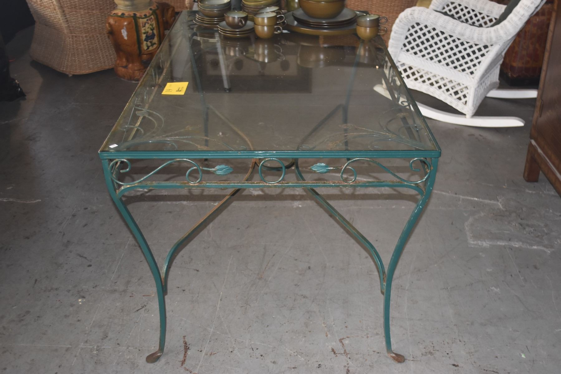 VINTAGE GREEN WROUGHT IRON & GLASS PATIO TABLE (601/2" X 34 1/2" X 29 1/2")