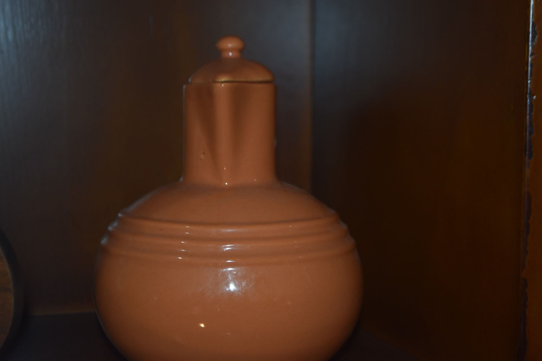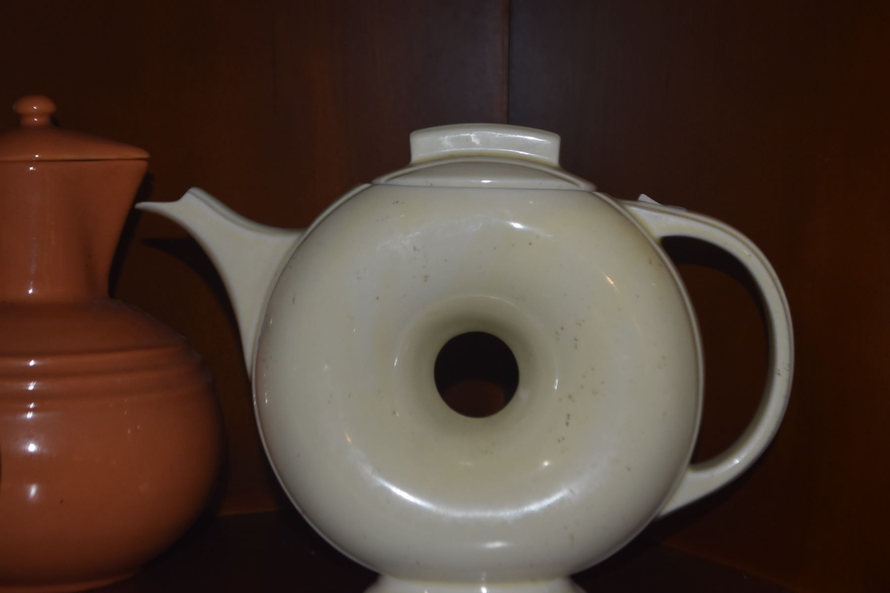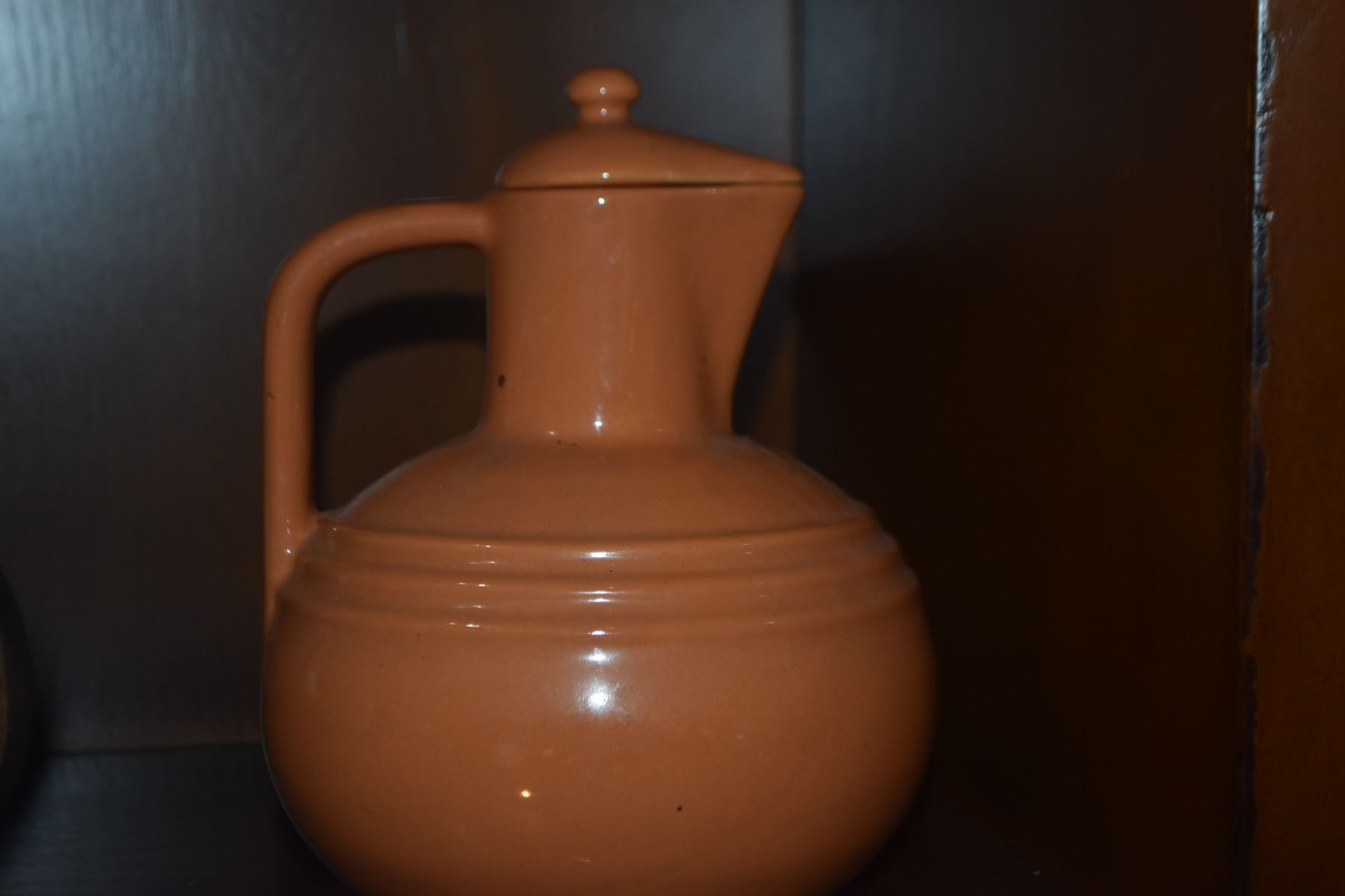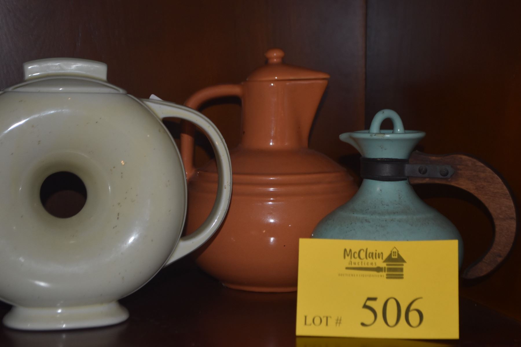VINTAGE HALL DONUT TEAPOT, VINTAGE MARCREST BANDED BALL PITCHER & GLADDING MCBEAN POTTERY CARAFE (3 PCS)