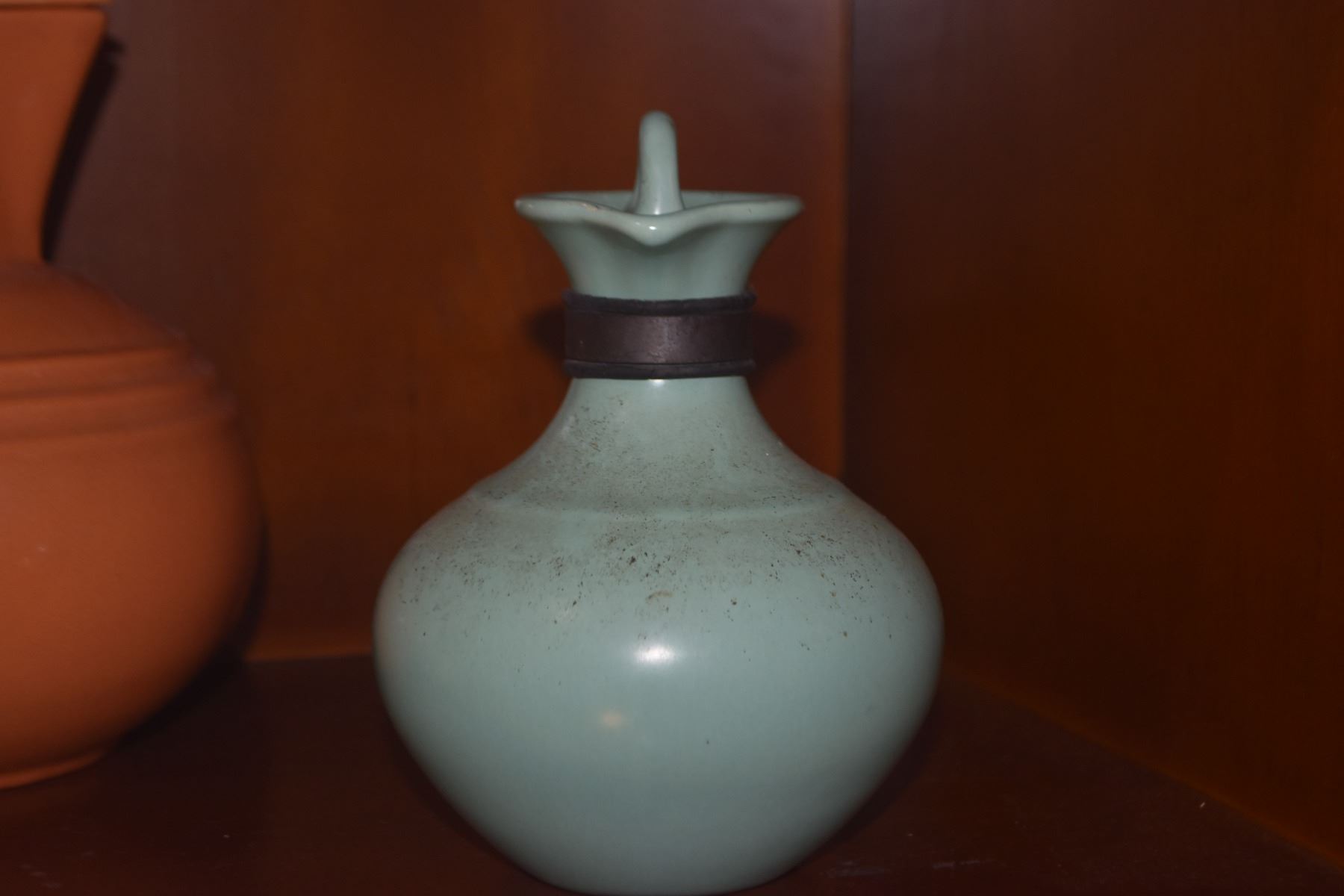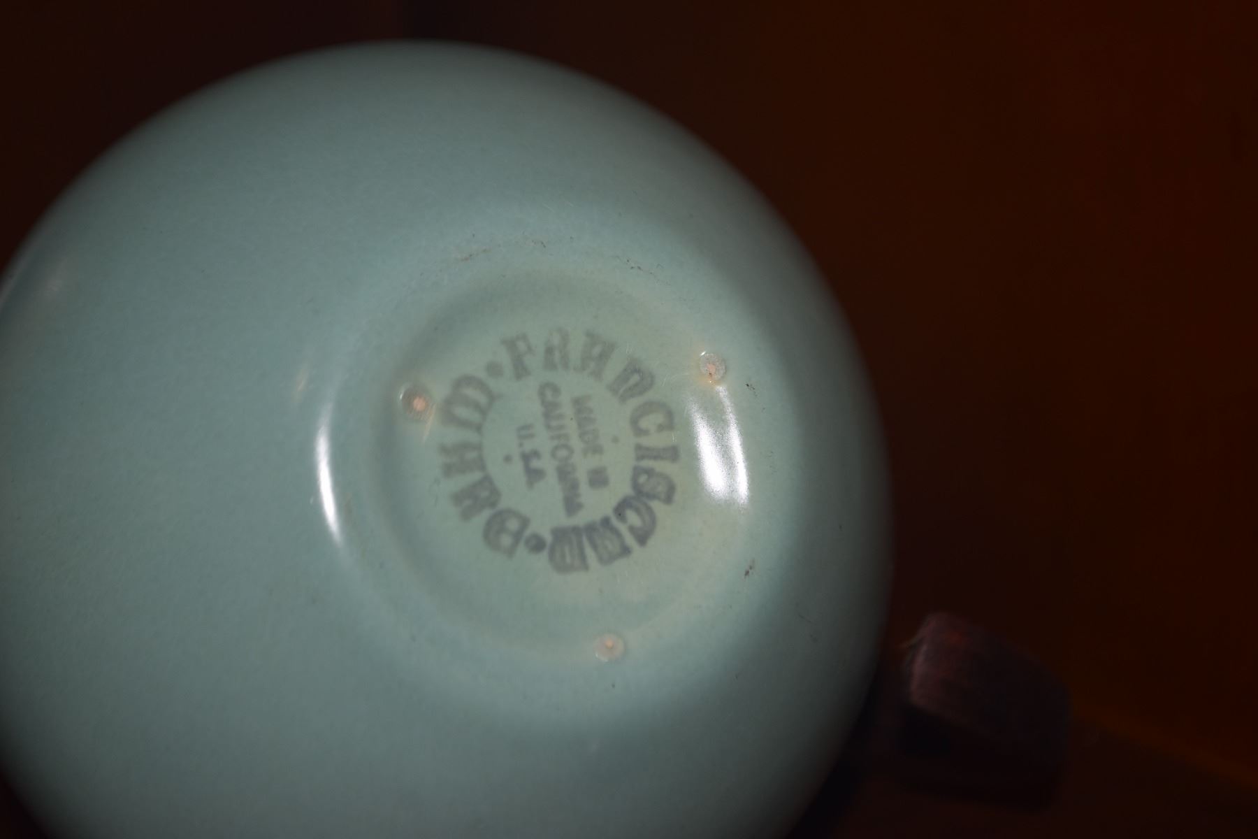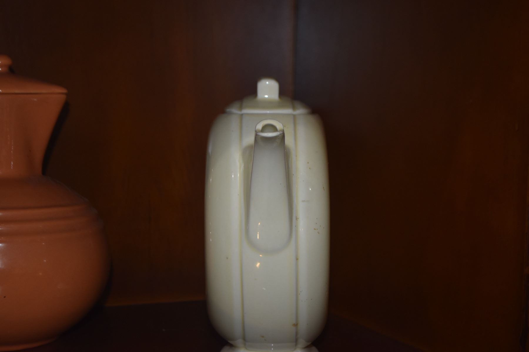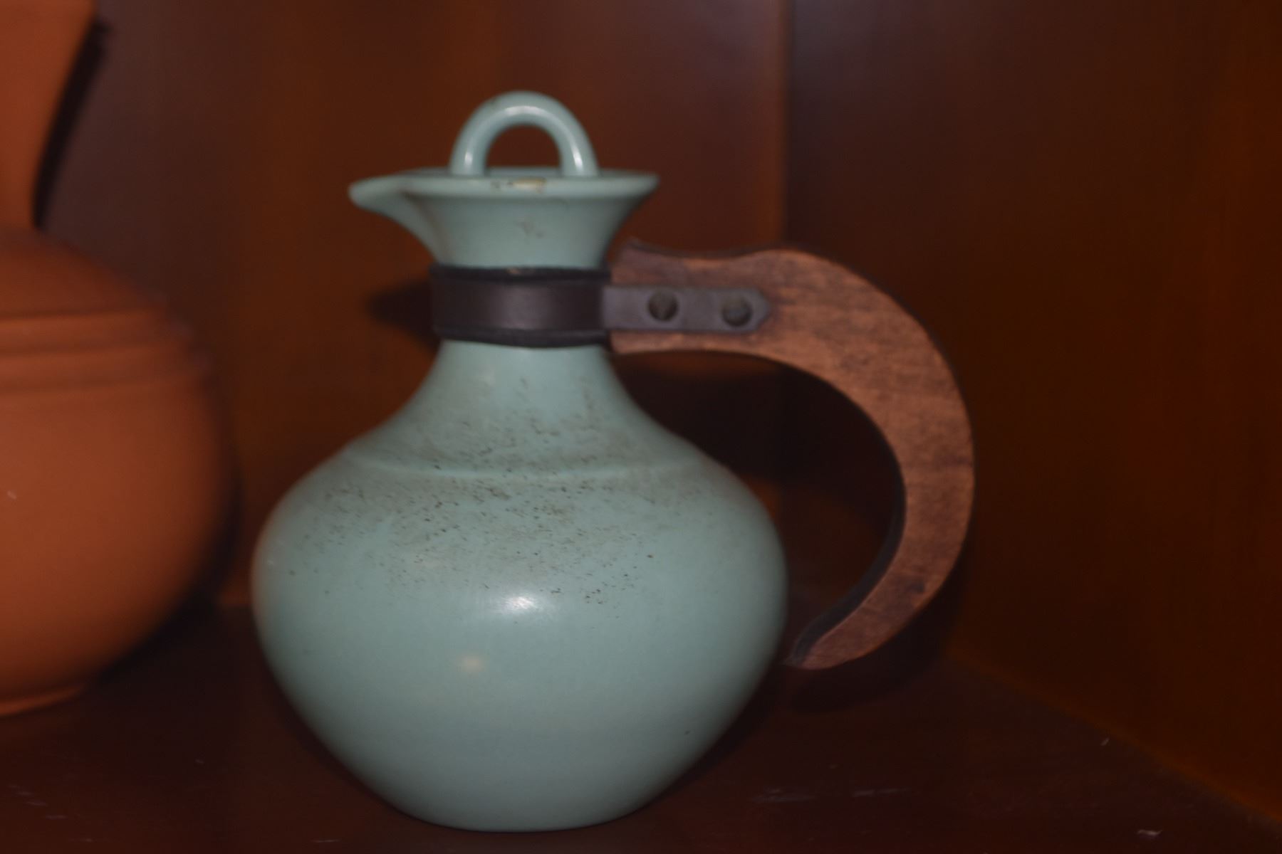 VINTAGE HALL DONUT TEAPOT, VINTAGE MARCREST BANDED BALL PITCHER & GLADDING MCBEAN POTTERY CARAFE (3 PCS)