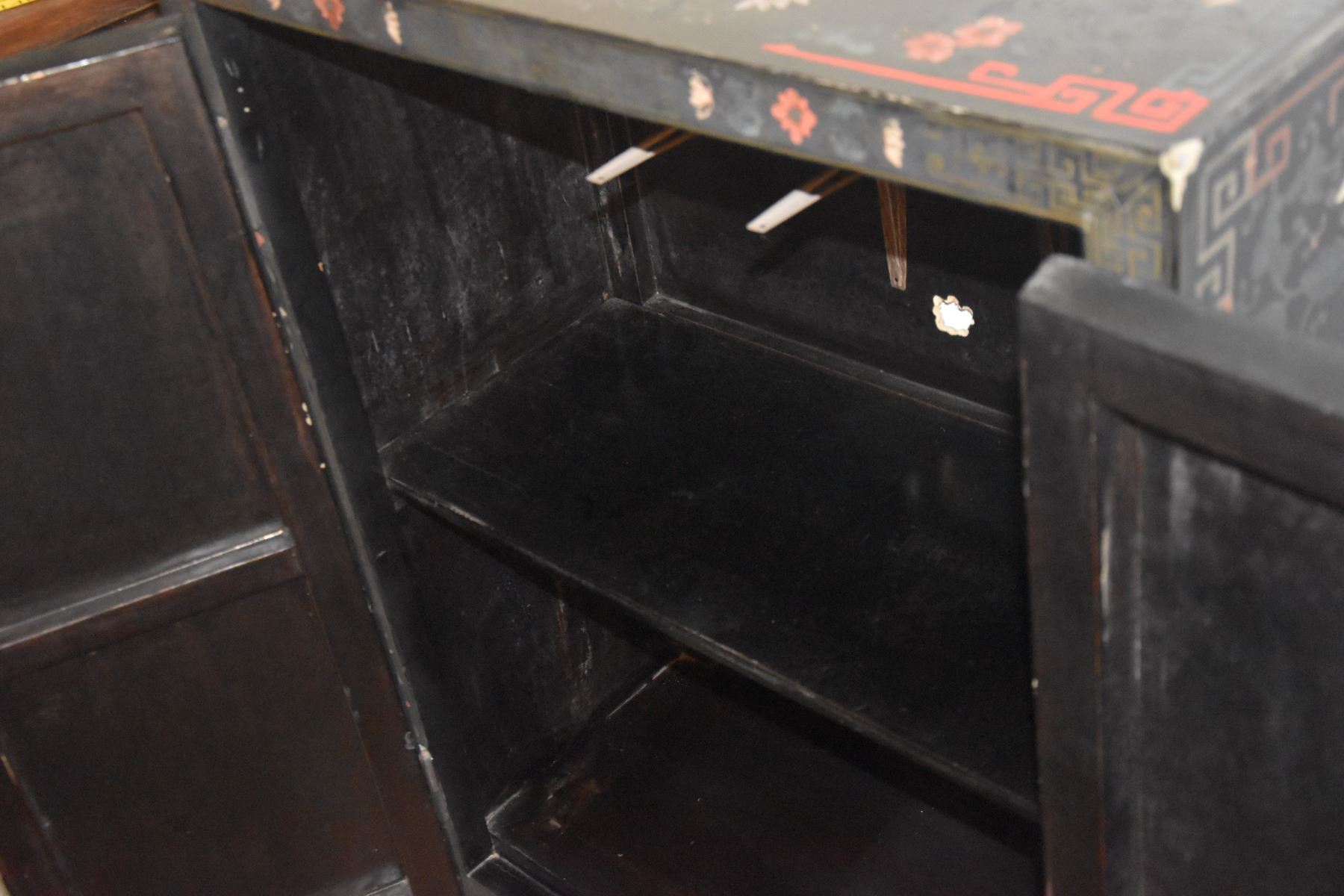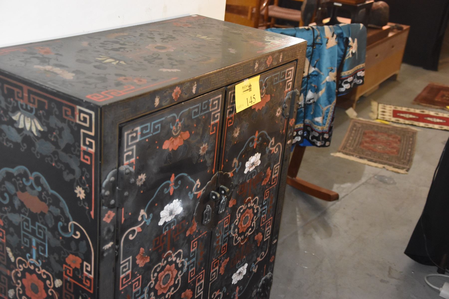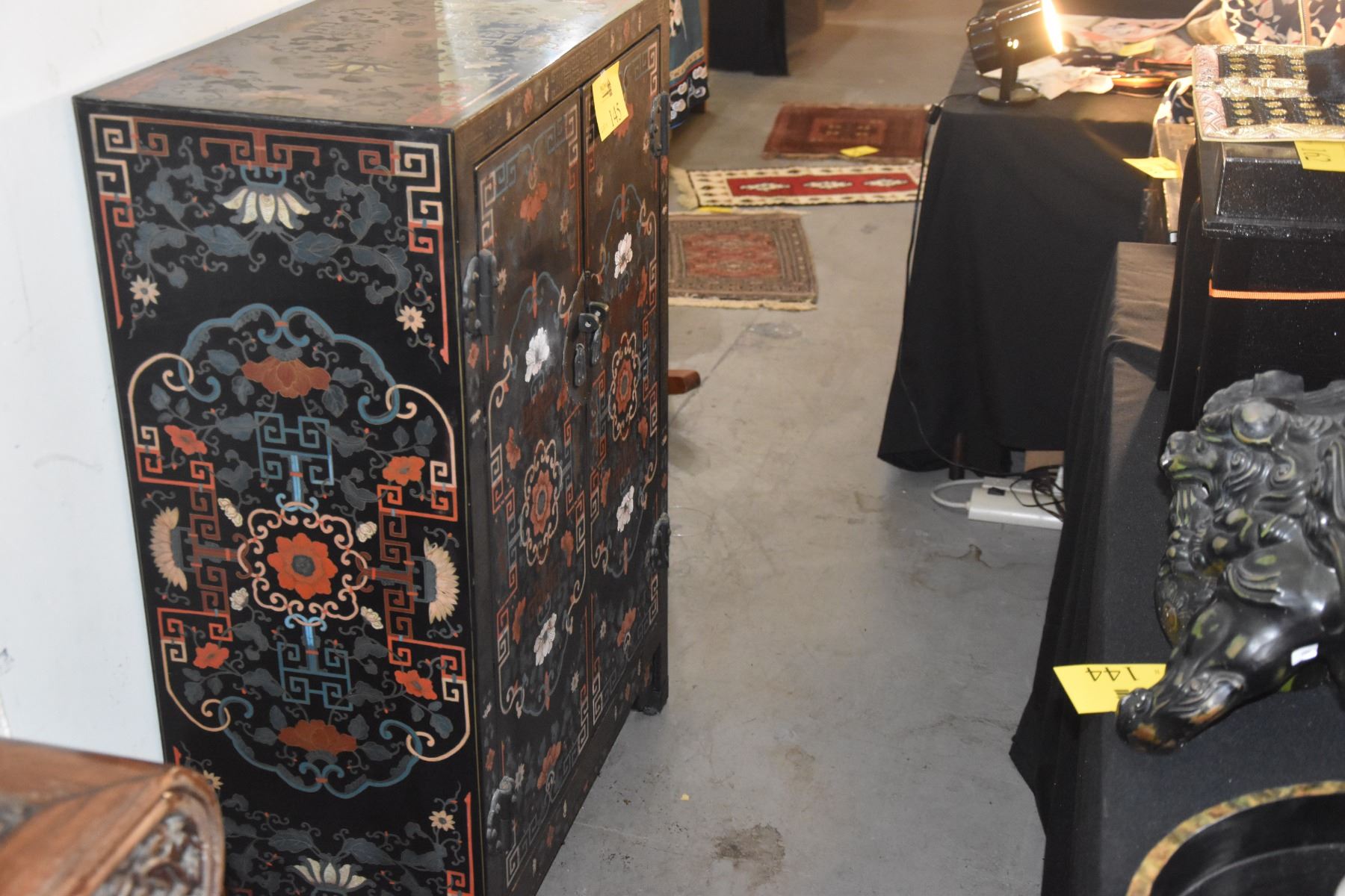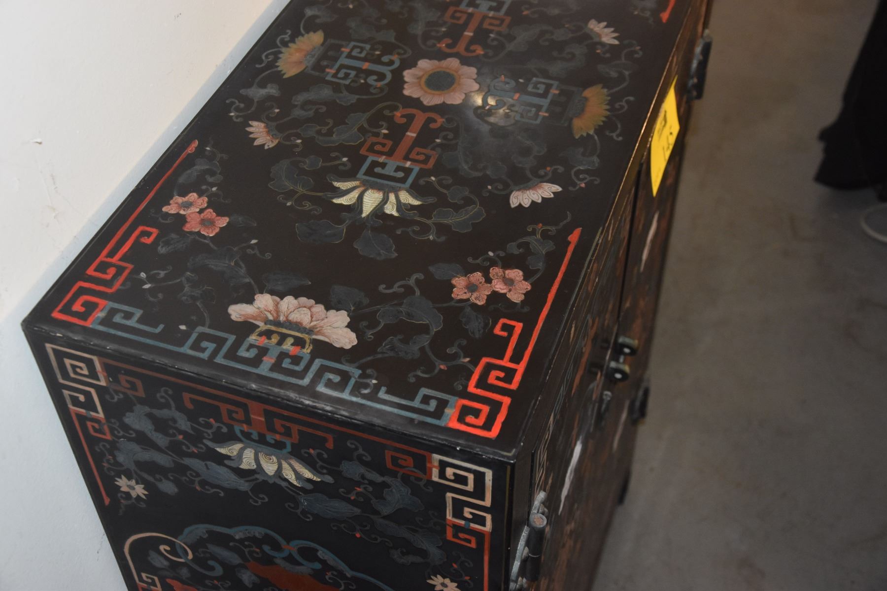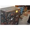 VINTAGE HAND PAINTED CHINESE BLACK LACQUER CABINET W/MULTI COLORED FLOWERS (31" X 15" X 43 1/4")