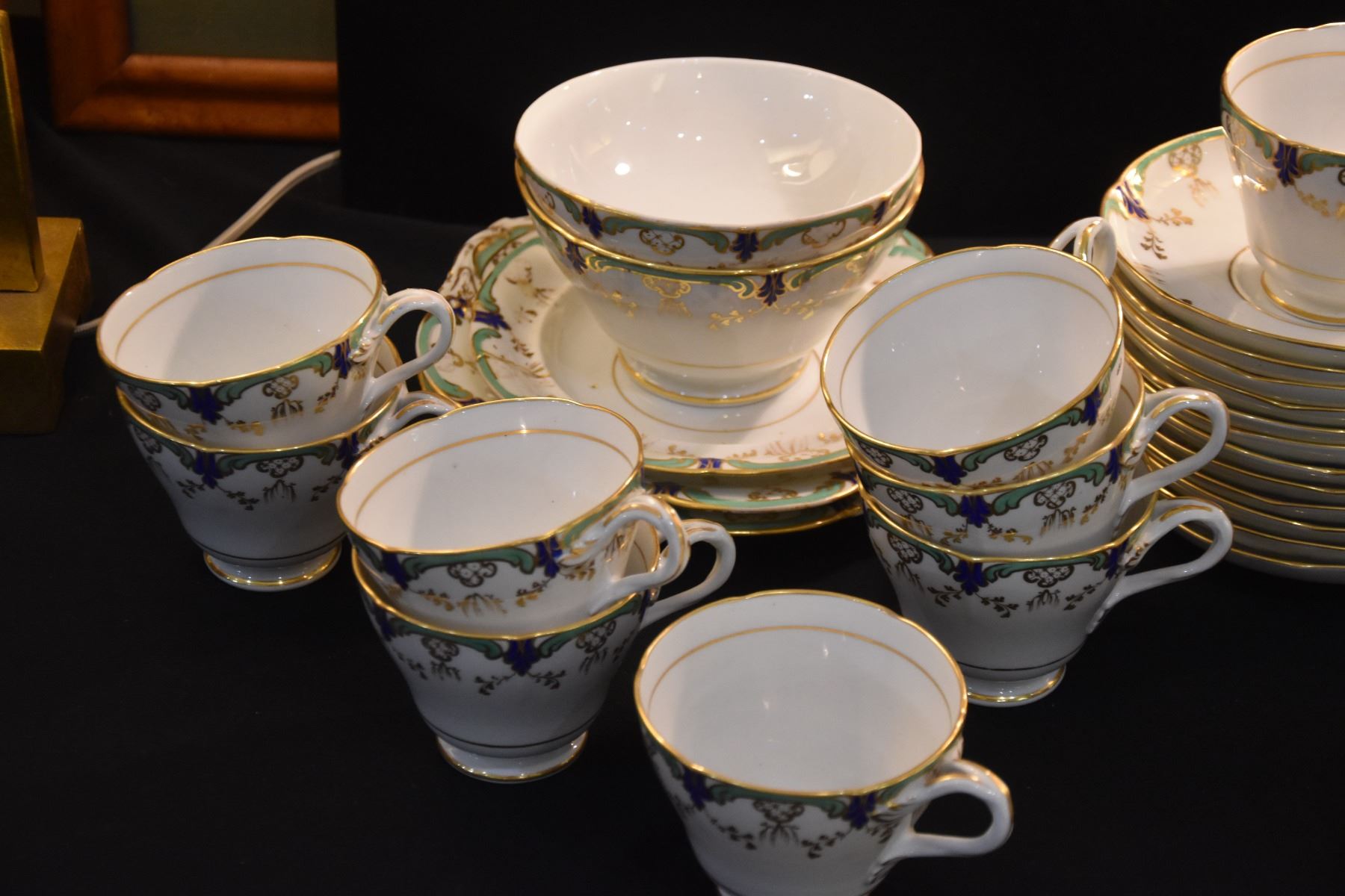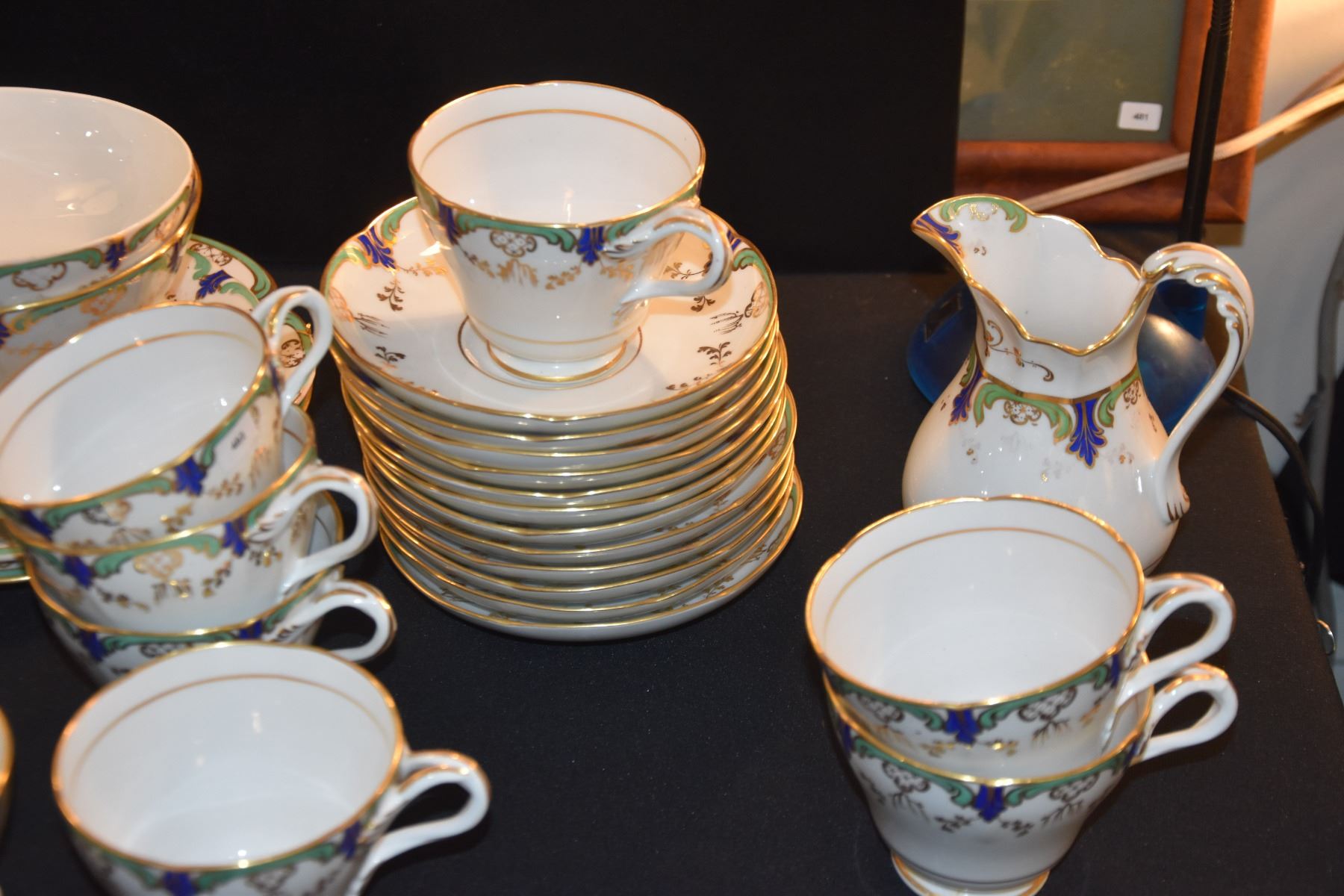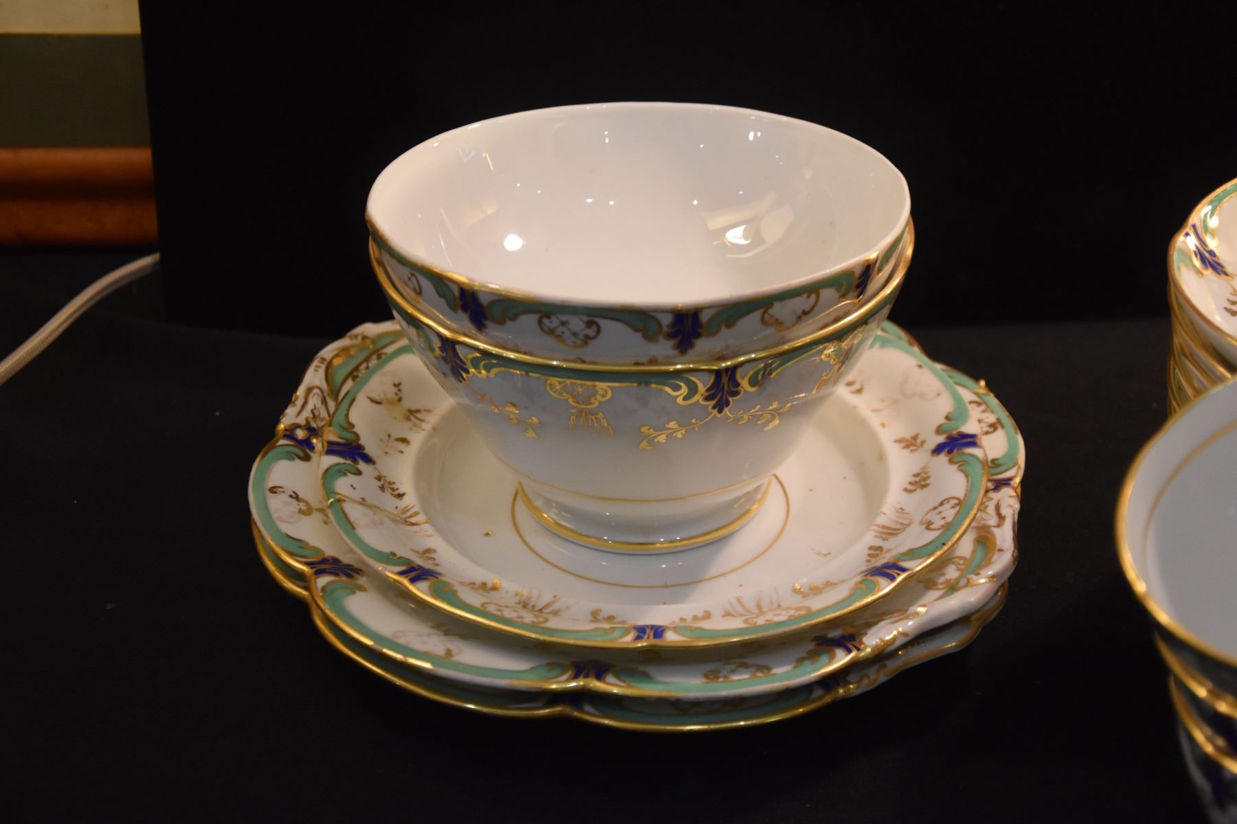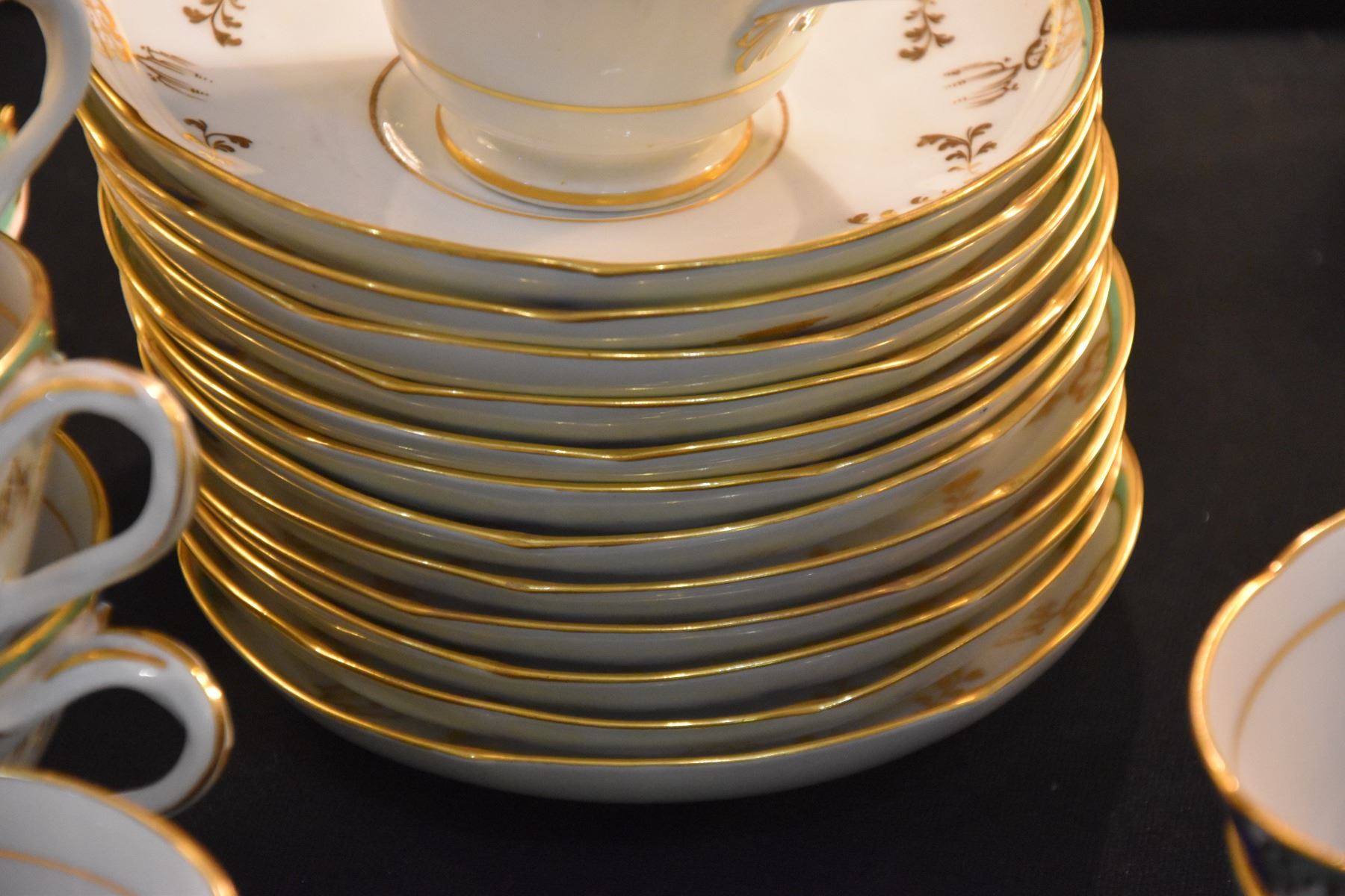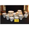 VINTAGE HAND PAINTED EUROPEAN PORCELAIN TABLEWARE: PLATES, SAUCERS, CUPS & SMALL PITCHER (30 PCS)