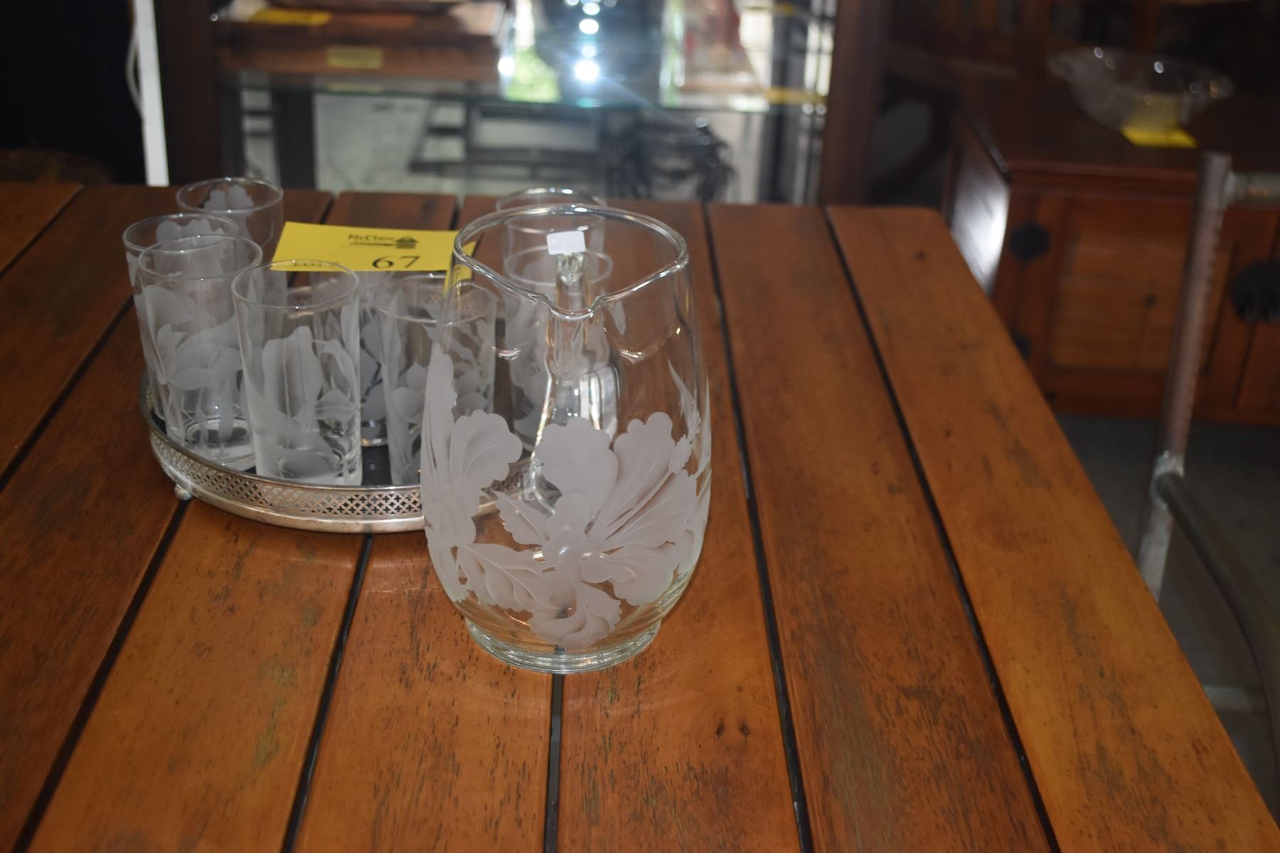 VINTAGE HAWAIIAN ETCHED GLASSES W/FLORAL MOTIF & ETCHED PITCHER W/HIBISCUS (9 PCS) (DOES NOT INCLUDE TRAY)