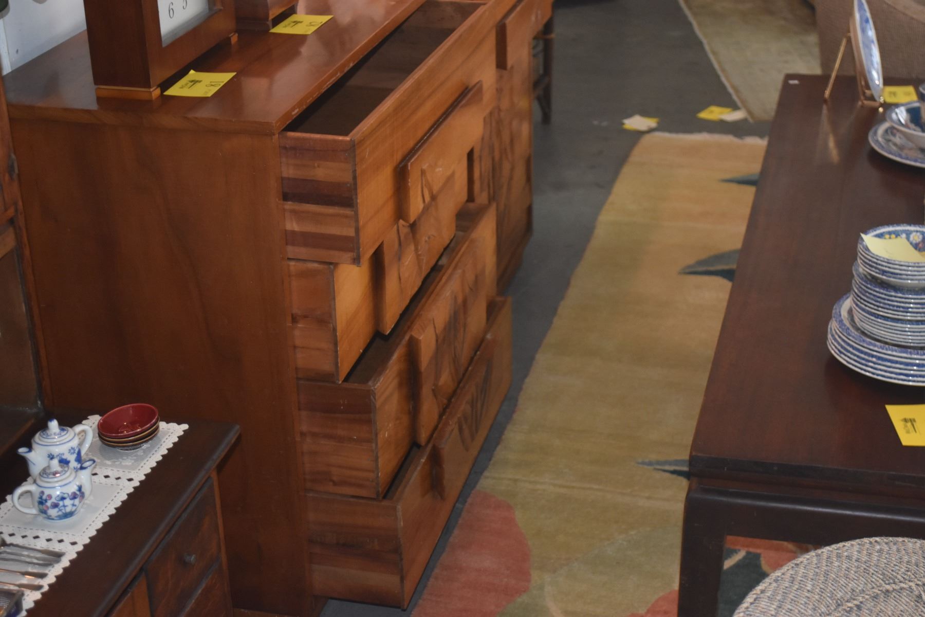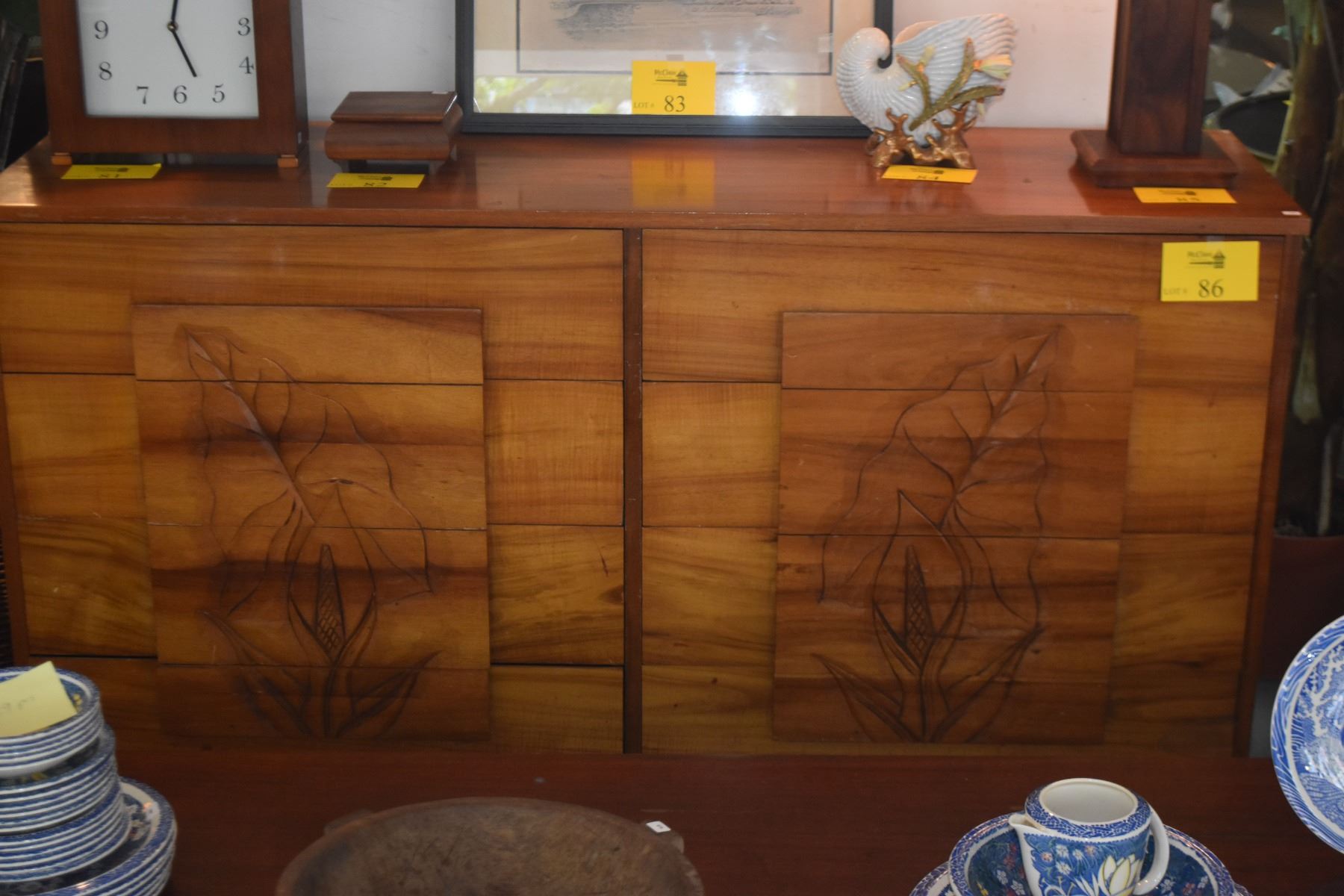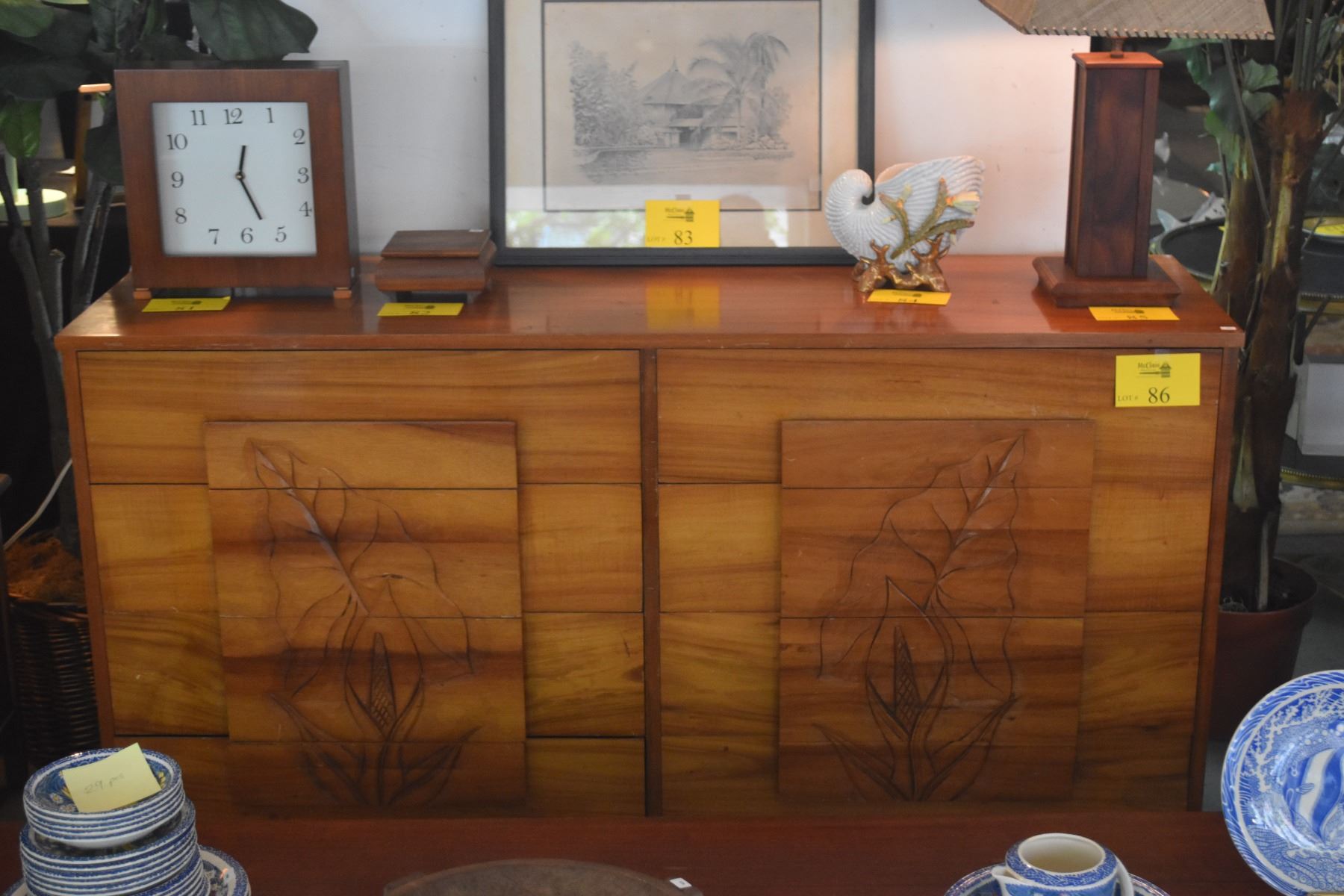 VINTAGE HAWAIIAN KOA 8 DRAWER DRESSER W/CARVED APE (TARO) FLOWERS (16" X 18" X 33")