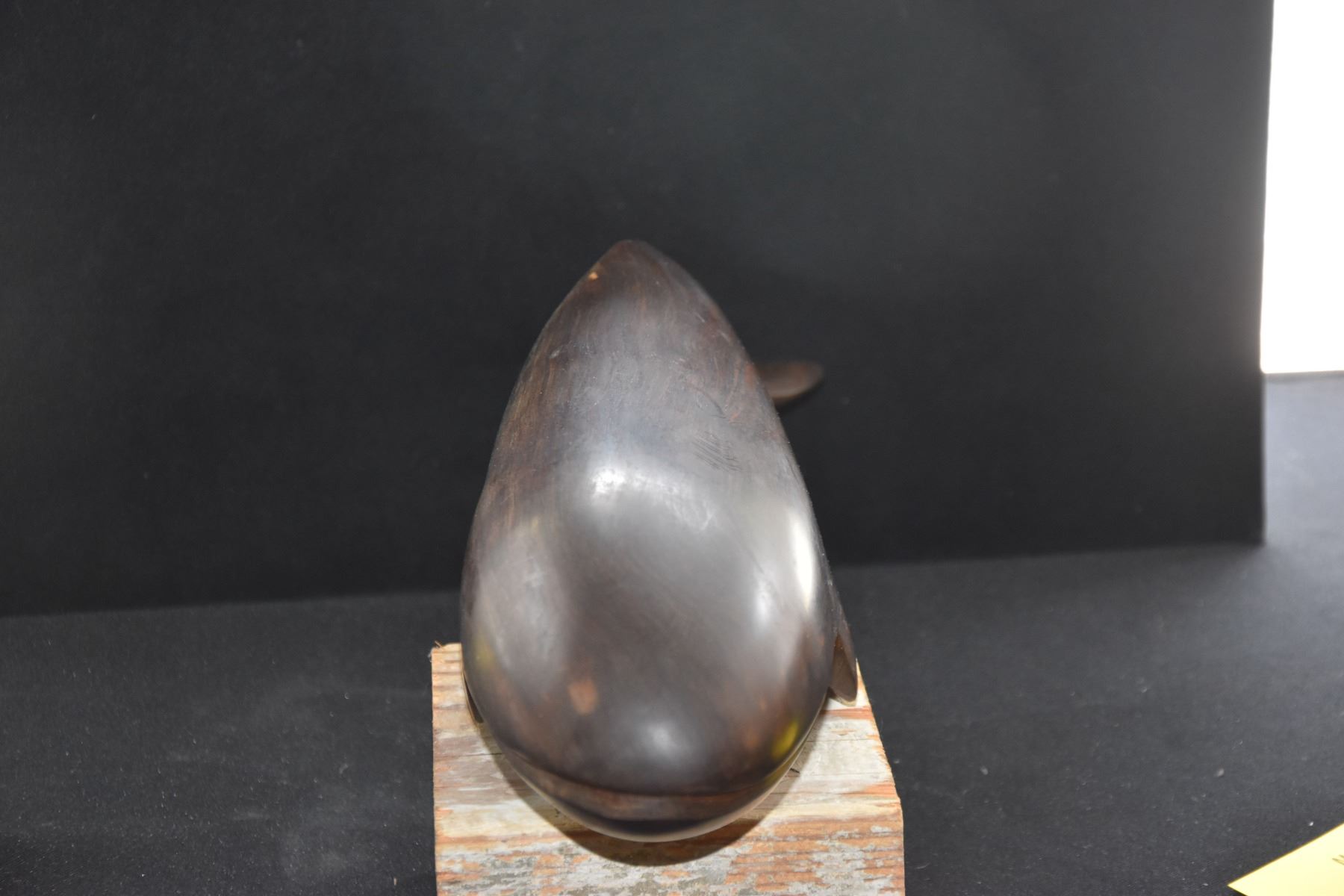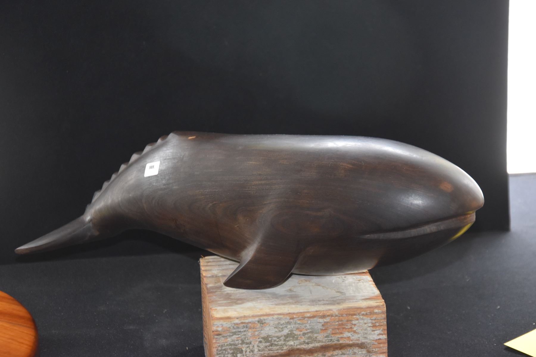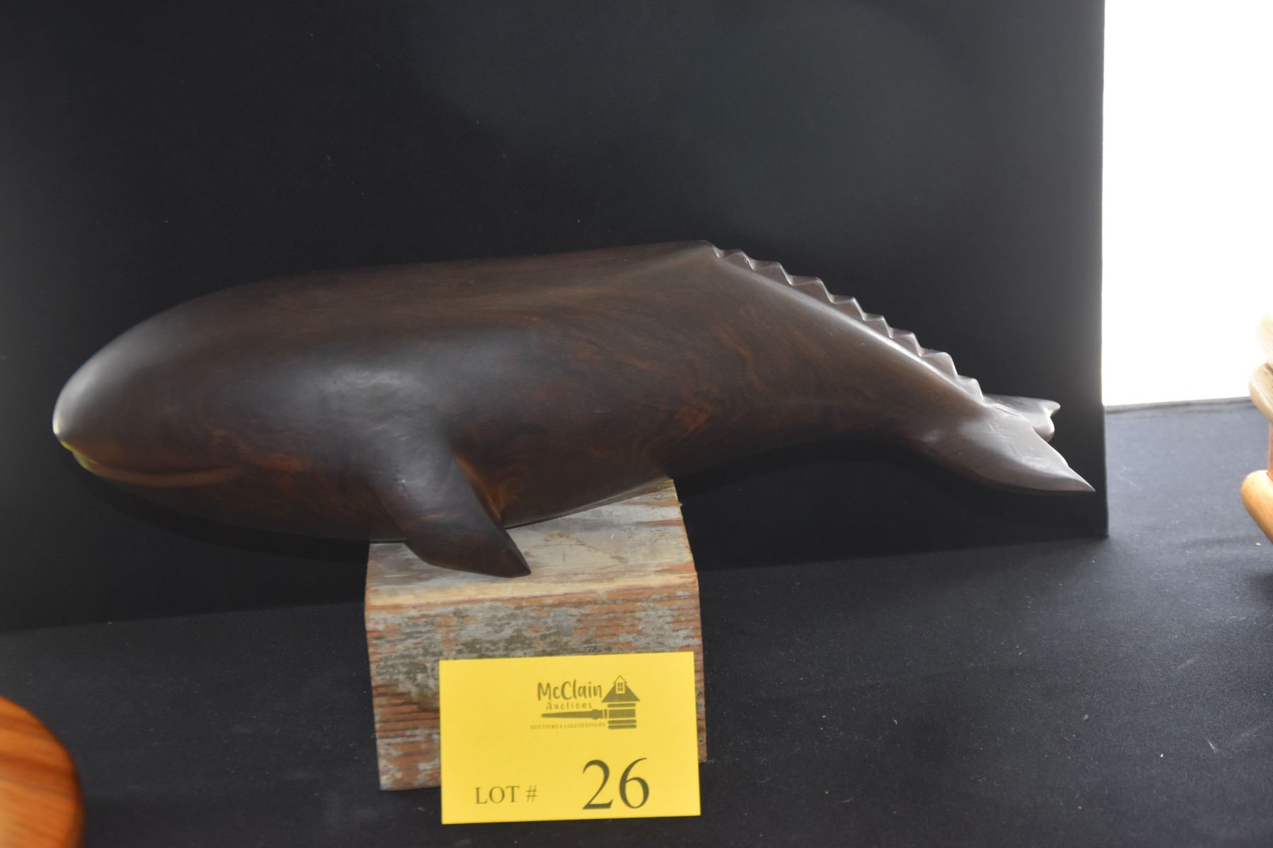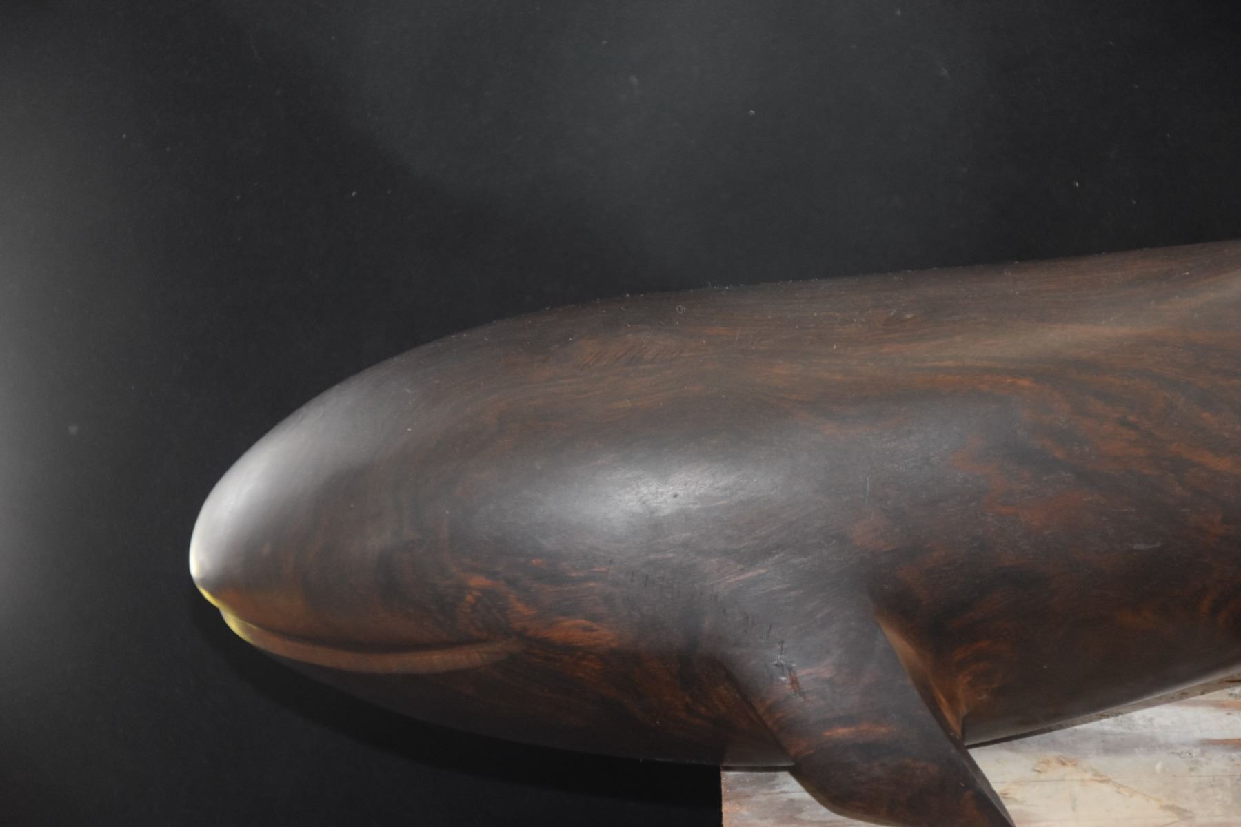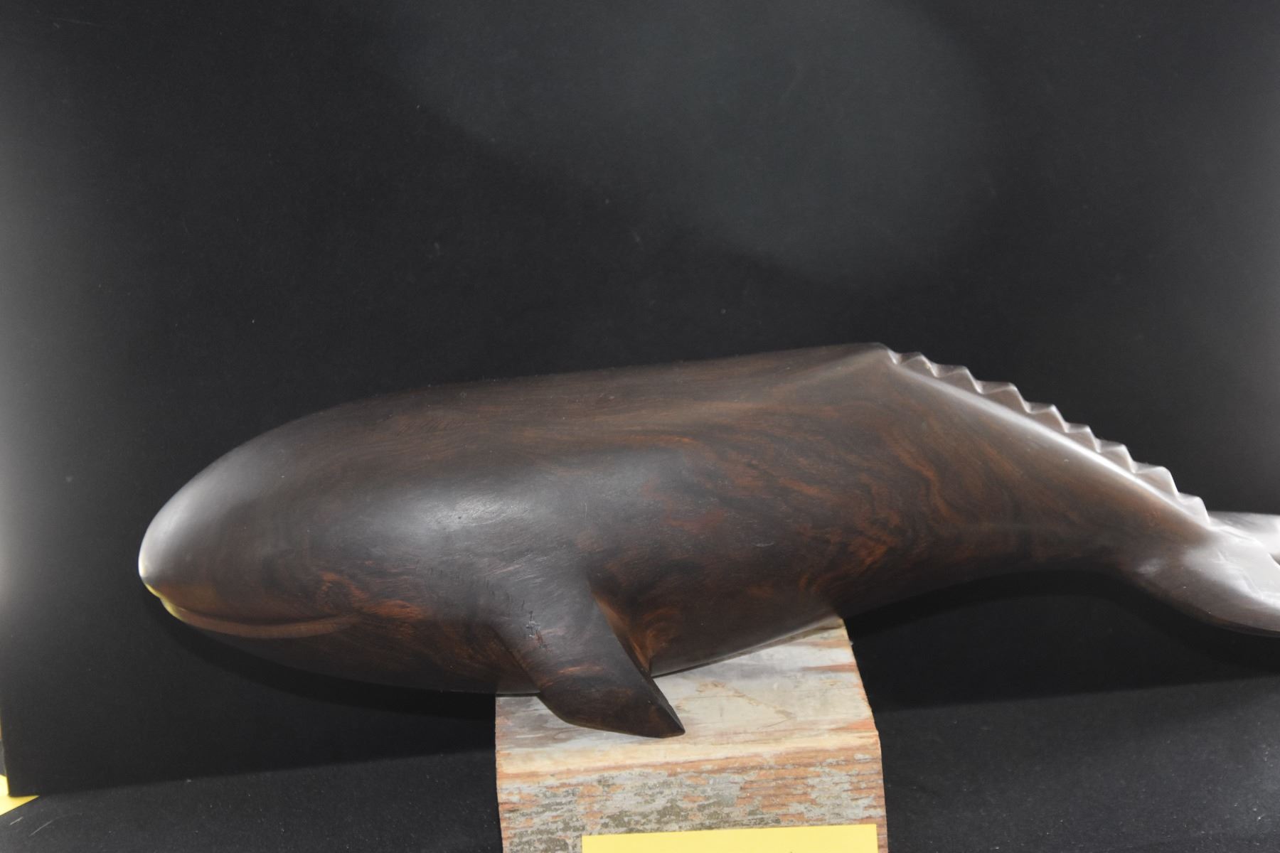 VINTAGE IRON WOOD WHALE SCULPTURE (17") (DOES NOT INCLUDE STAND)