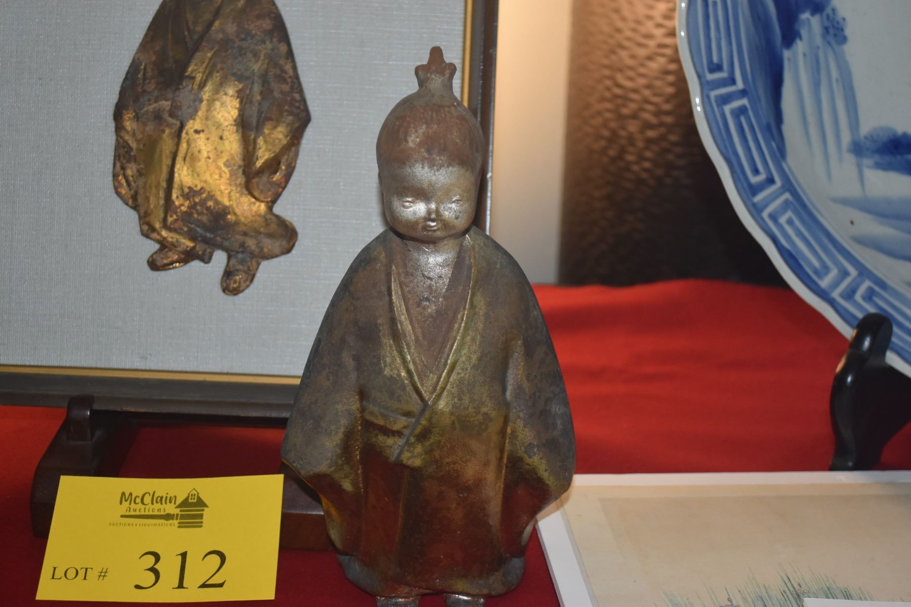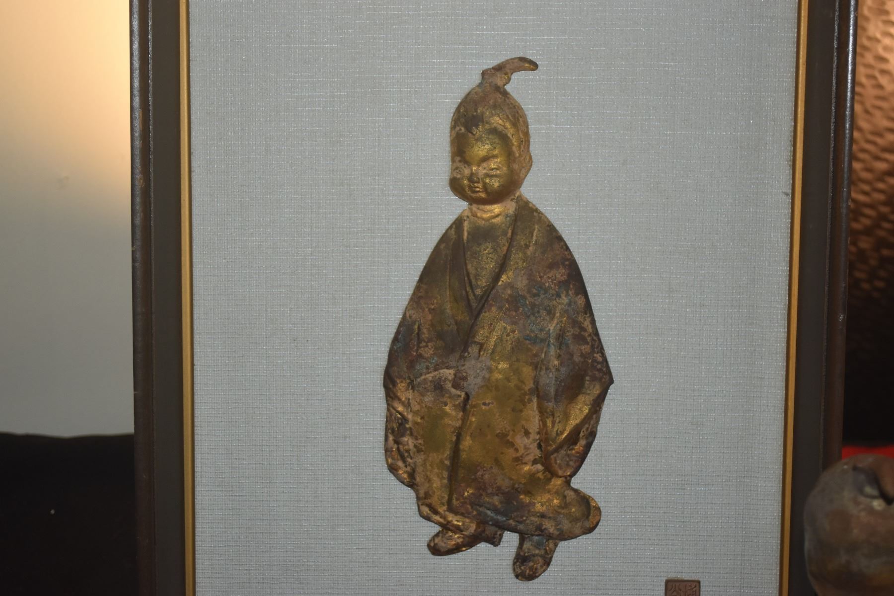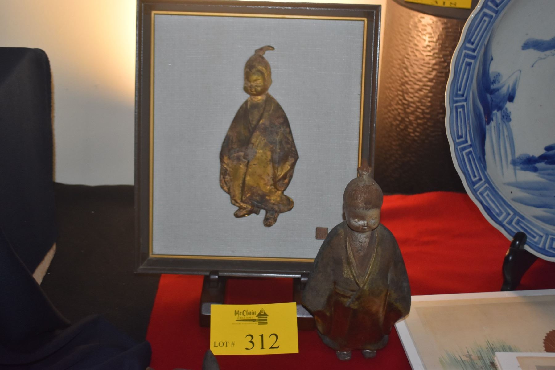 VINTAGE JAPANESE GILT STATUE OKIMONO OF SELFLESSNESS CHILD & FRAMED ART (2 PCS)