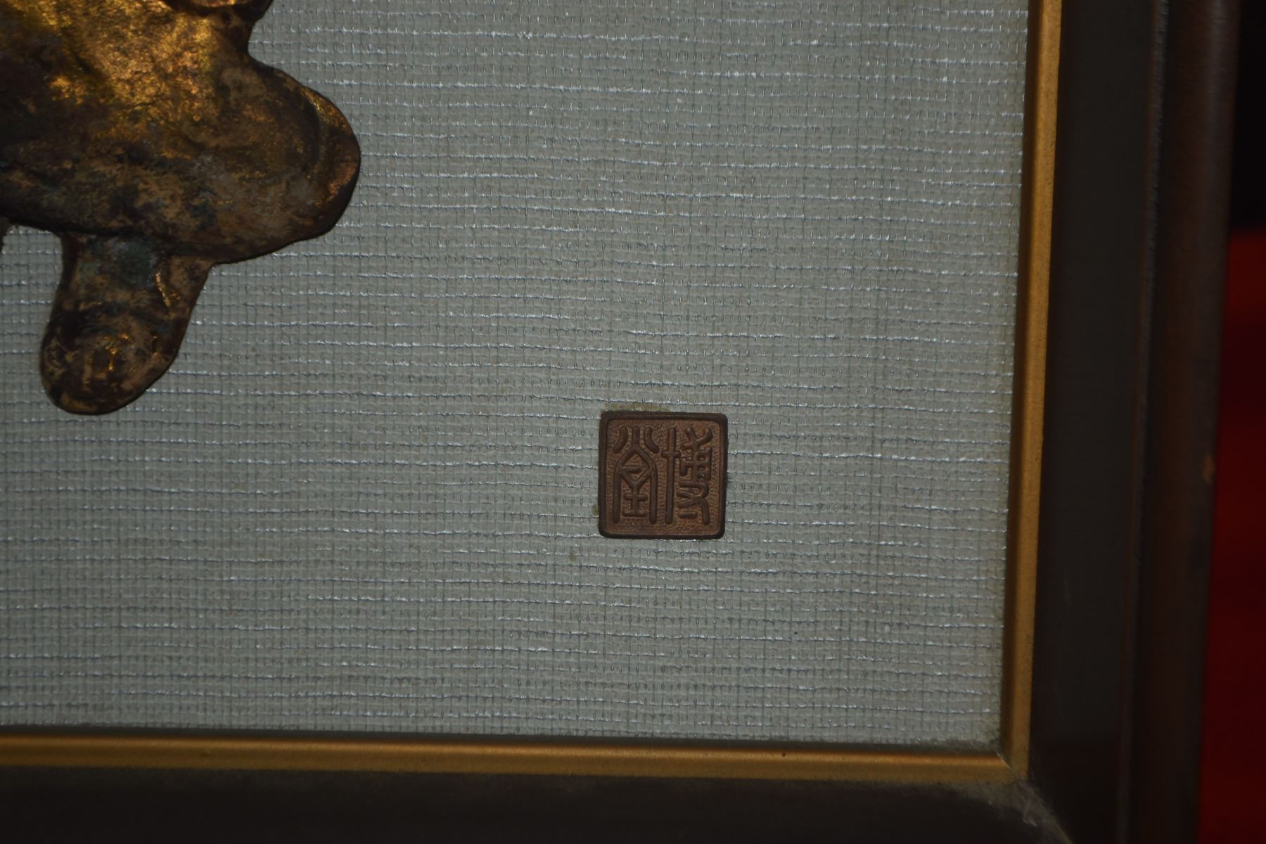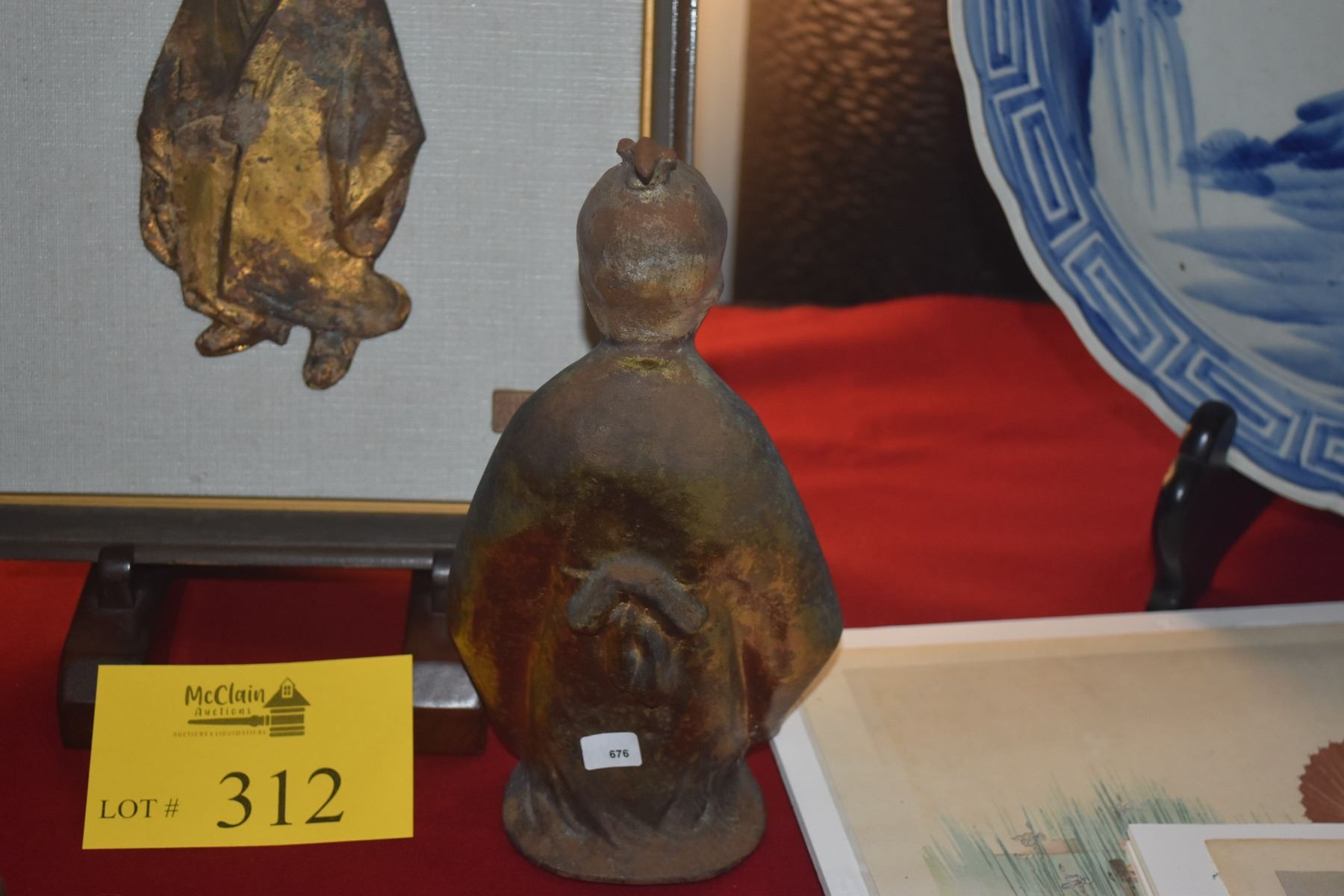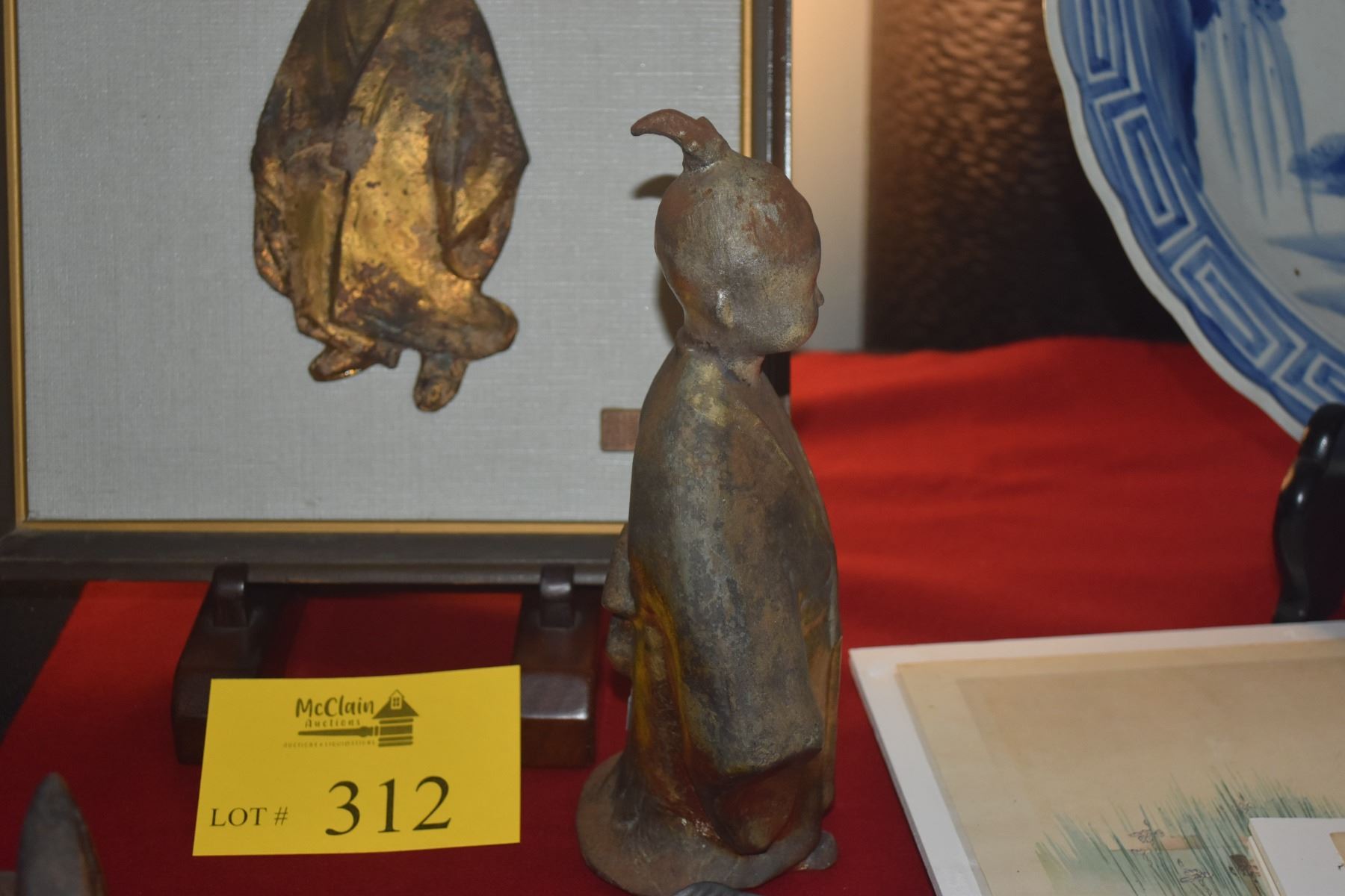 VINTAGE JAPANESE GILT STATUE OKIMONO OF SELFLESSNESS CHILD & FRAMED ART (2 PCS)