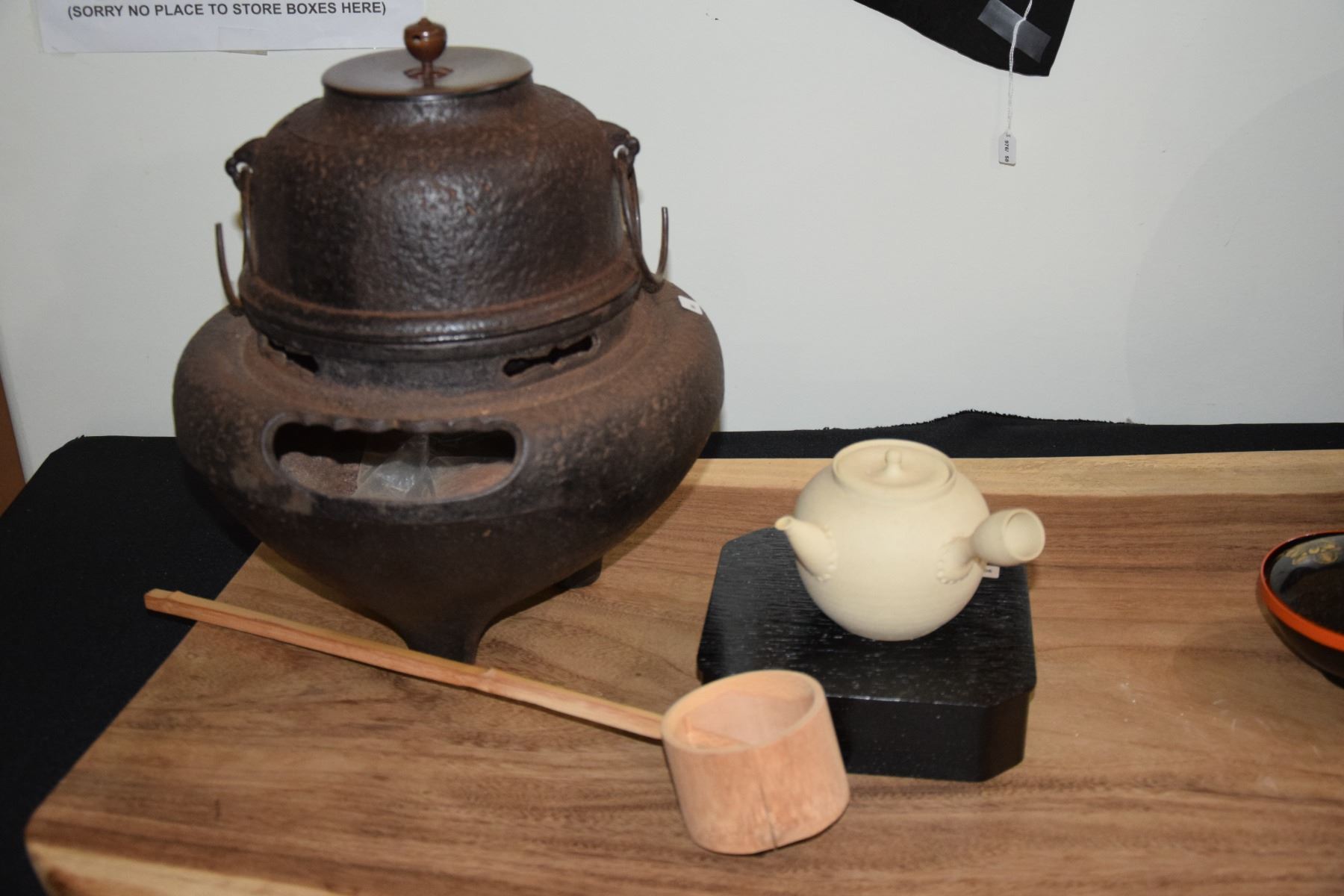 VINTAGE JAPANESE IRON CHAGAMA KETTLE (FOR TEA CEREMONY), WOOD LADLE & TEAPOT W/STAND