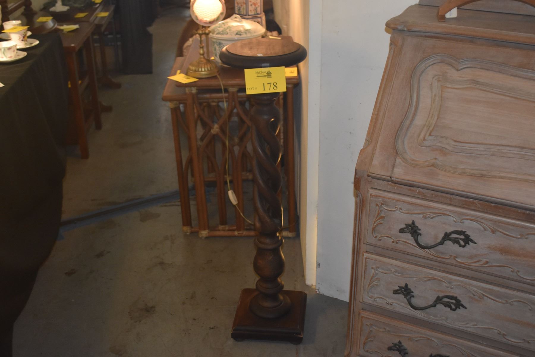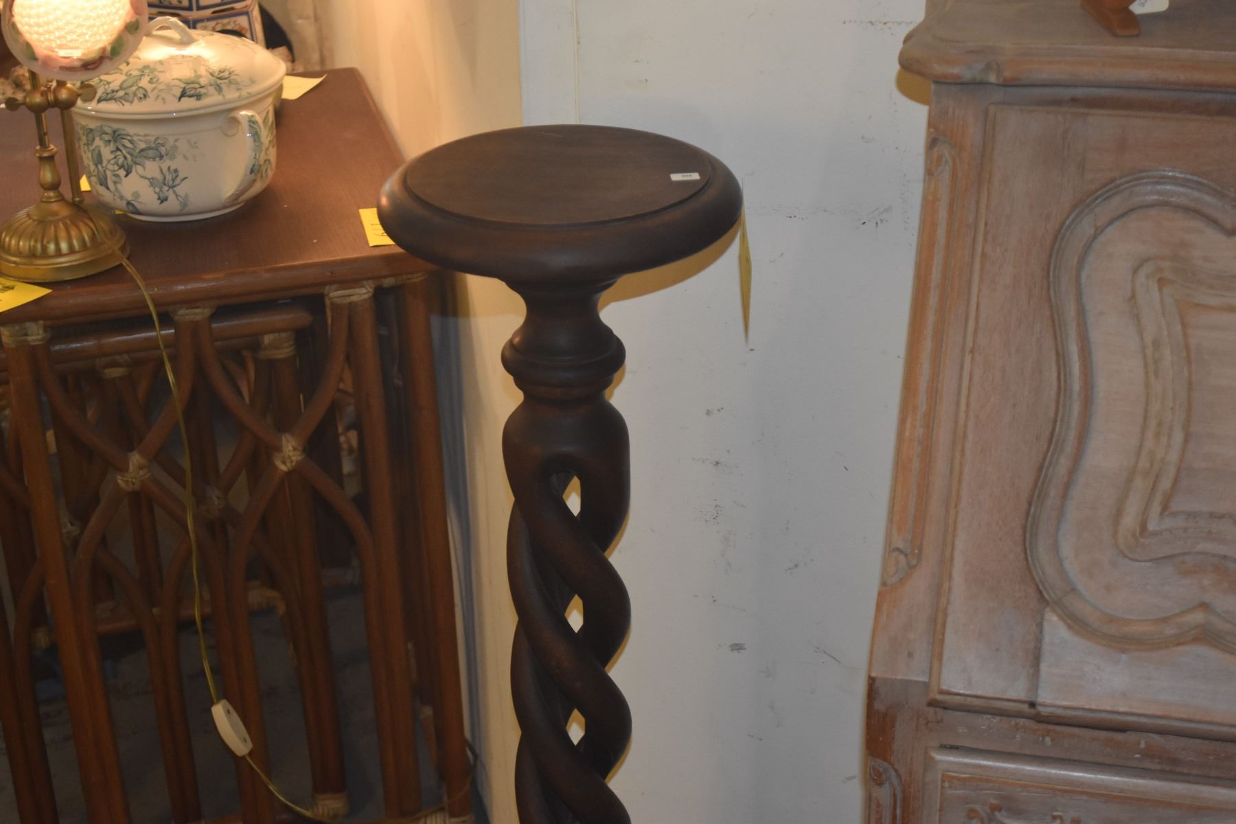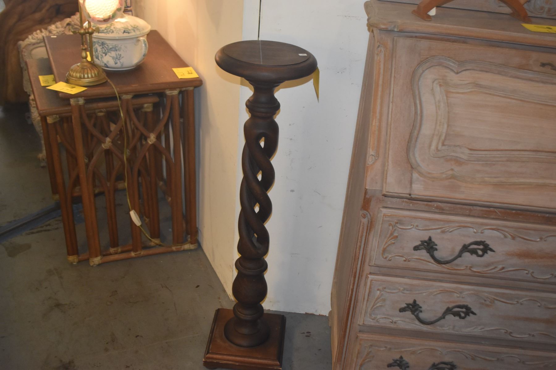 VINTAGE WALNUT OPEN BARLEY TWIST PEDESTAL PLANT STAND