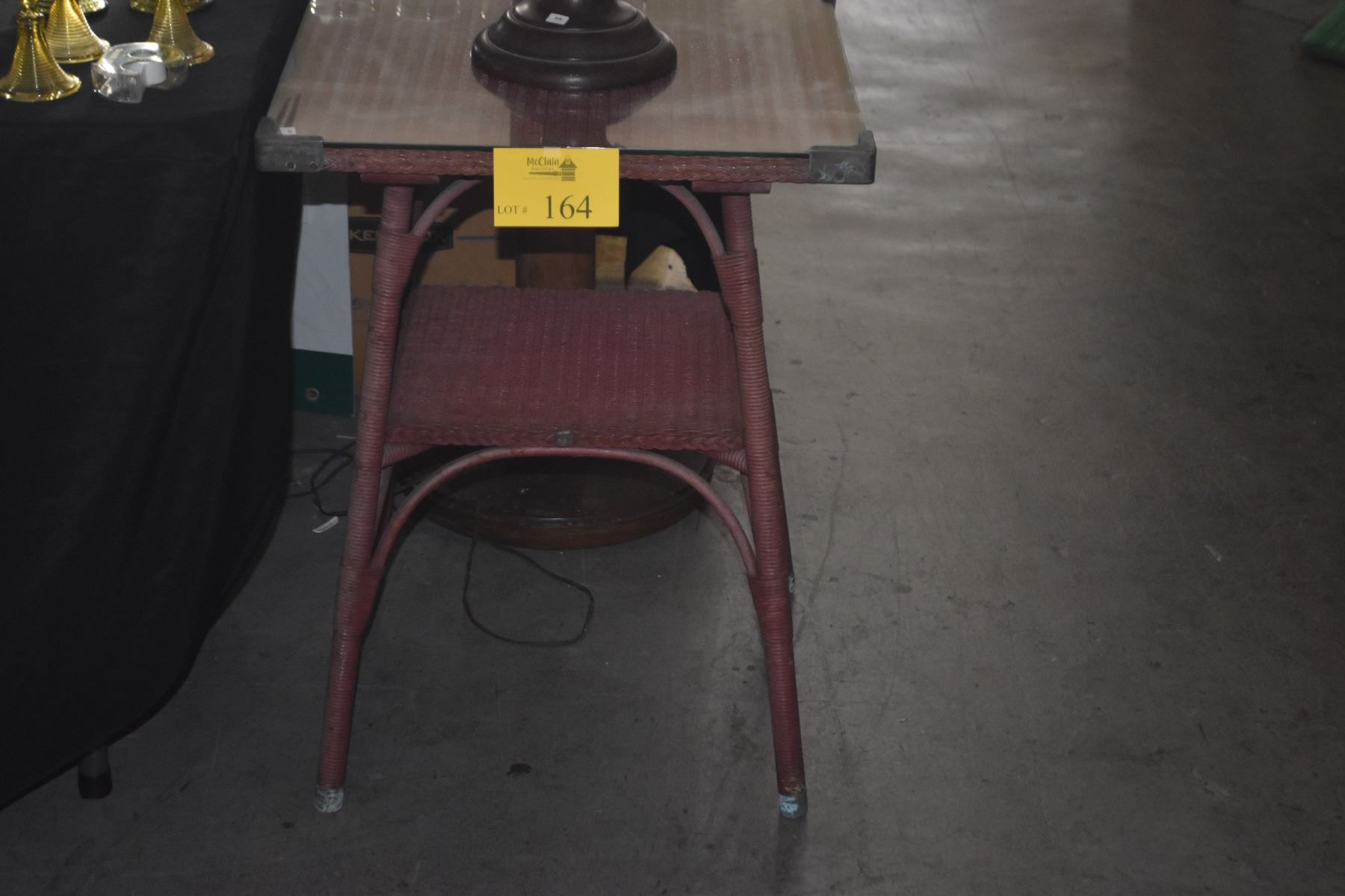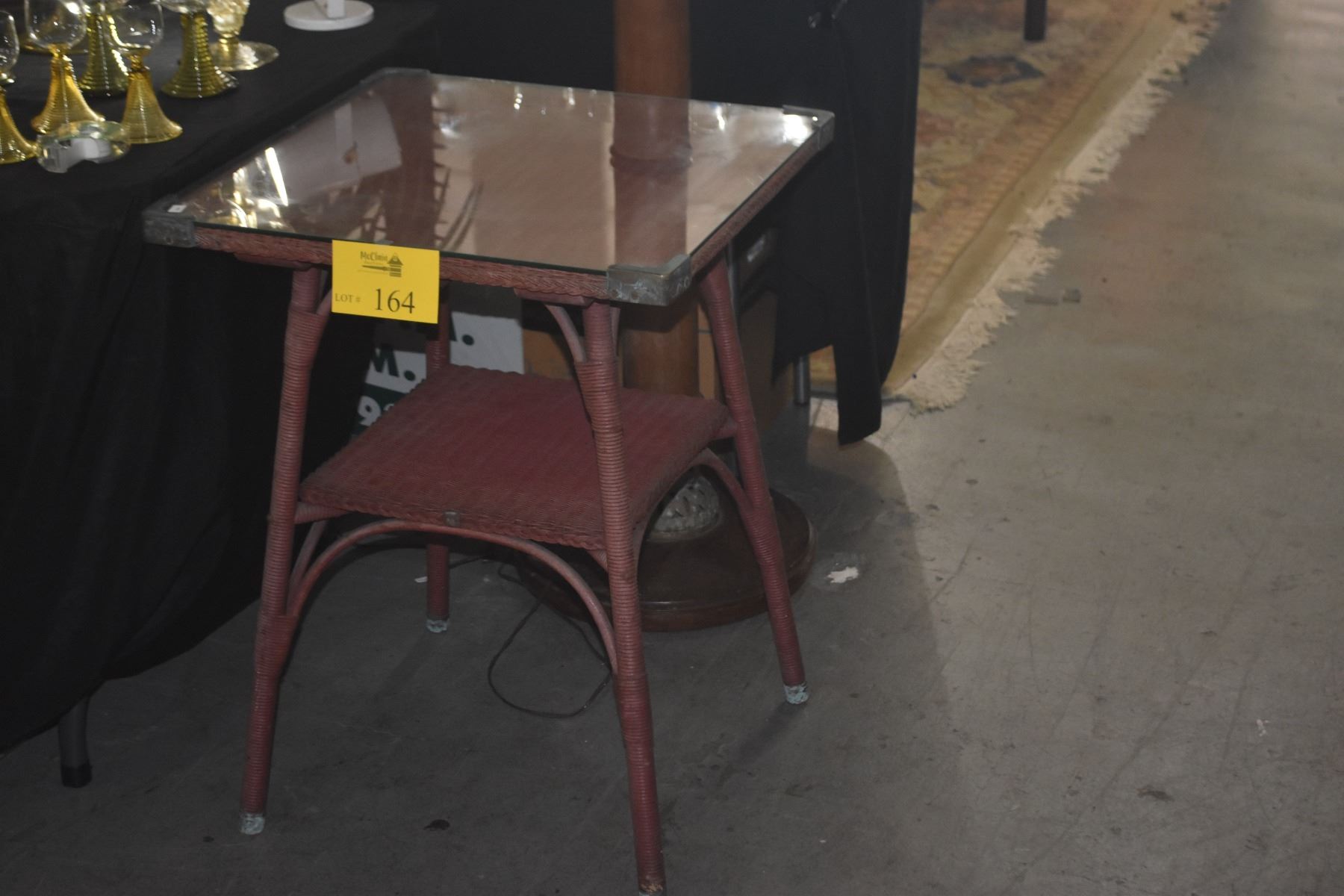 VINTAGE WICKER TABLE W/GLASS TOP (21" X 21" X 28")