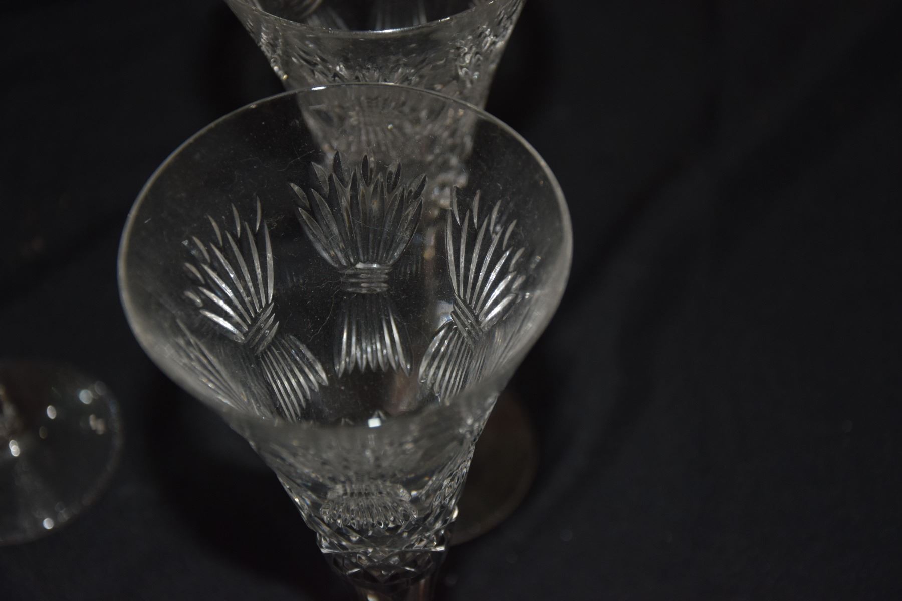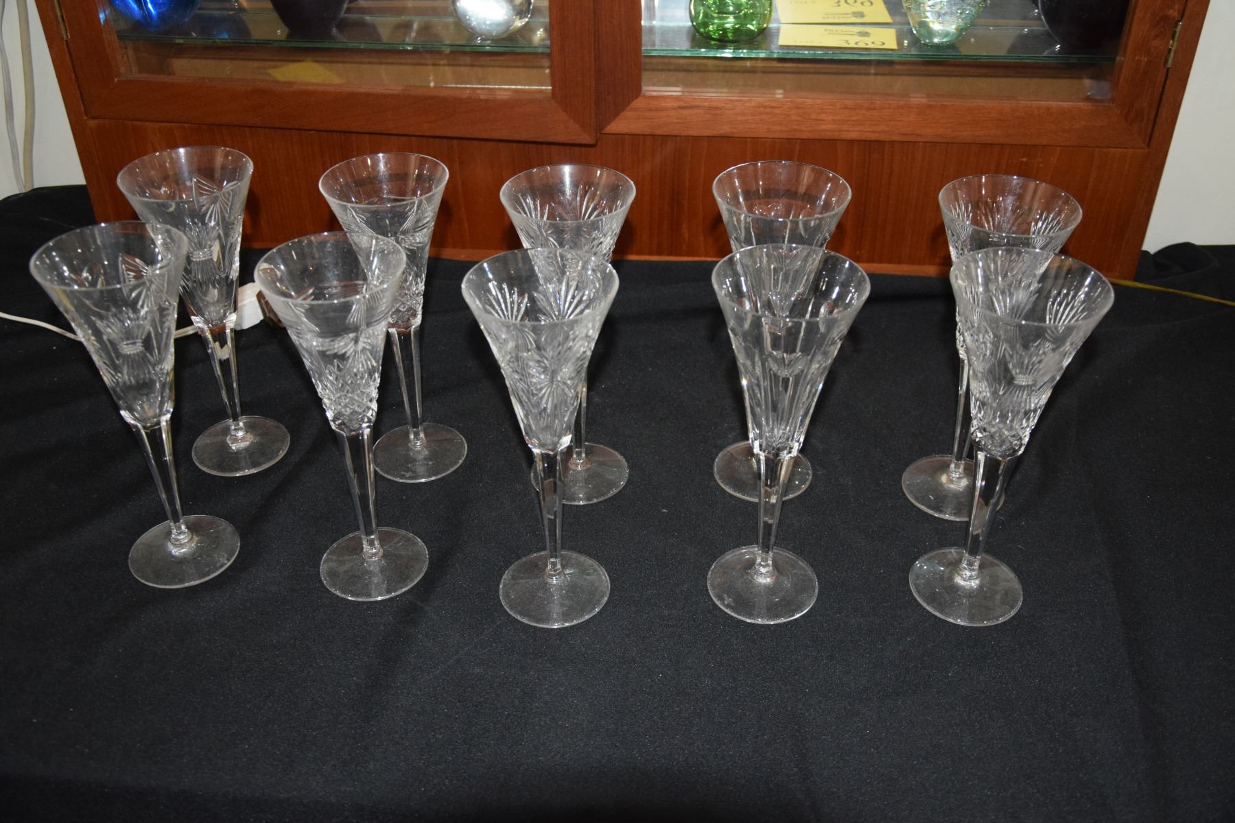 WATERFORD CRYSTAL CHAMPAGNE FLUTES, MILLENNIUM SERIES: LOVE, PEACE, PROSPERITY & UNIVERSAL WISHES (10 PC) (1 SMALL CHIP)