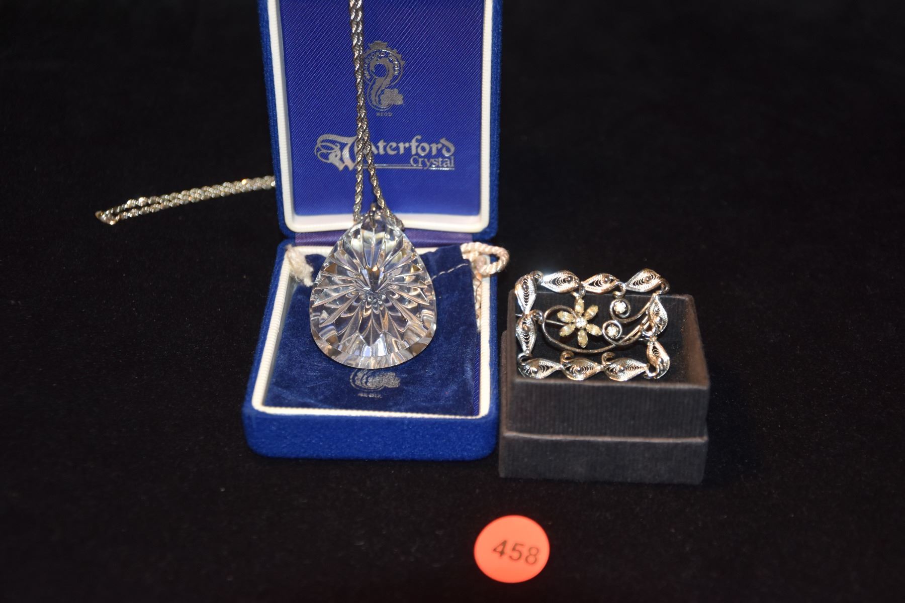 WATERFORD CRYSTAL PENDANT ON STERLING SILVER CHAIN & STERLING SILVER PIN (3 PCS)