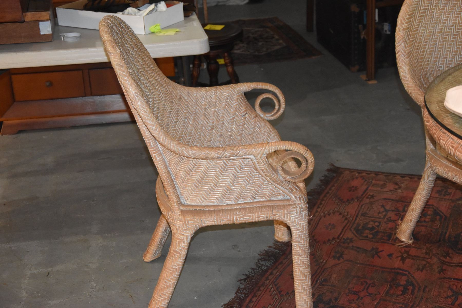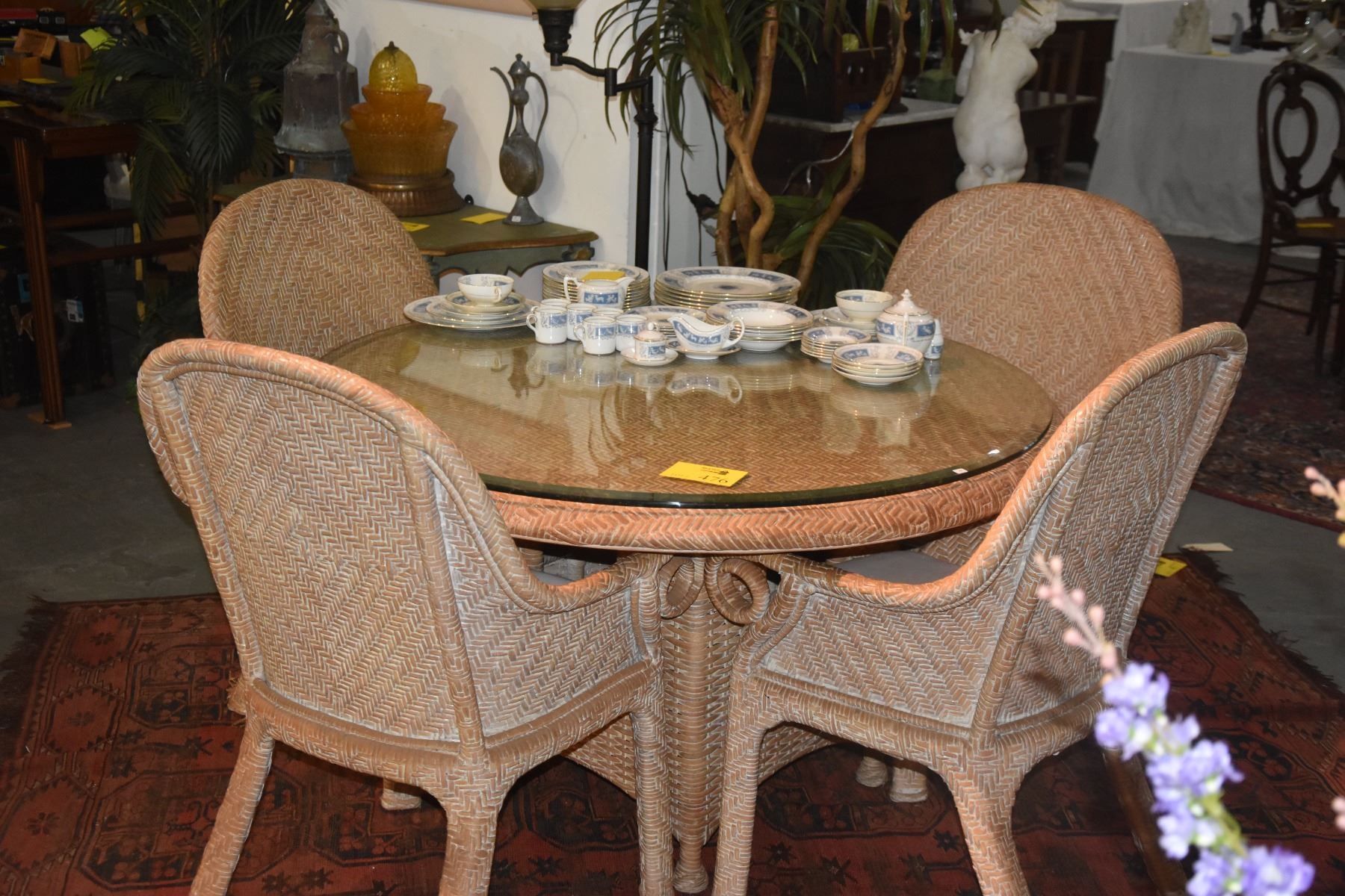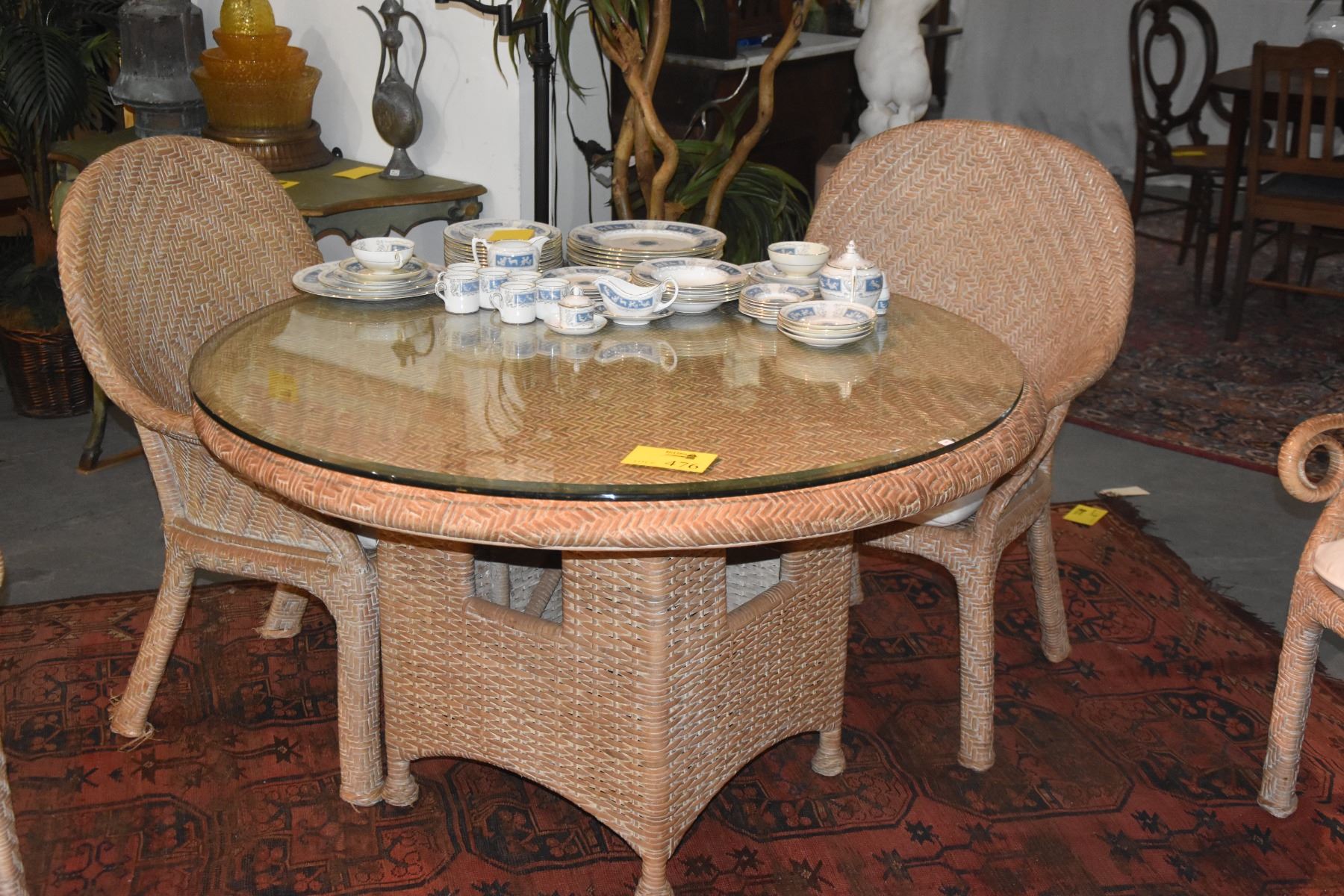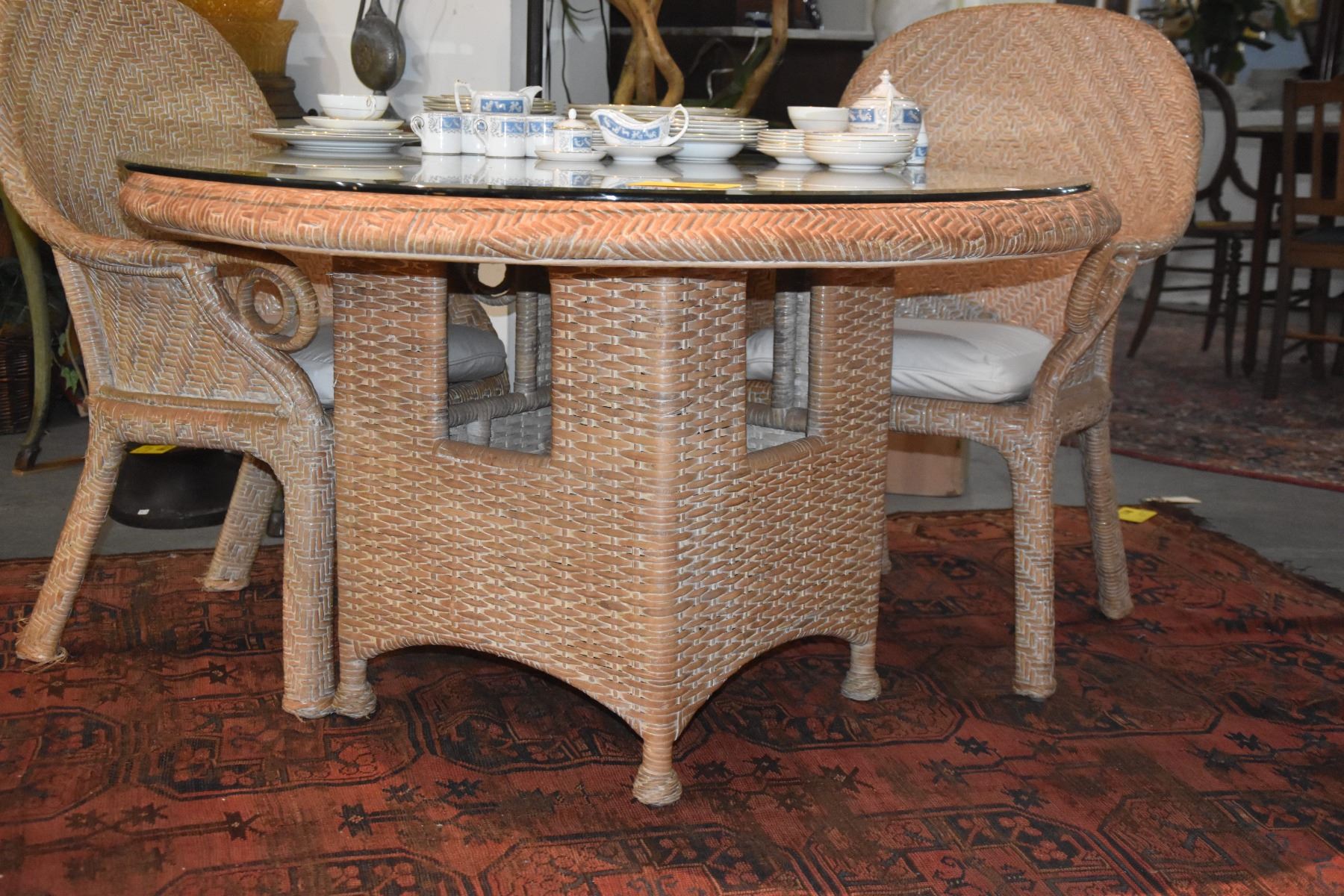 WHITE WASH WICKER TABLE W/GLASS TOP (48") & 4 CAPTAINS CHAIRS W/SUNBRELLA COVERED CUSHIONS (6 PCS)