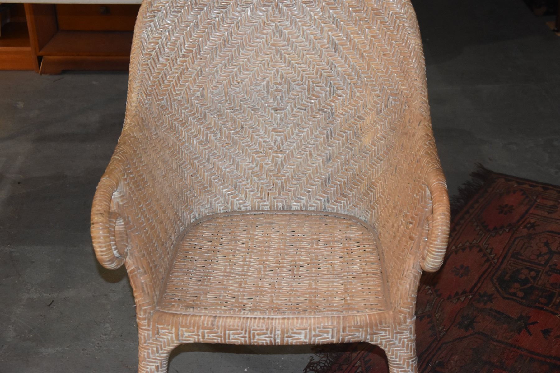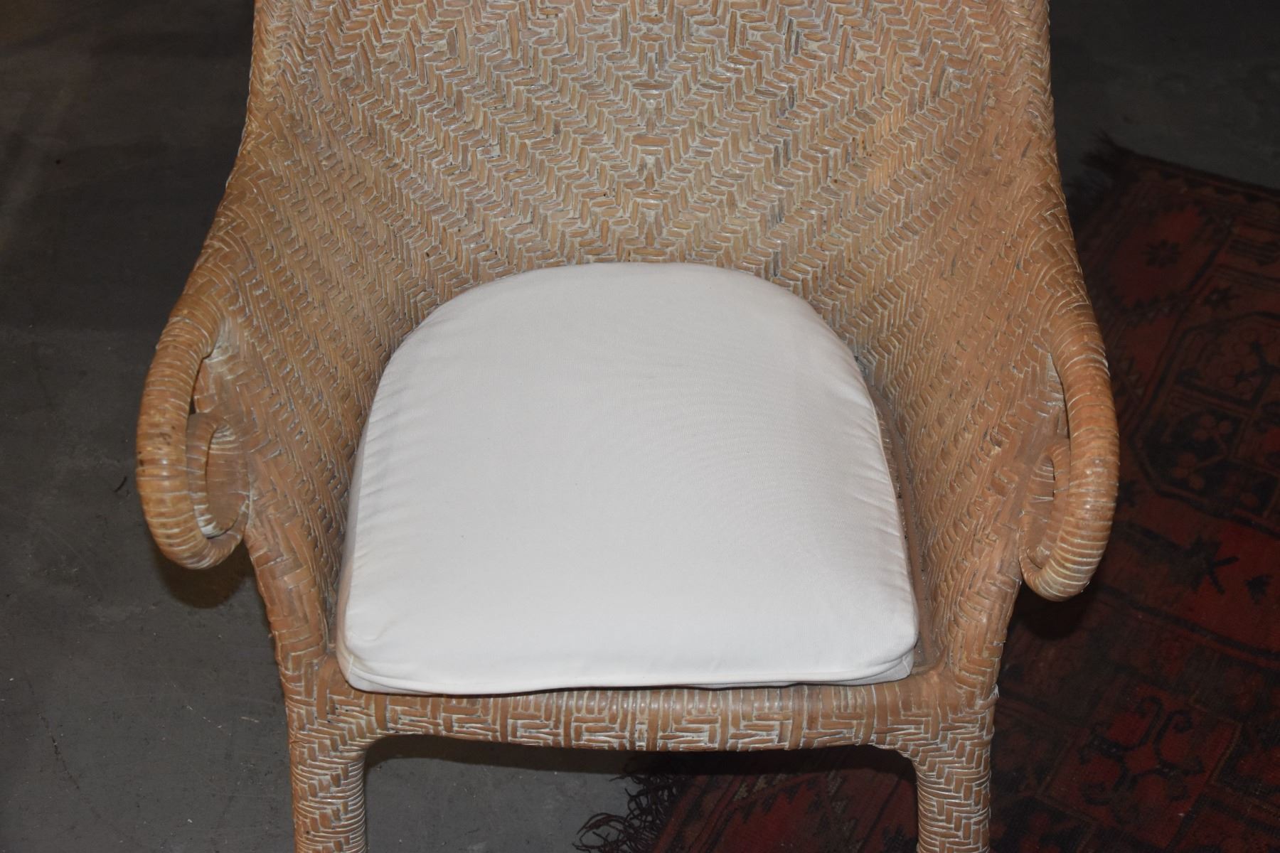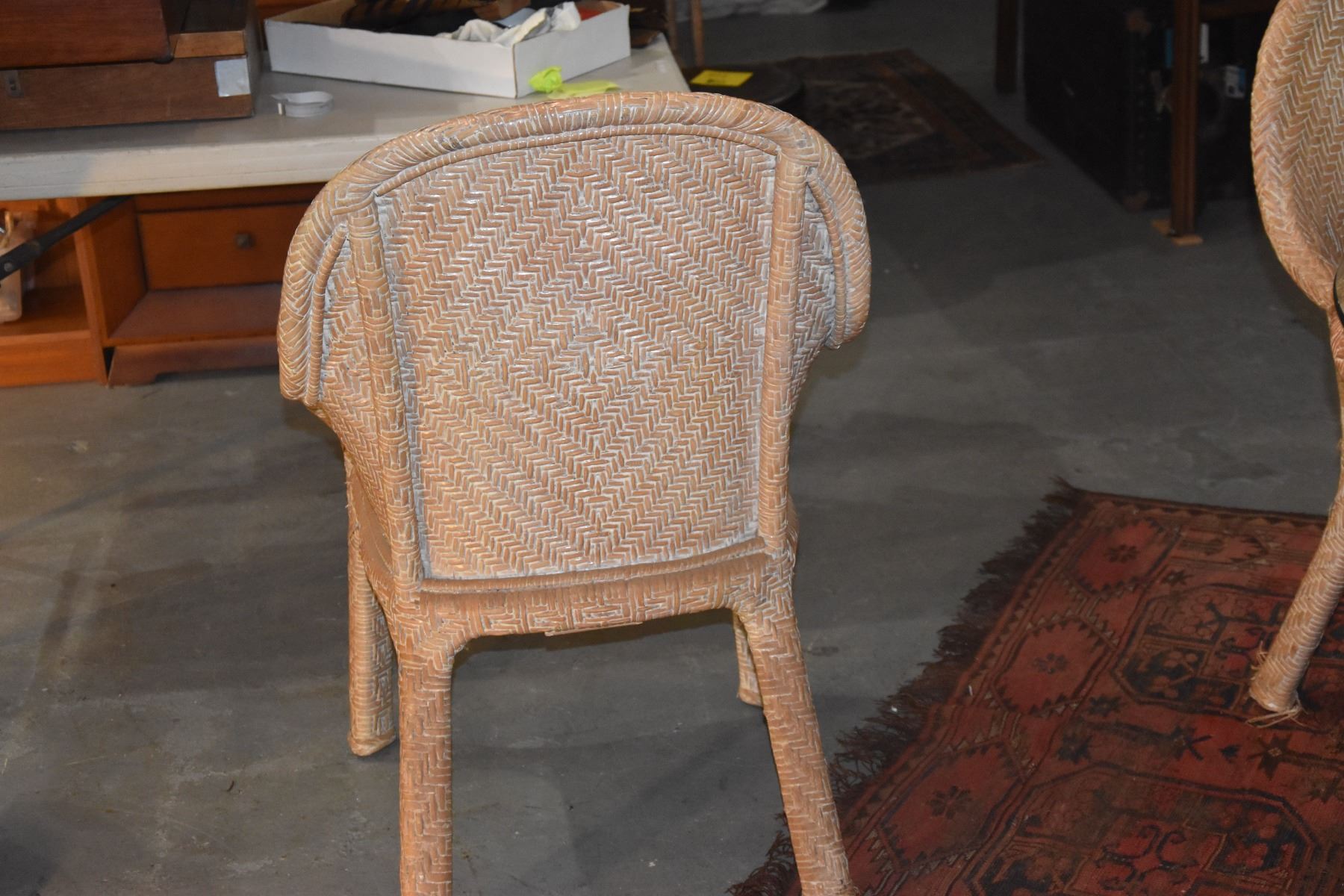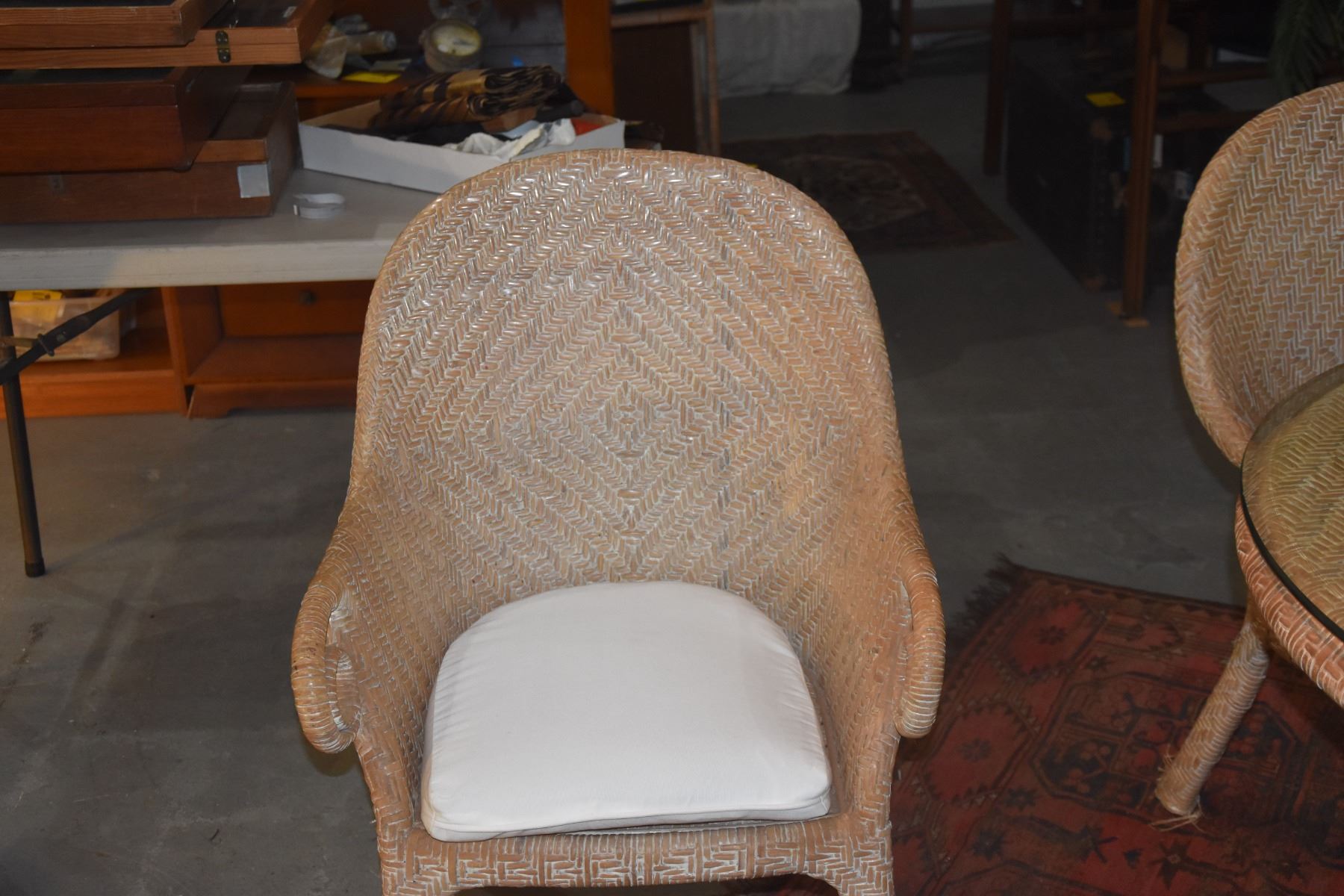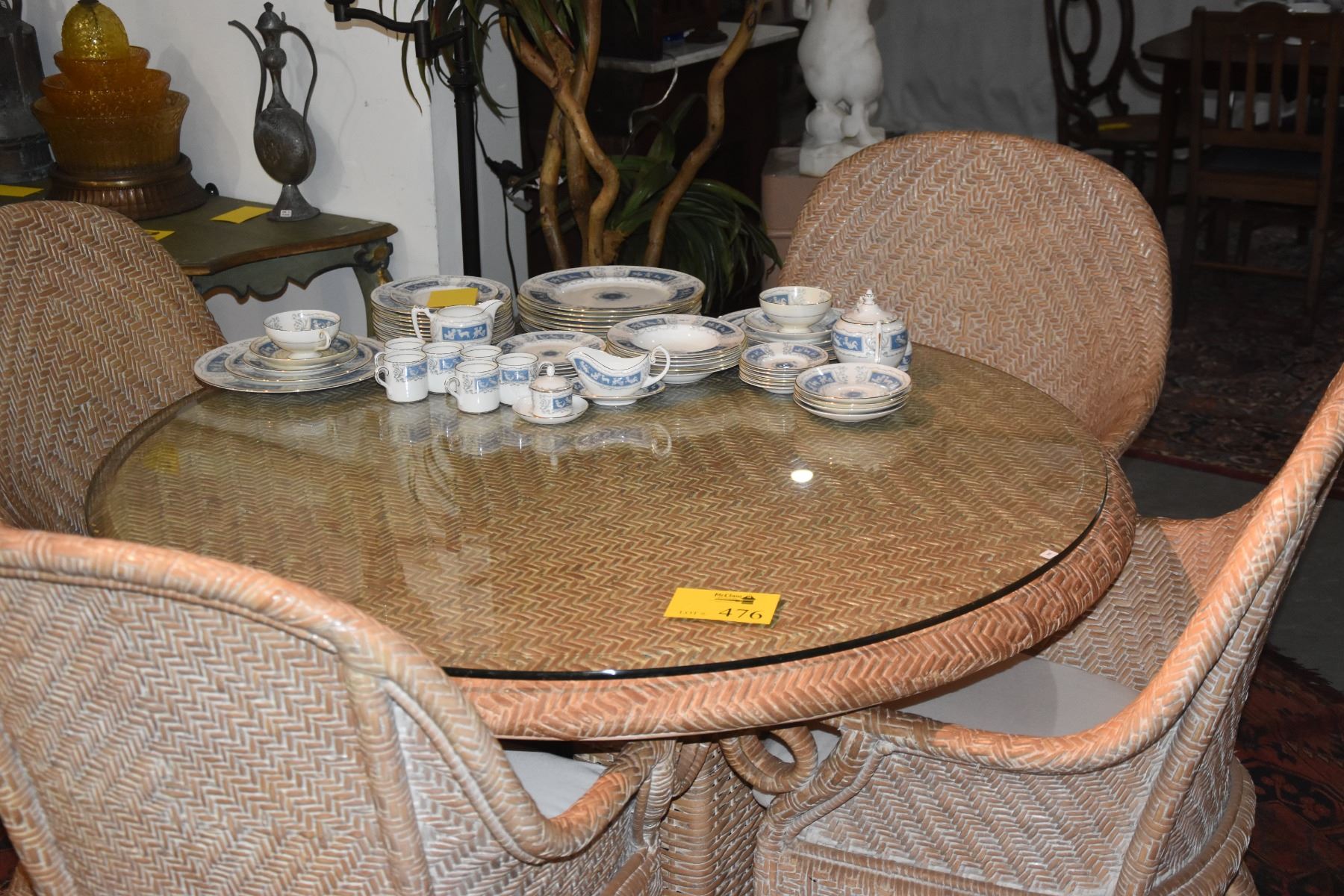 WHITE WASH WICKER TABLE W/GLASS TOP (48") & 4 CAPTAINS CHAIRS W/SUNBRELLA COVERED CUSHIONS (6 PCS)