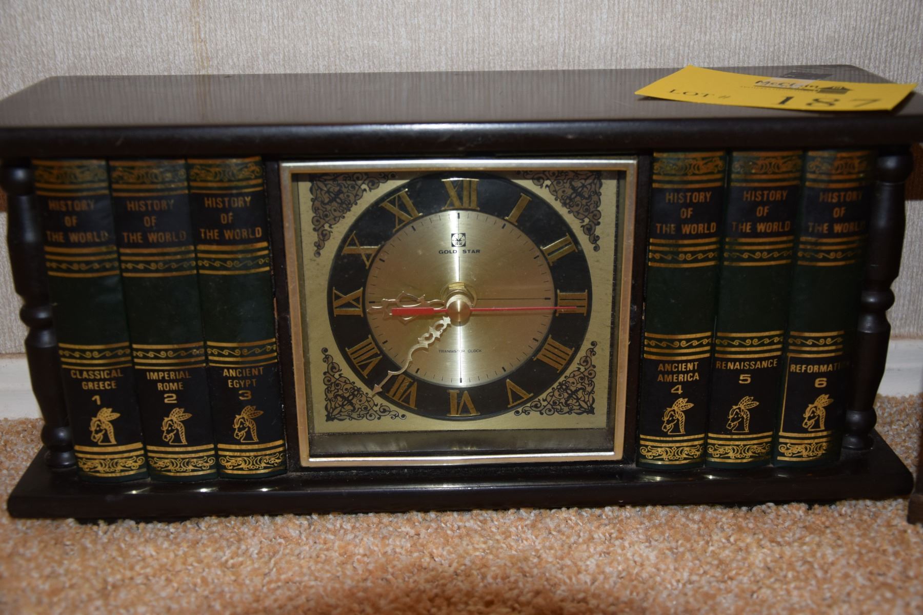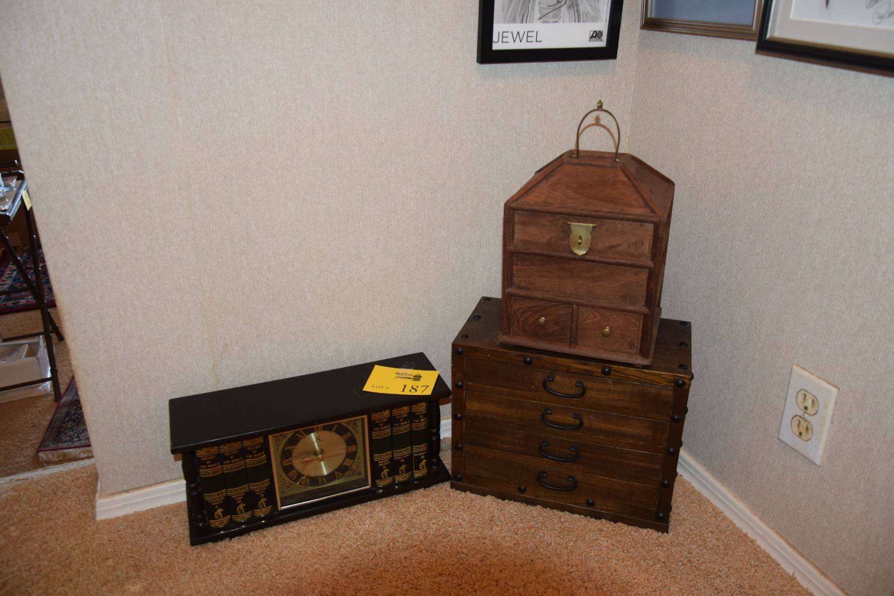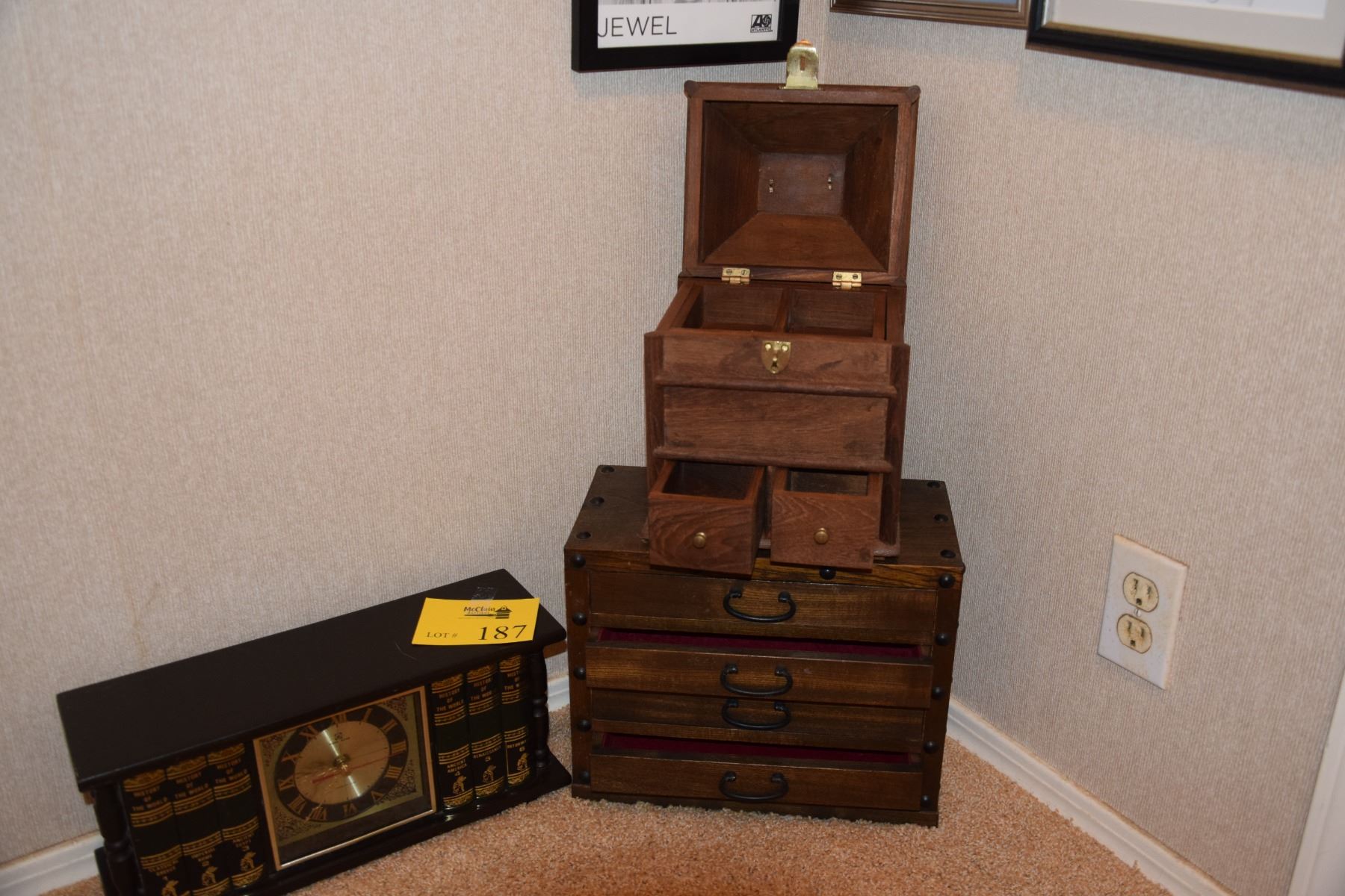 WOOD JEWELRY BOXES (13" X 6 14" X 10 1/2" H & 8 1/4" X 8" X 14"H) & "HISTORY OF THE WORLD" CLOCK (15 1/2" X 7" X 5" H) (3 PCS)