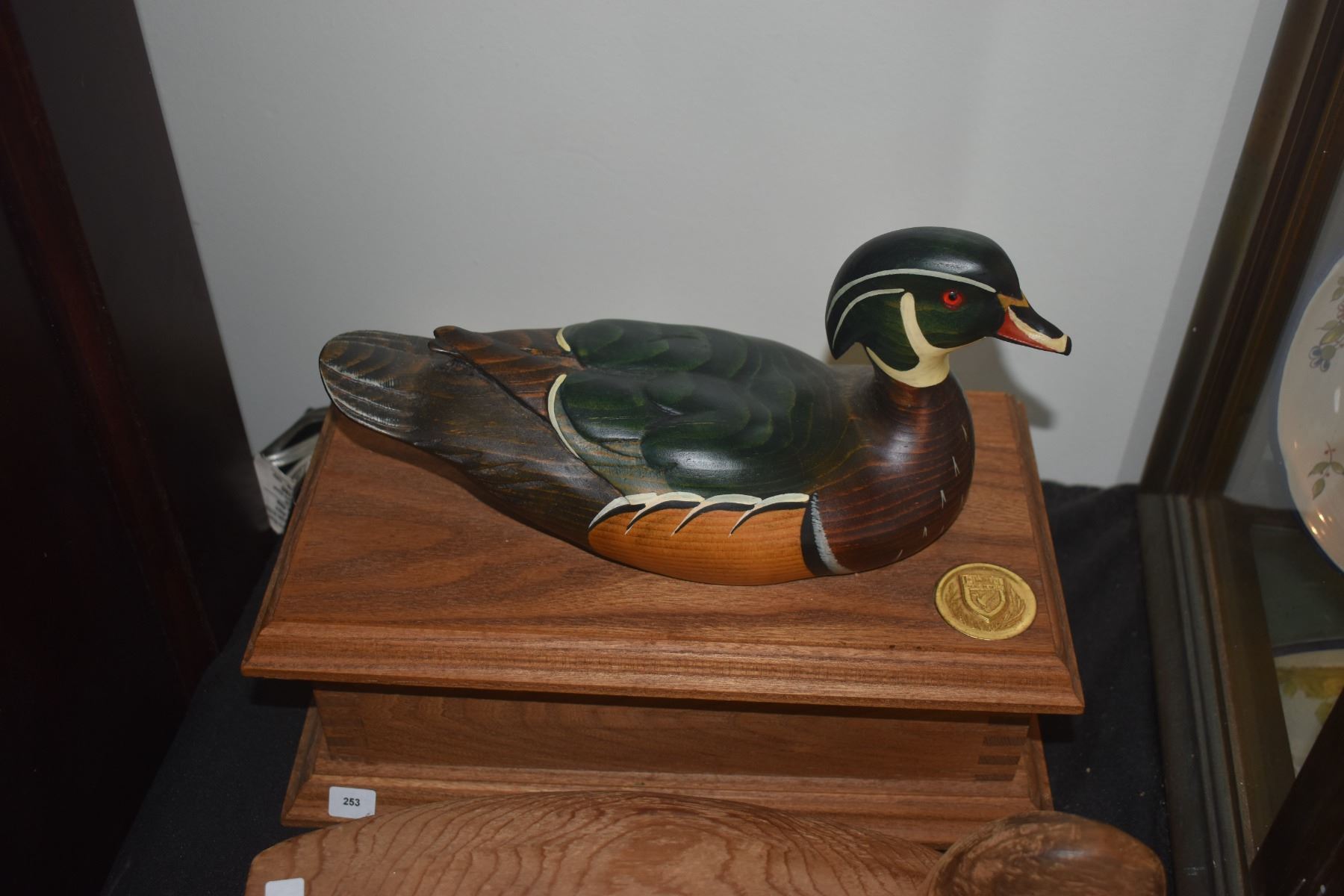 WOODEN DUCK DECOYS & BOX W/DUCK MOTIF (4 PCS)