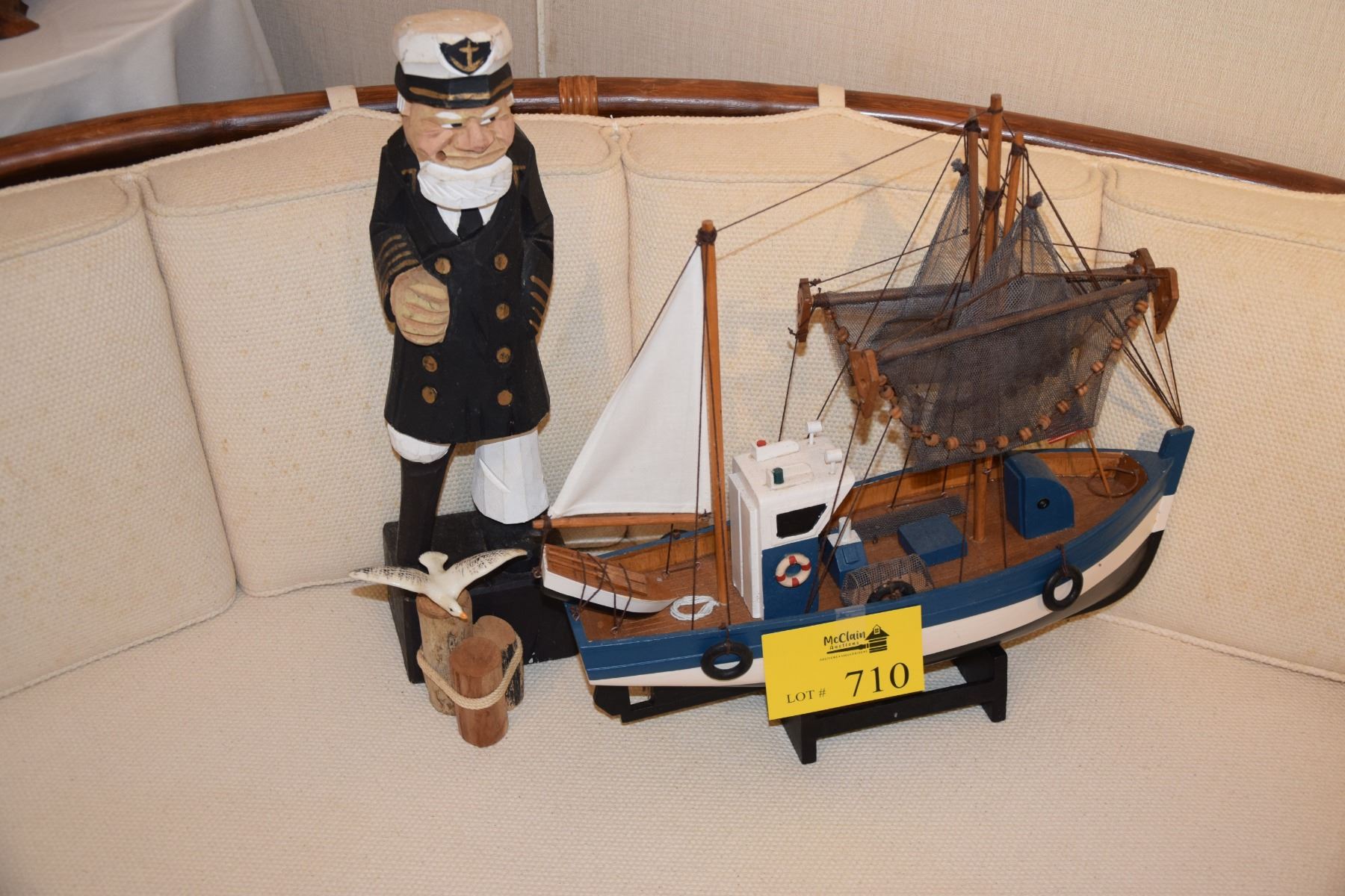 WOODEN PEG LEG "OLD SALTY" FIGURE, WOODEN BOAT & GLASS SEAGULL (3 PCS)